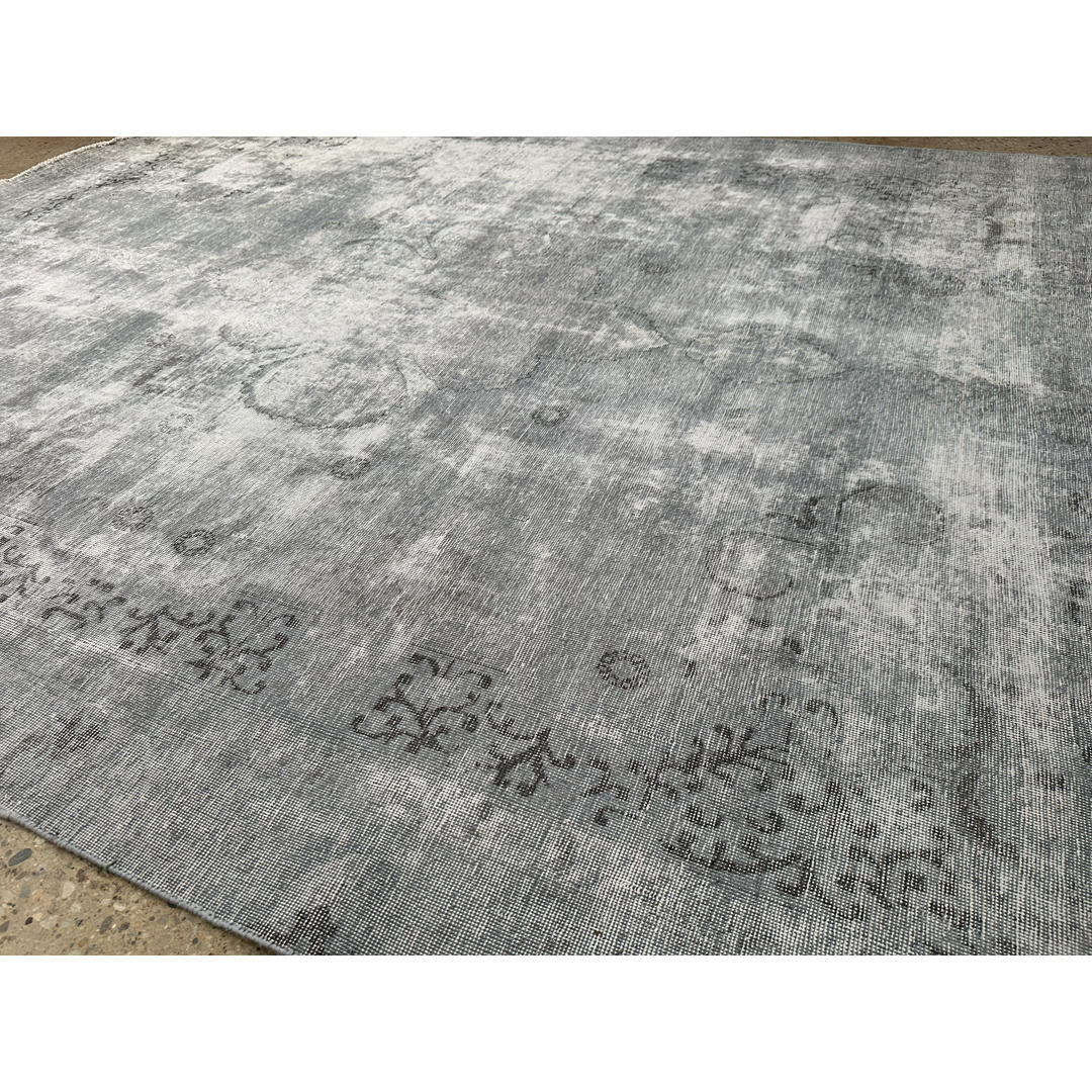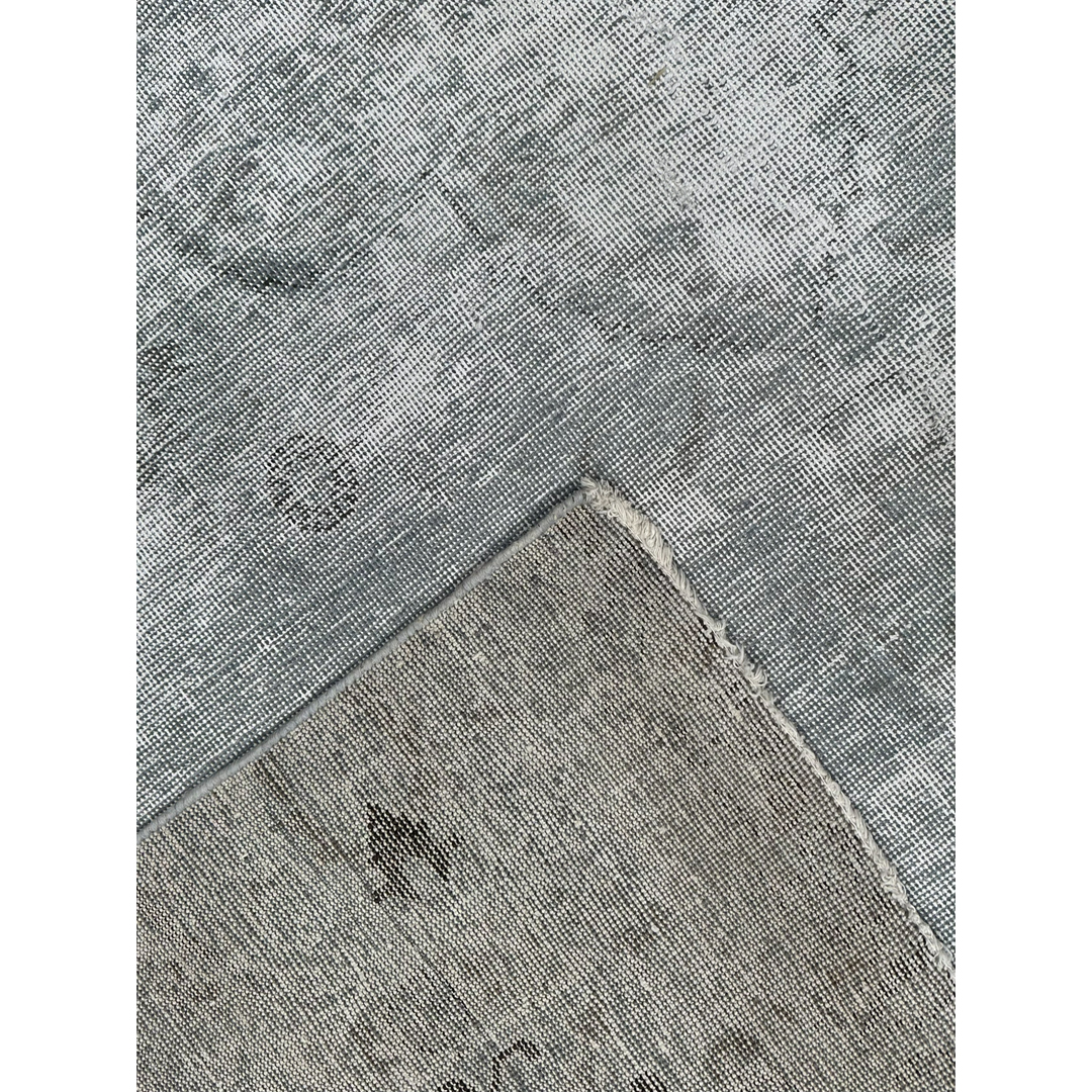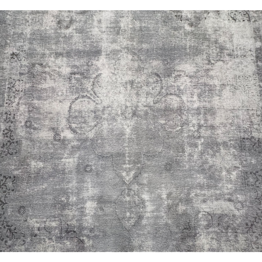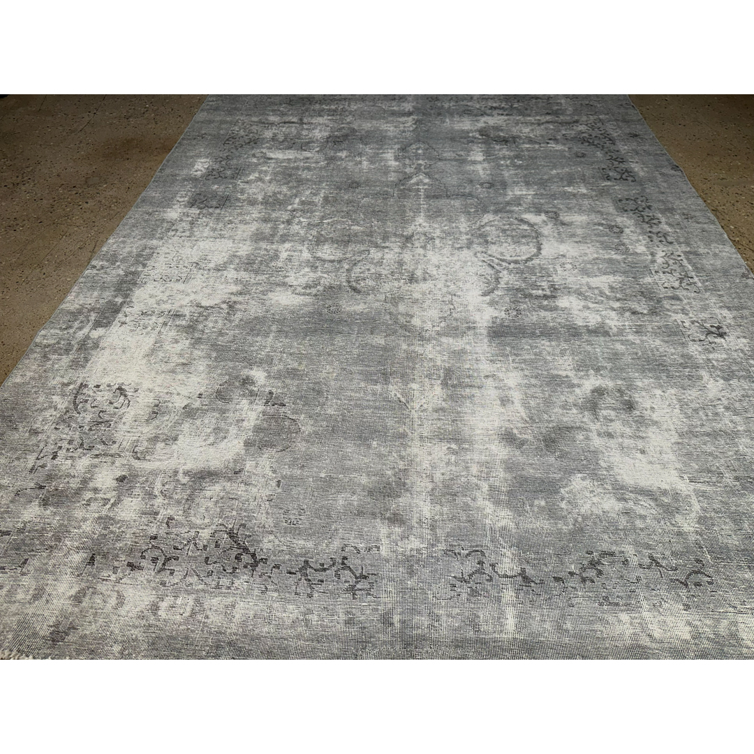 Measuring nearly 9×12 feet, this heavily distressed vintage Persian rug provides a highly versatile, luminous foundation for contemporary or minimalist residential projects. The intentionally shorn pile and faded color palette features a beautiful, low-contrast blend of silver, pale ash, and soft grey, accented by only the faintest whispers of charcoal within the central medallion shadow. The rug’s signature distressed finish creates an ethereal, textural aesthetic that feels artistic yet comfortable. Offering a serene and polished look, this piece pairs exceptionally well with natural white oak floors, crisp architectural plaster, and light linen upholstery.