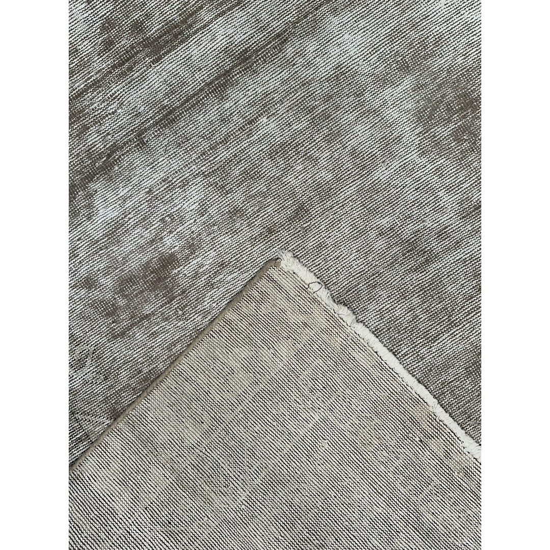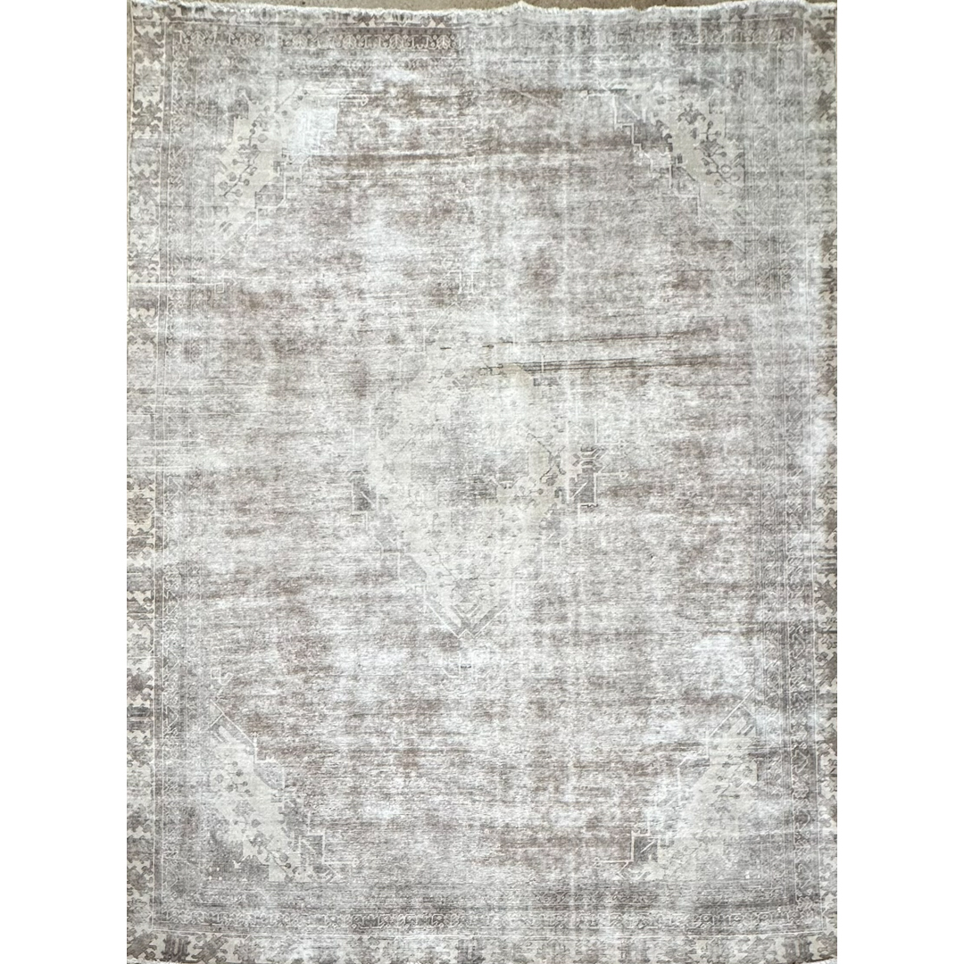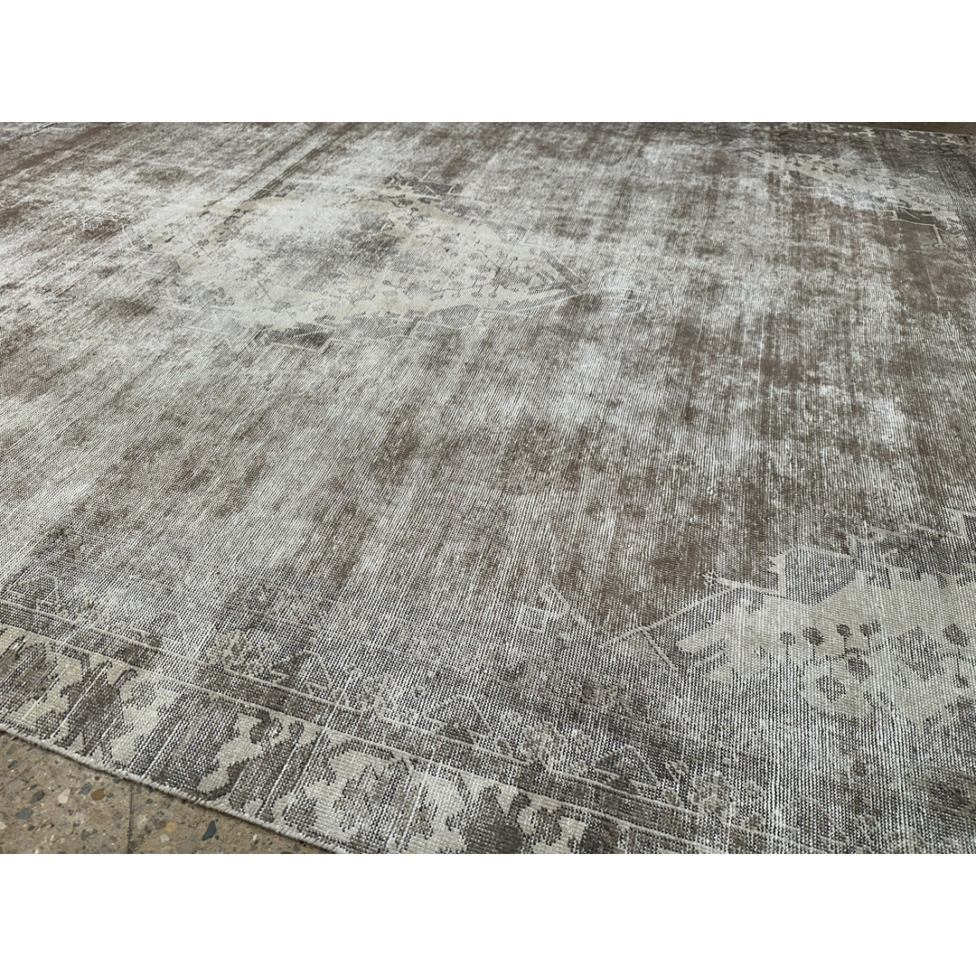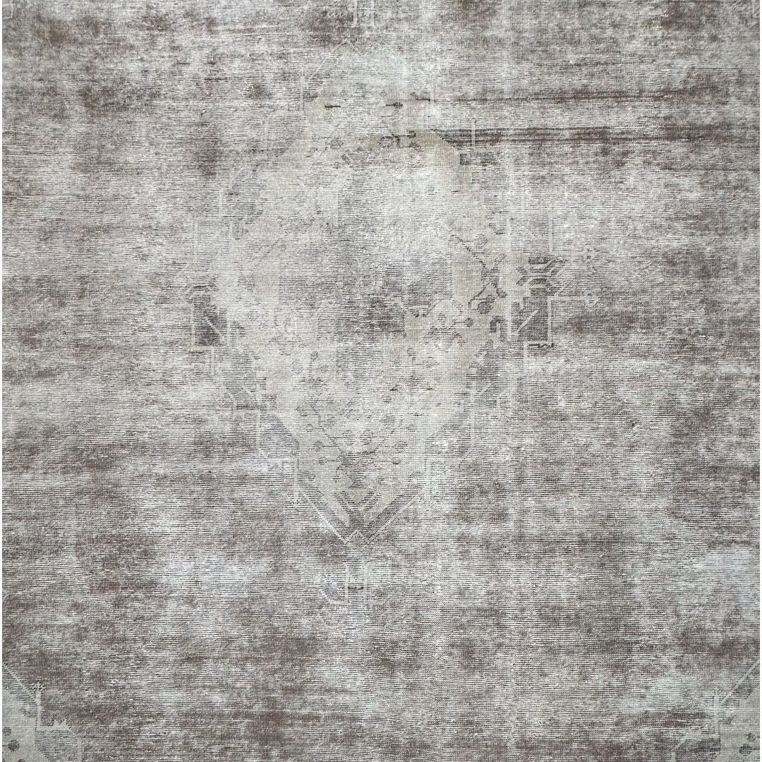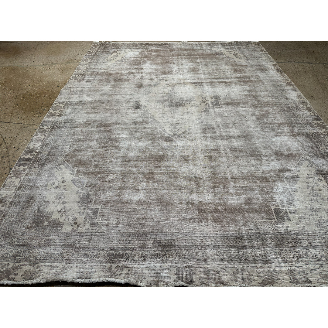 This vintage Persian rug exhibits a sophisticated, monochromatic aesthetic, achieved through a professional distressing process that artfully blends traditional heritage with contemporary style. The design features a ghost-like central medallion and structured geometric spandrels, with the faint outlines of floral vine-work still visible beneath a tonal wash of silver, bone, and light taupe. The weathered finish creates a beautiful high-low texture, emphasizing the rug’s antique character while offering a serene, neutral presence. Hand-knotted from high-quality wool, the low-sheared pile provides a soft, matte finish that highlights the natural variegation of the fibers. This piece serves as an elegant, understated foundation, making it an ideal choice for anchoring modern-transitional, minimalist, or industrial interiors.