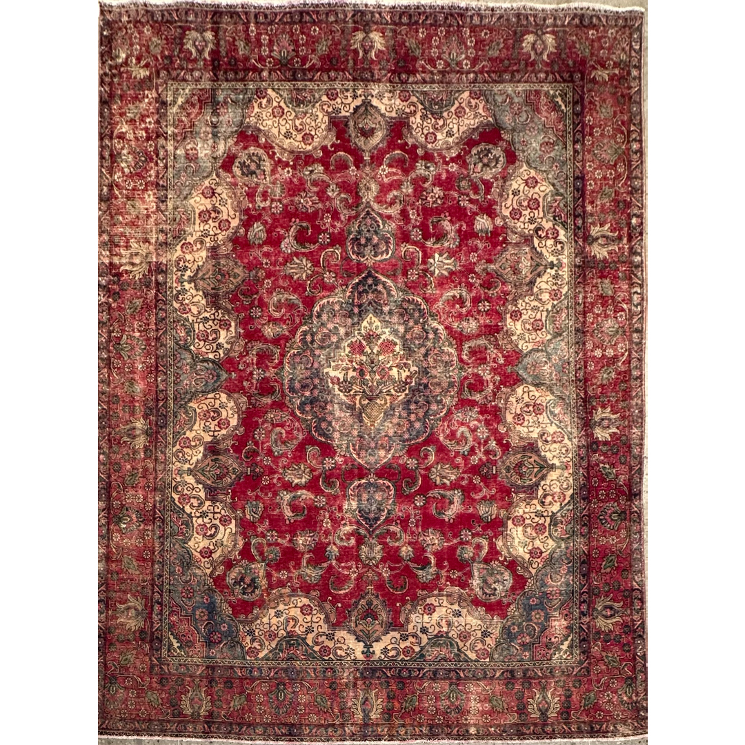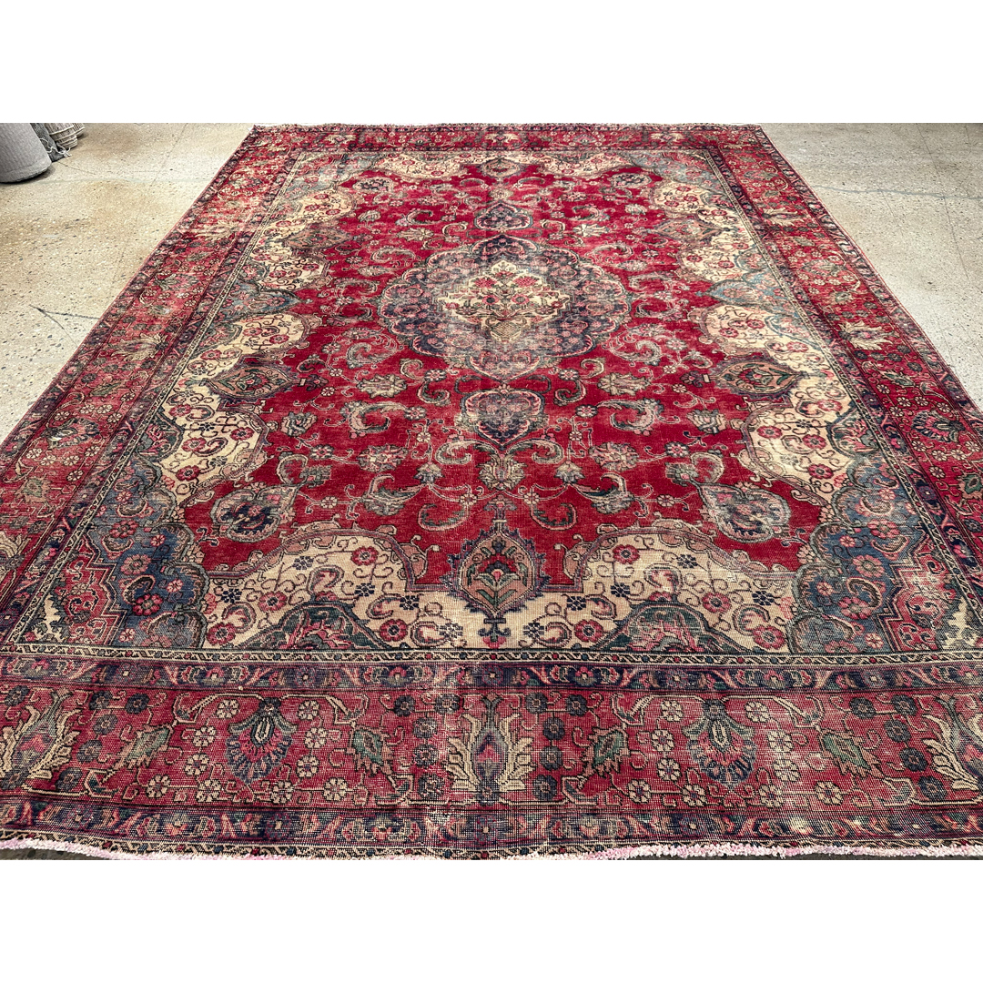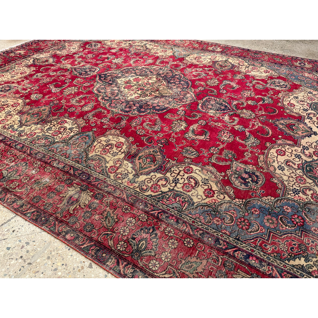 This vintage Persian rug features a grand, classic floral design that has been artfully softened through a professional distressing process. The vibrant madder-red field provides a rich backdrop for a large, intricate central medallion in indigo and cream. Sweeping ivory spandrels anchor the corners, while a dense network of scrolling vines, palmettes, and floral sprays populates the remaining field. The weathered finish creates a beautiful “ghost” effect, where the traditional motifs appear to recede and emerge from the low-sheared wool pile. The intentional distressing mutes the original high-contrast palette, resulting in a sophisticated, lived-in aesthetic that bridges the gap between antique heritage and modern design. With its substantial scale and timeless composition, this piece is an ideal choice for a grand living room or dining area seeking a touch of classic luxury with a contemporary edge.