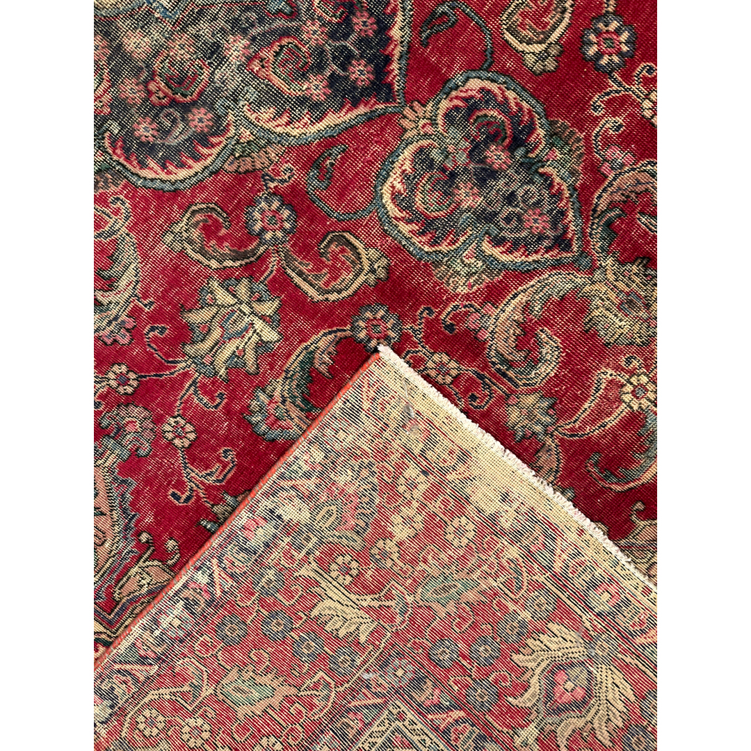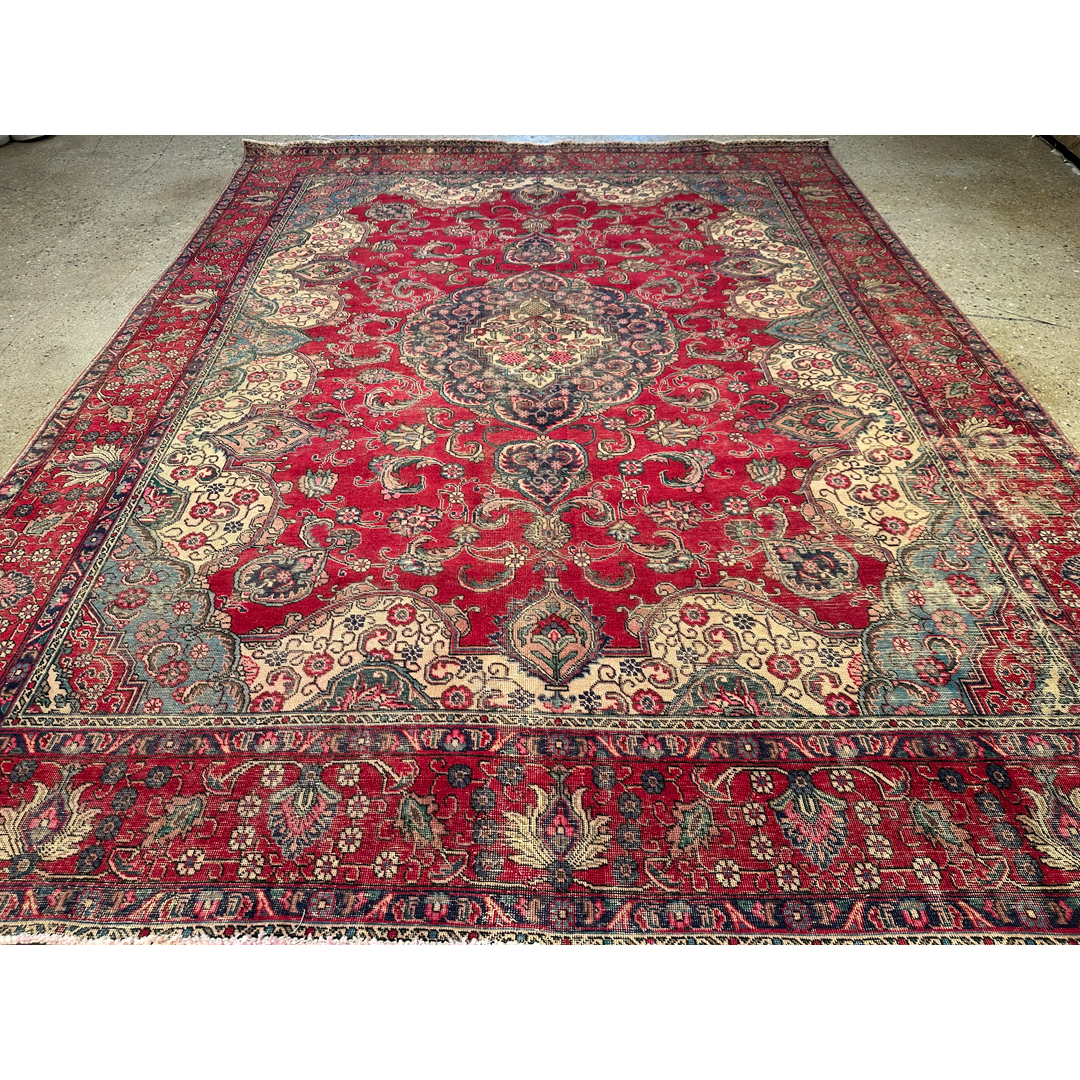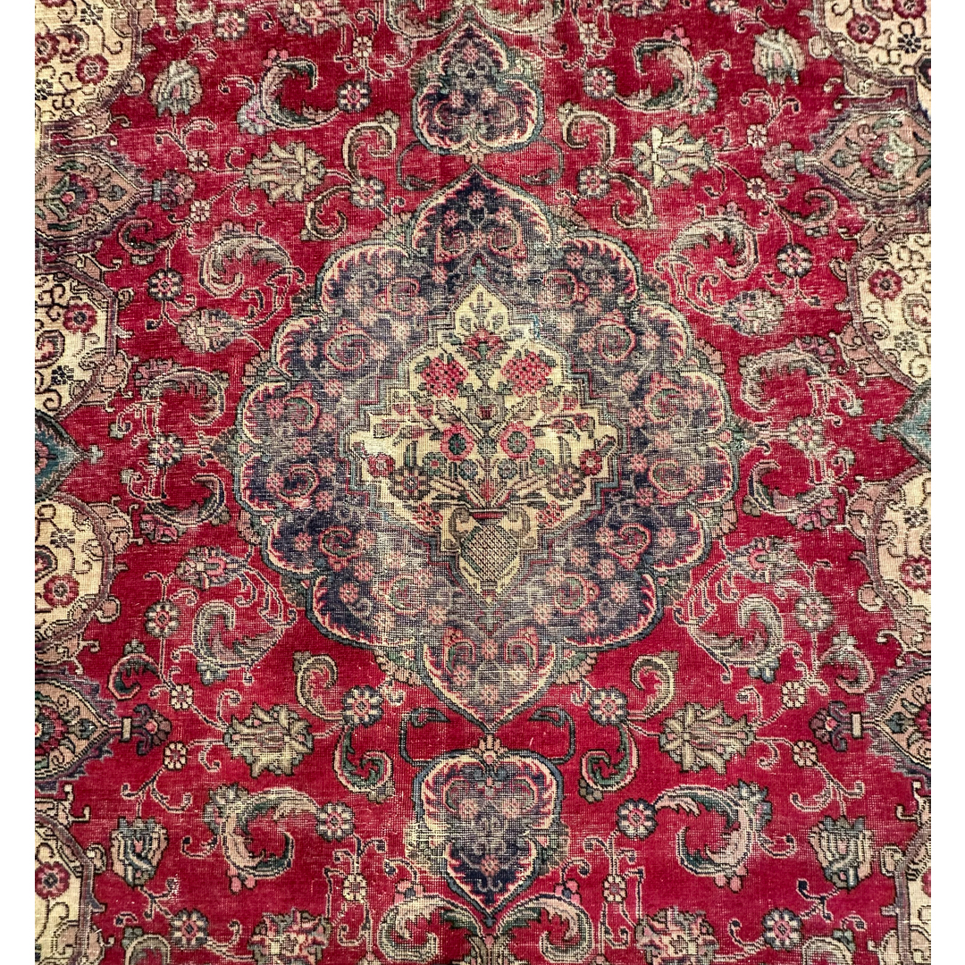 This vintage Persian rug features a grand, classic floral design that has been artfully softened through a professional distressing process. The vibrant madder-red field provides a rich backdrop for a large, intricate central medallion in indigo and cream. Sweeping ivory spandrels anchor the corners, while a dense network of scrolling vines, palmettes, and floral sprays populates the remaining field. The weathered finish creates a beautiful “ghost” effect, where the traditional motifs appear to recede and emerge from the low-sheared wool pile. The intentional distressing mutes the original high-contrast palette, resulting in a sophisticated, lived-in aesthetic that bridges the gap between antique heritage and modern design. With its substantial scale and timeless composition, this piece is an ideal choice for a grand living room or dining area seeking a touch of classic luxury with a contemporary edge.