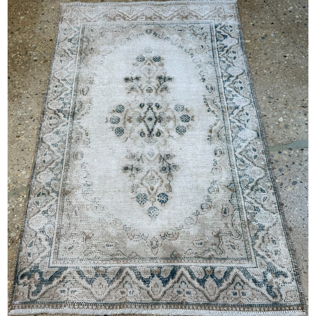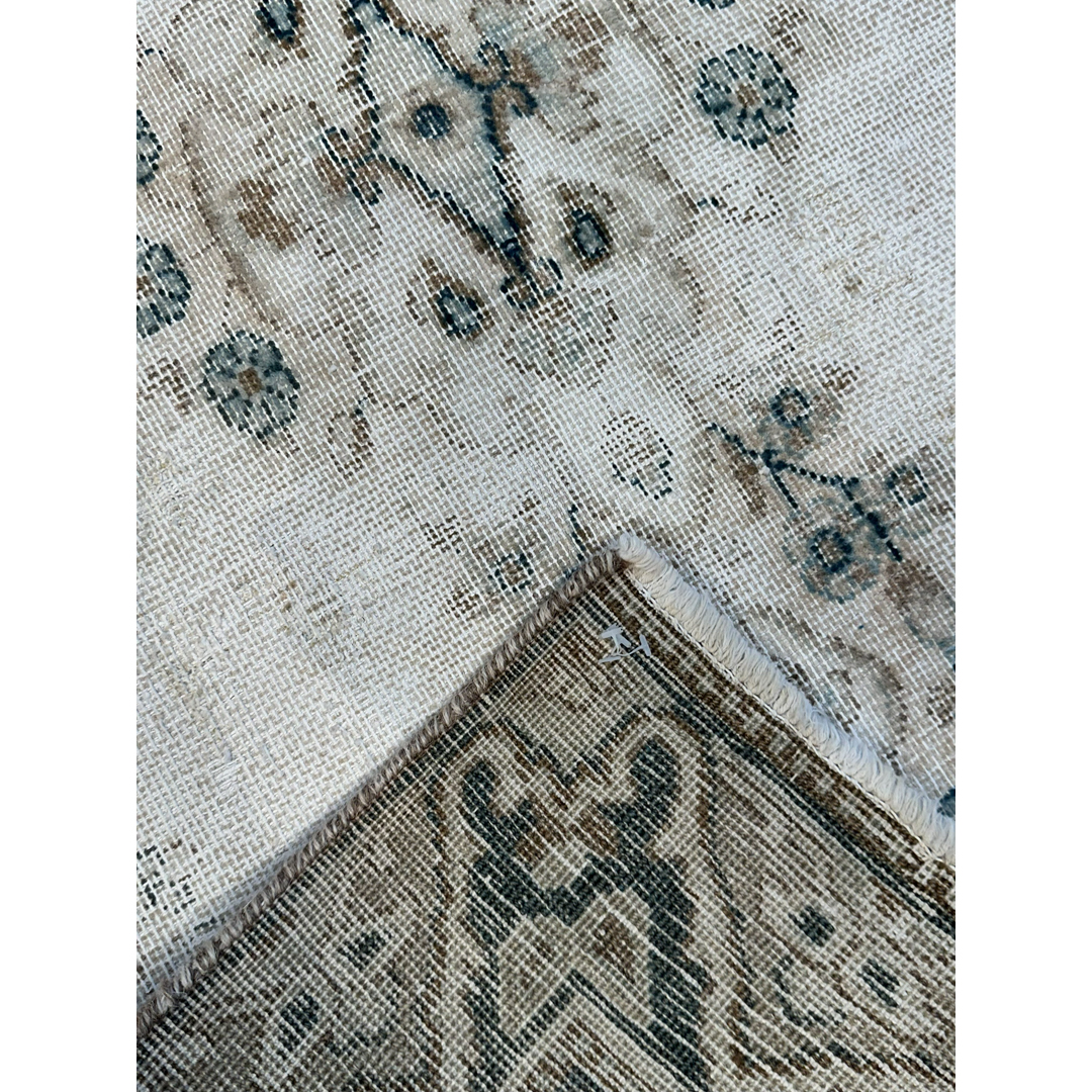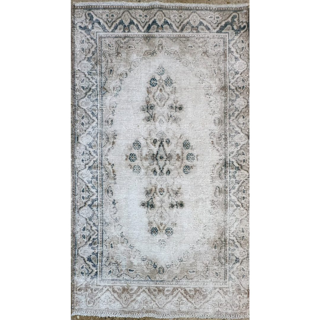 Add a touch of romance and history to your home with this delightfully distressed 2’7″ x 4’6″ ft. vintage Persian Tabriz rug. This hand-knotted piece features a dreamy, faded palette of creamy ivory, soft beige, and whispers of slate blue that creates an airy and expansive feel. The central medallion and surrounding floral borders are softened by age and wear, resulting in a ghost-like, romantic aesthetic that fits perfectly into shabby chic, French country, or neutral modern interiors. Its low pile and gentle color scheme make it a versatile and elegant accent for a powder room, bedside landing, or small entryway.
