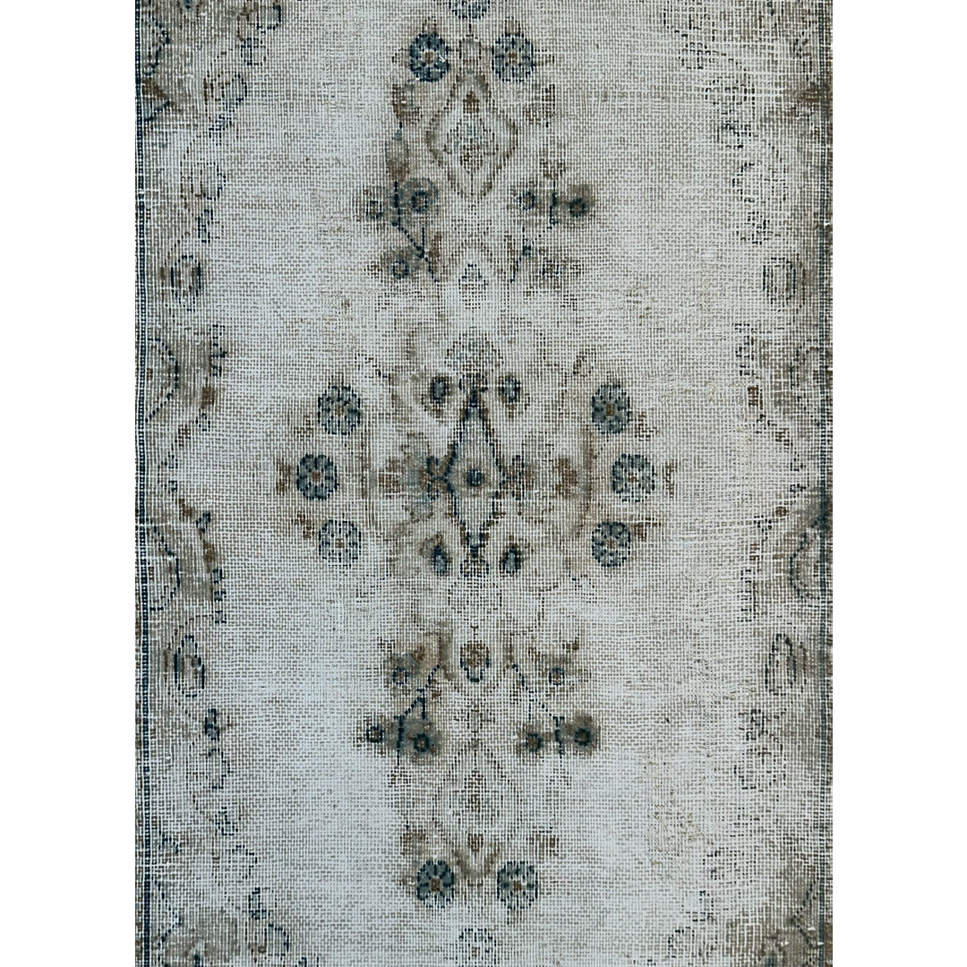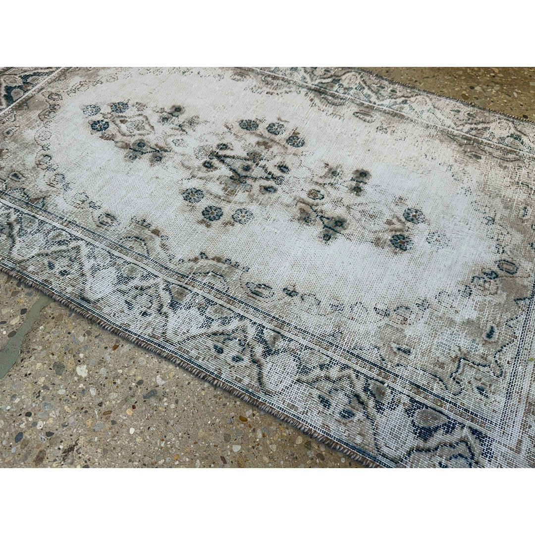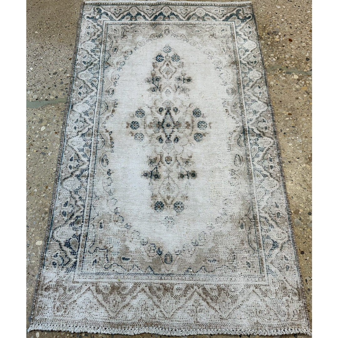 Add a touch of romance and history to your home with this delightfully distressed 2’7″ x 4’6″ ft. vintage Persian Tabriz rug. This hand-knotted piece features a dreamy, faded palette of creamy ivory, soft beige, and whispers of slate blue that creates an airy and expansive feel. The central medallion and surrounding floral borders are softened by age and wear, resulting in a ghost-like, romantic aesthetic that fits perfectly into shabby chic, French country, or neutral modern interiors. Its low pile and gentle color scheme make it a versatile and elegant accent for a powder room, bedside landing, or small entryway.