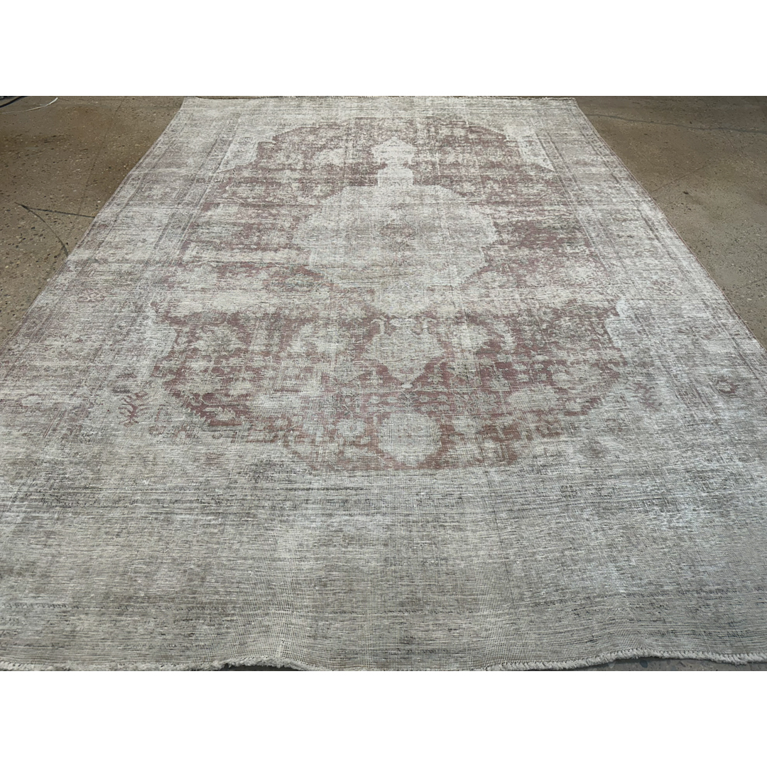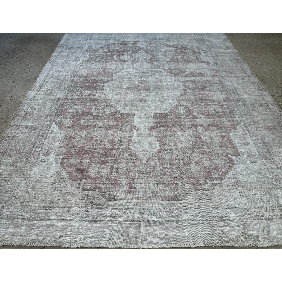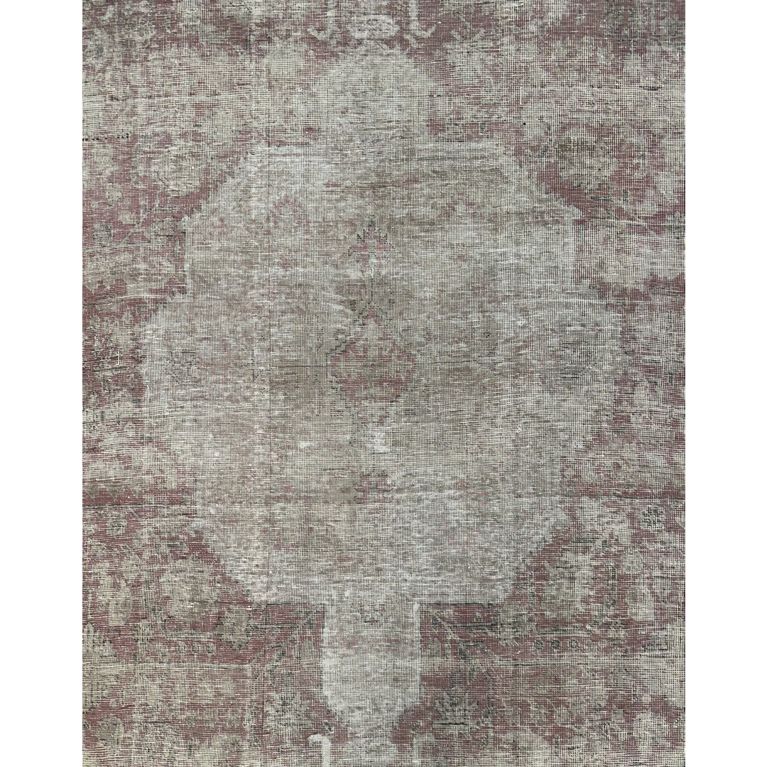 Embrace the soulful beauty of imperfection with this delightfully distressed 8’2″ x 10’10” ft. vintage Persian Tabriz rug. This hand-knotted piece features a heavily weathered patina that has softened the original colors into a dreamy, ethereal palette of misty grey, antique ivory, and faint whispers of terracotta rust. The traditional central medallion and floral motifs are visible only as ghostly shadows against the pale field, creating a sophisticated, monochromatic effect that speaks to decades of history. The low pile and exposed foundation areas add rich texture and authentic character, making this rug a perfect choice for a shabby chic living room, a French country bedroom, or a modern space seeking a layer of soft, lived-in luxury.