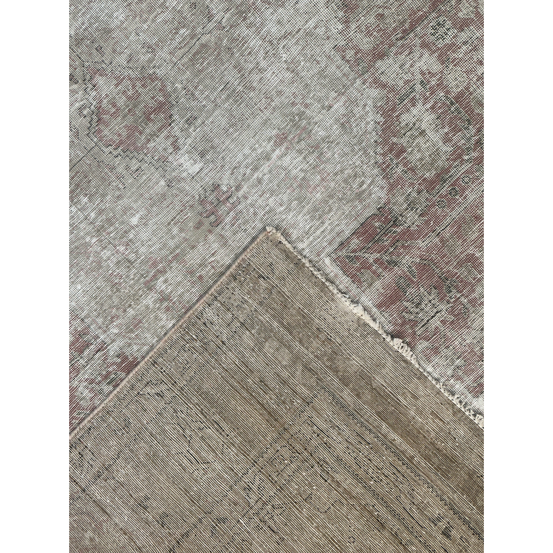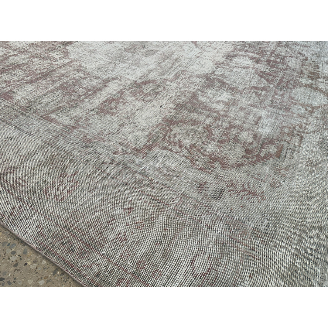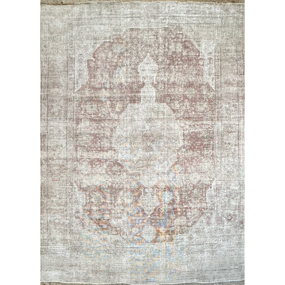 Embrace the soulful beauty of imperfection with this delightfully distressed 8’2″ x 10’10” ft. vintage Persian Tabriz rug. This hand-knotted piece features a heavily weathered patina that has softened the original colors into a dreamy, ethereal palette of misty grey, antique ivory, and faint whispers of terracotta rust. The traditional central medallion and floral motifs are visible only as ghostly shadows against the pale field, creating a sophisticated, monochromatic effect that speaks to decades of history. The low pile and exposed foundation areas add rich texture and authentic character, making this rug a perfect choice for a shabby chic living room, a French country bedroom, or a modern space seeking a layer of soft, lived-in luxury.
