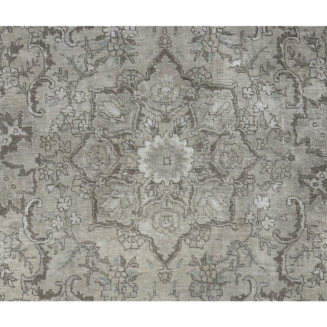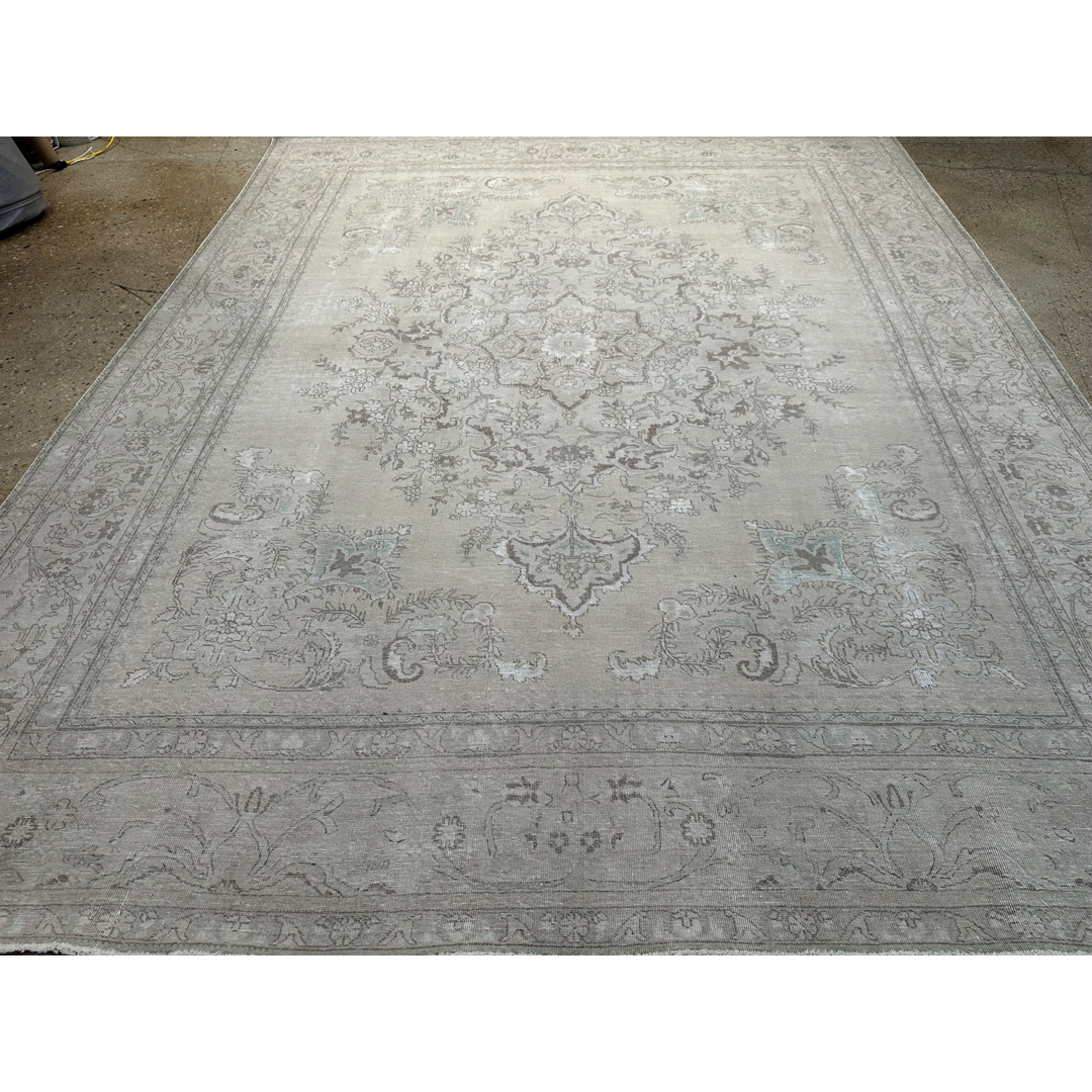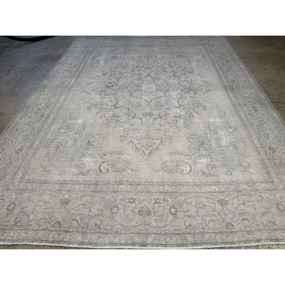 This breathtaking vintage Persian Tabriz rug is a stunning embodiment of the highly coveted “erased” aesthetic, seamlessly marrying old-world elegance with modern minimalism. The intricate, classical composition is anchored by a magnificent central medallion, surrounded by a densely woven field of sweeping botanical vines, delicate scrolling arabesques, and finely detailed floral palmettes. Through decades of gentle wear and an expert distressing process, the original pattern has been beautifully transformed into a ghost-like, textural watermark.