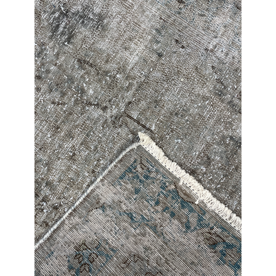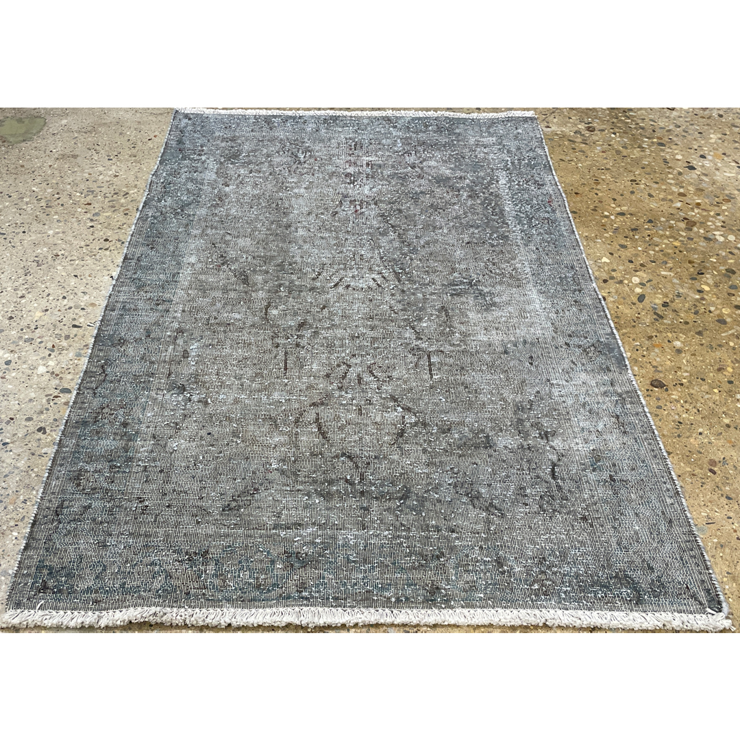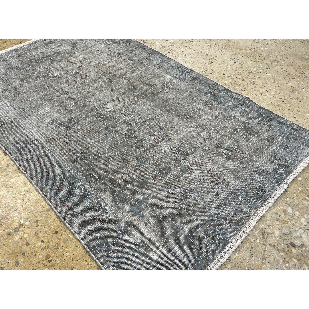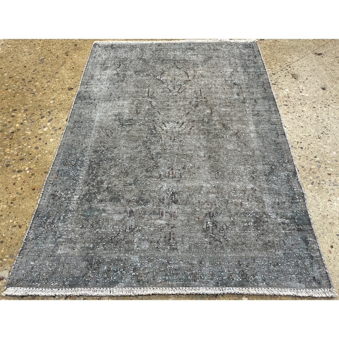 Embrace the beauty of imperfection with this distinctively distressed 2’10” x 4’8″ ft. vintage Tabriz rug. This genuine hand-knotted piece has been transformed through time and artistry to feature a moody, monochromatic palette of steel gray, charcoal, and slate blue. The original intricate floral medallion design is now a subtle ghost beneath the texture, creating a sophisticated, abstract look that bridges the gap between antique heritage and modern industrial style. Perfect for adding depth and edge to a small space, this unique rug serves as a striking foundation for an entryway, powder room, or bedside.