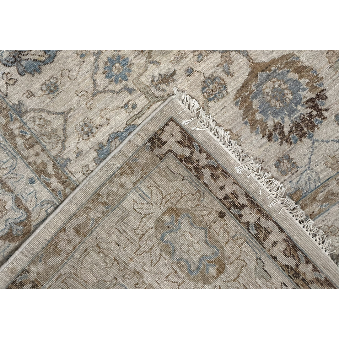 The color story is crisp and clean, dominated by creamy whites and silver greys, punctuated by whispers of French blue in the floral motifs and border. This versatile palette allows the rug to harmonize effortlessly with a wide range of décor styles, from coastal chic to formal traditional, adding a layer of luxury without dominating the room’s color scheme.