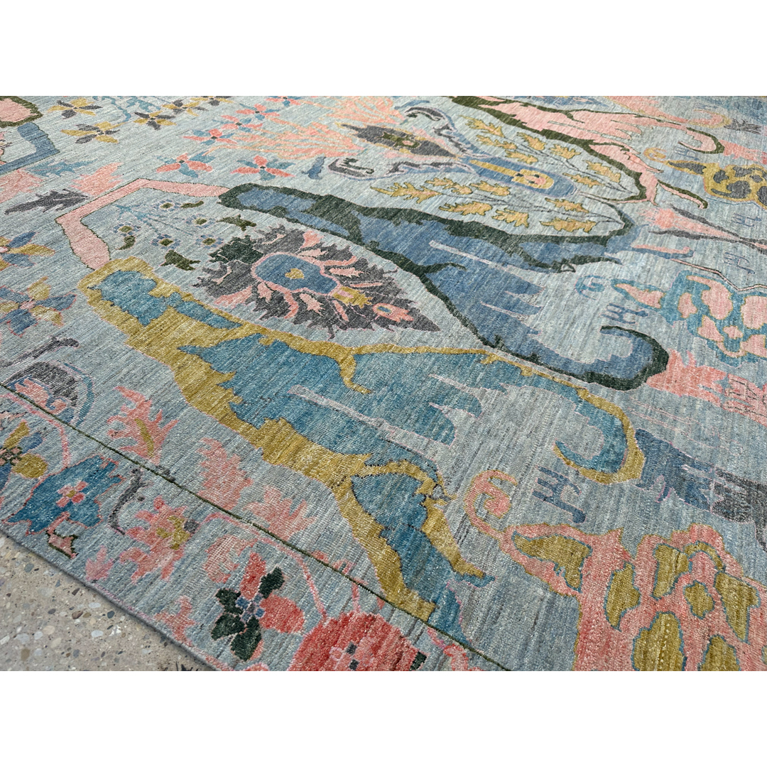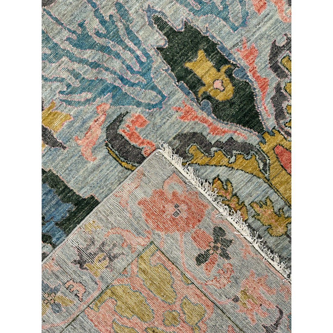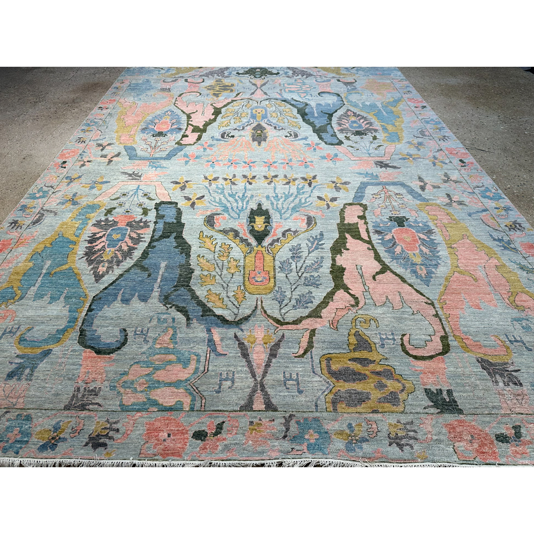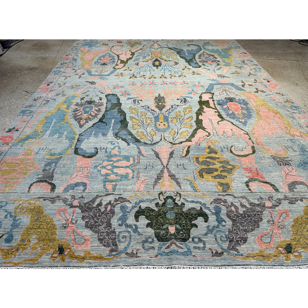 Infuse your home with a whimsical and sophisticated charm with this breathtaking transitional rug. Measuring a grand 9’10” x 14’4″ ft., this oversized 10×14 area rug features a magnificent, symmetrical damask-inspired design, reinterpreted with a fresh, artistic sensibility. A luminous field of soft, pastel blue provides an ethereal backdrop for the intricate motifs, which burst with a playful contemporary palette of dusty pink, vibrant yellow, deep navy, and soft sage. Expertly hand-knotted with a plush, inviting pile, this rug offers both luxurious comfort and a captivating visual experience. It is the perfect statement piece to anchor a grand living room, a serene master suite, or an elegant dining area, effortlessly blending classic artistry with a lighthearted, modern elegance.