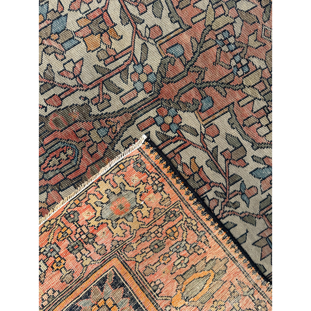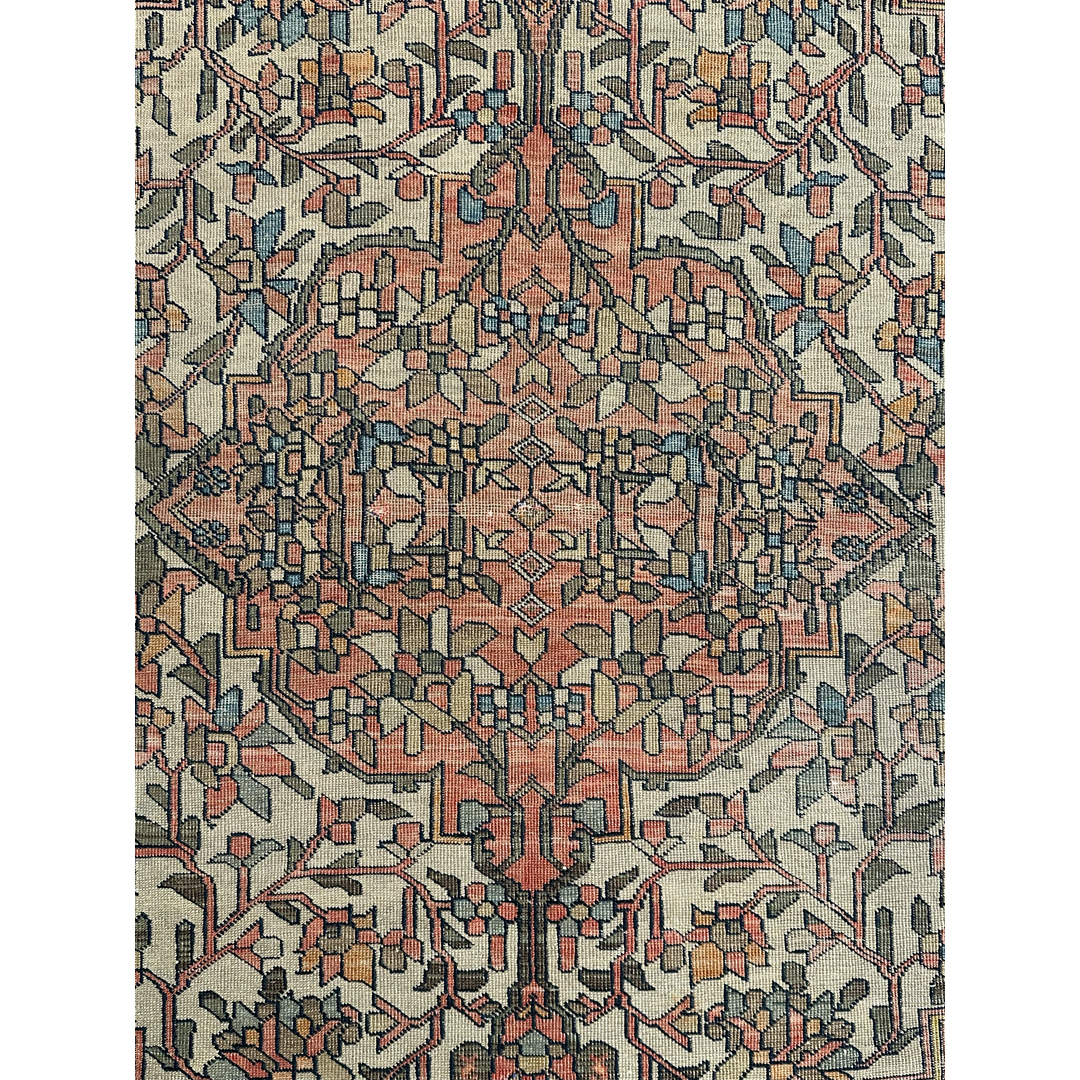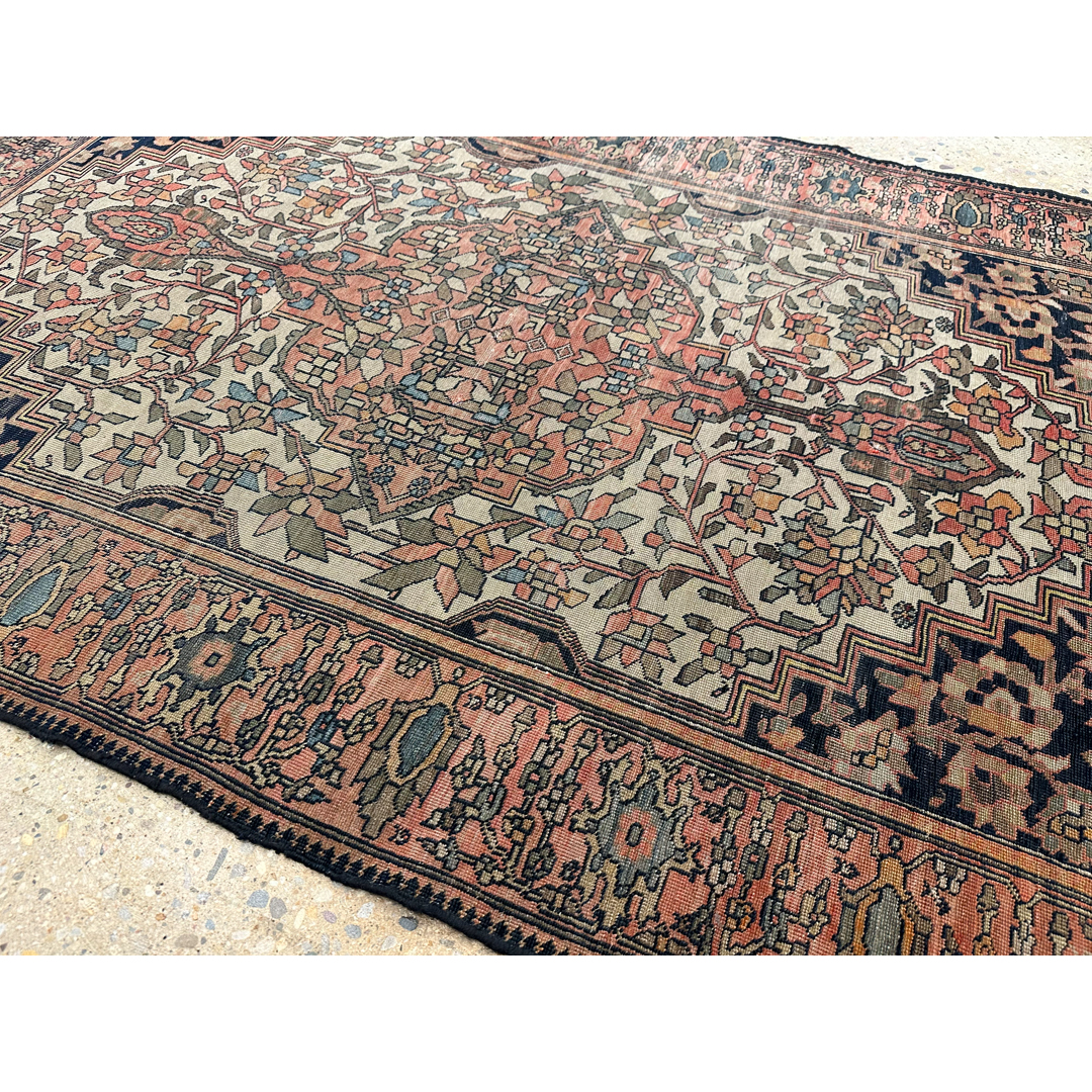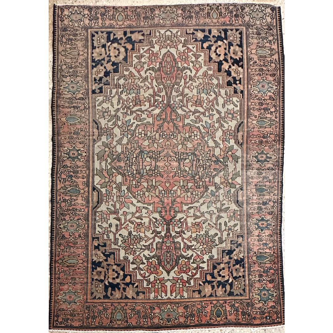 Elevate your interior with the refined elegance of this fabulous 4’4″ x 6′ ft. antique Persian Sarouk rug, woven in the renowned Farahan tradition. A genuine hand-knotted masterpiece from the 1910s, this rug features a sophisticated cream and ivory field that serves as a luminous backdrop for a large, intricate central medallion. The floral motifs are rendered in a soft, romantic palette of salmon pink, sage green, and pale blue, creating a delicate and airy aesthetic. Contrasting deep navy blue corner spandrels anchor the design, while a wide border in a warm salmon tone, filled with stylized floral rosettes and vines, frames the composition beautifully. This durable and historically significant piece offers a perfect blend of luxury and softness, making it an exquisite choice for a formal sitting room, bedroom, or private library.