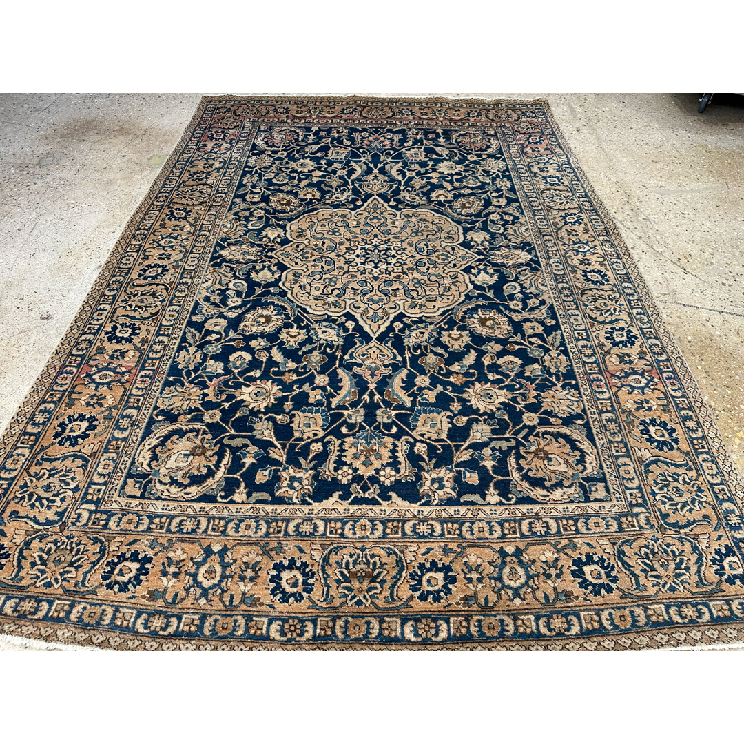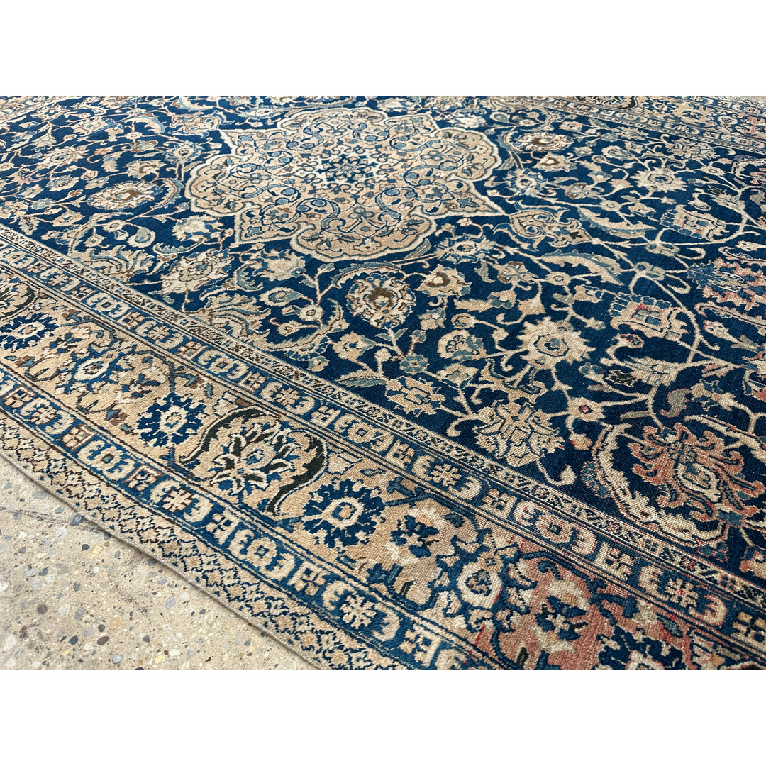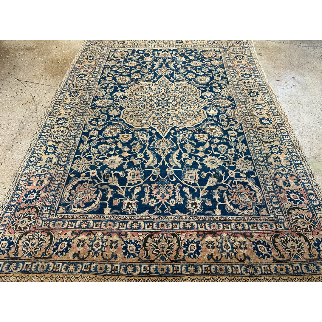 Elevate your formal living space with the timeless elegance of this fabulous 7’2″ x 10’5″ ft. antique Persian Tabriz rug. Hand-knotted in the 1930s, this exquisite piece features a deep, velvety midnight indigo field that provides a dramatic backdrop for the intricate artistry. The composition is anchored by a magnificent, multi-lobed central medallion rendered in creamy beige and soft ivory, detailed with delicate floral sprays that radiate outward. Surrounding the center, the field is densely populated with swirling vines and classic Shah Abbas palmettes in soft shades of blush pink, sage, and gold. A wide, luminous ivory border filled with a sophisticated floral meander frames the rug, offering a bright contrast and formal structure perfect for a grand library or dining room.
