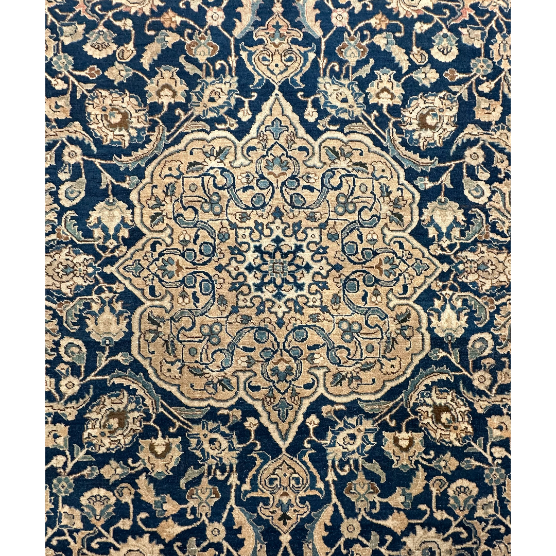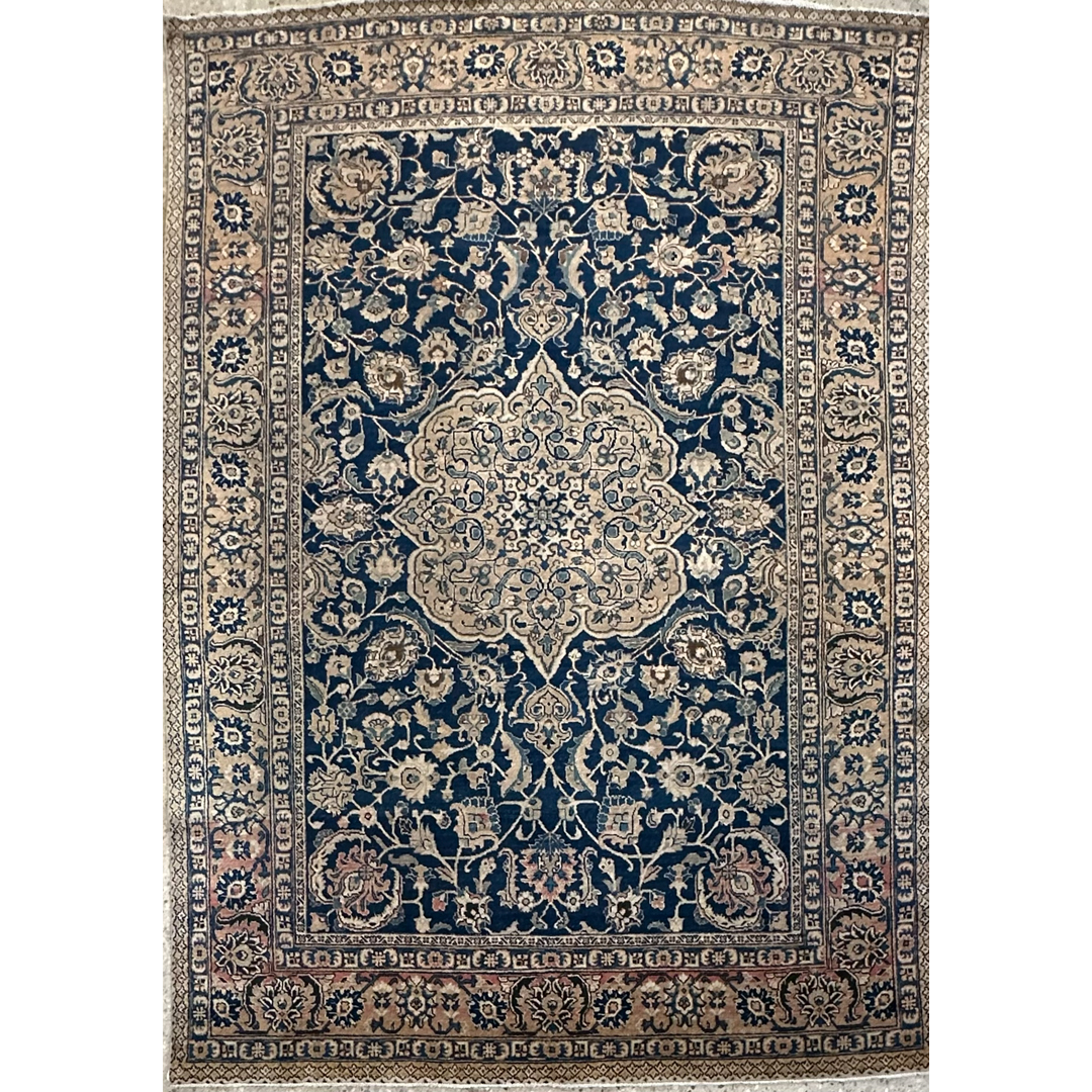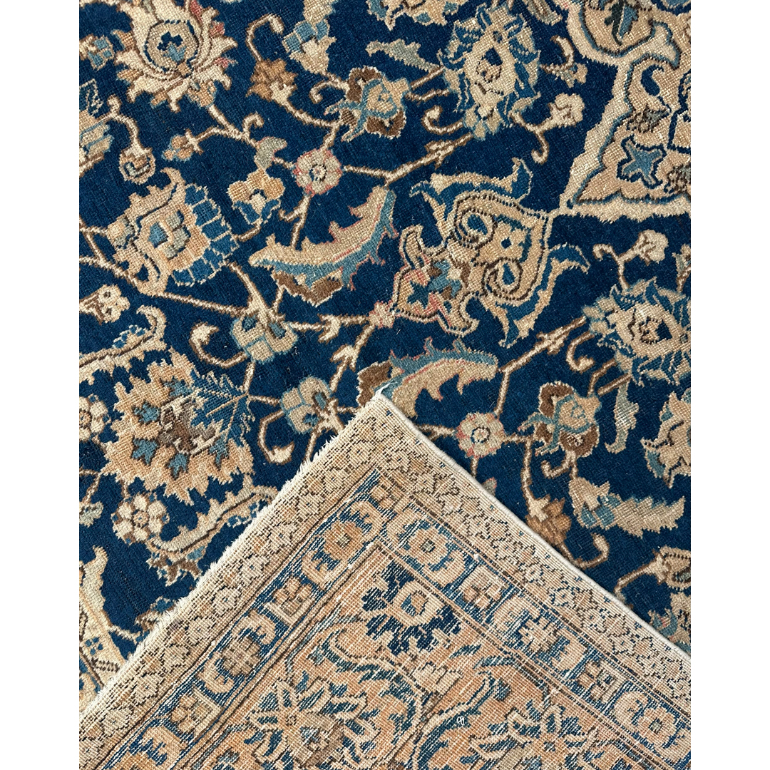 Elevate your formal living space with the timeless elegance of this fabulous 7’2″ x 10’5″ ft. antique Persian Tabriz rug. Hand-knotted in the 1930s, this exquisite piece features a deep, velvety midnight indigo field that provides a dramatic backdrop for the intricate artistry. The composition is anchored by a magnificent, multi-lobed central medallion rendered in creamy beige and soft ivory, detailed with delicate floral sprays that radiate outward. Surrounding the center, the field is densely populated with swirling vines and classic Shah Abbas palmettes in soft shades of blush pink, sage, and gold. A wide, luminous ivory border filled with a sophisticated floral meander frames the rug, offering a bright contrast and formal structure perfect for a grand library or dining room.