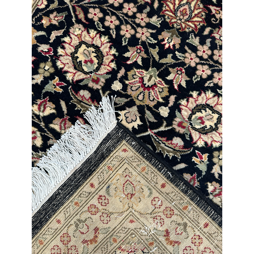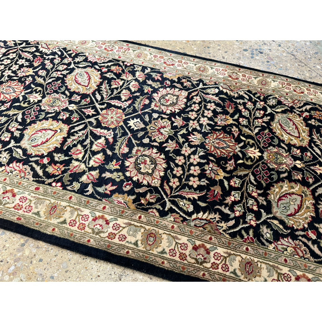 Transform your hallway with the timeless elegance of this fabulous 2’7″ x 10’2″ ft. Persian Kashan design runner. Expertly hand-knotted in Pakistan, this piece features a dramatic, deep navy blue field that provides a striking backdrop for a lush, symmetrical garden of stylized flowers. The intricate pattern is woven with scrolling vines, large floral palmettes, and delicate blossoms in sophisticated shades of creamy ivory, sage green, and soft burgundy. Framed by a contrasting cream border adorned with a continuous floral meander, this durable and luxurious runner creates a grand and welcoming path for any entryway or corridor.