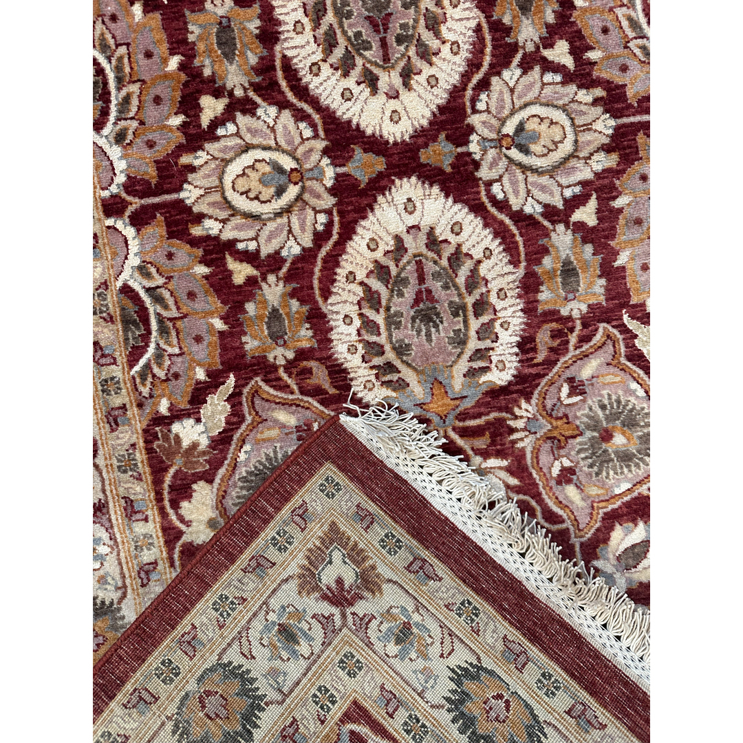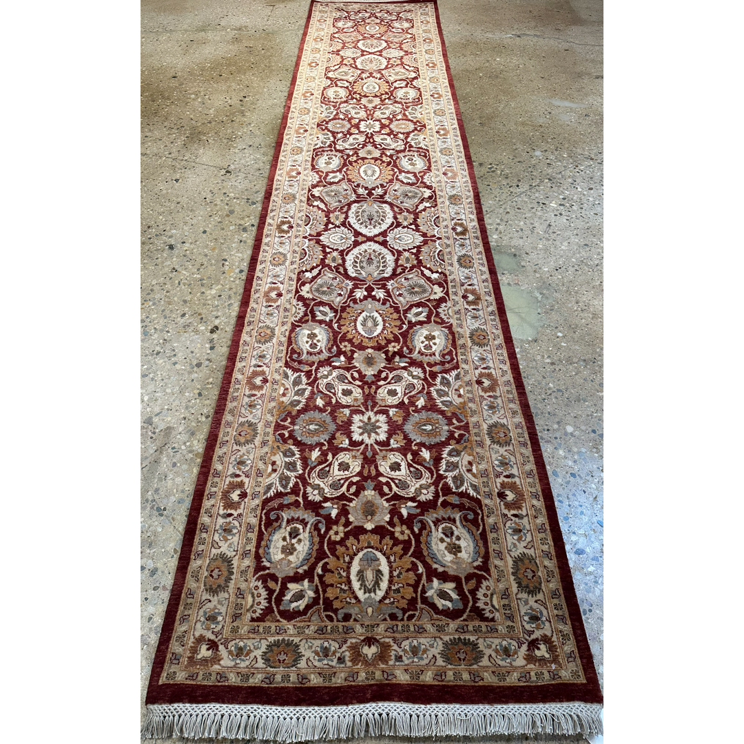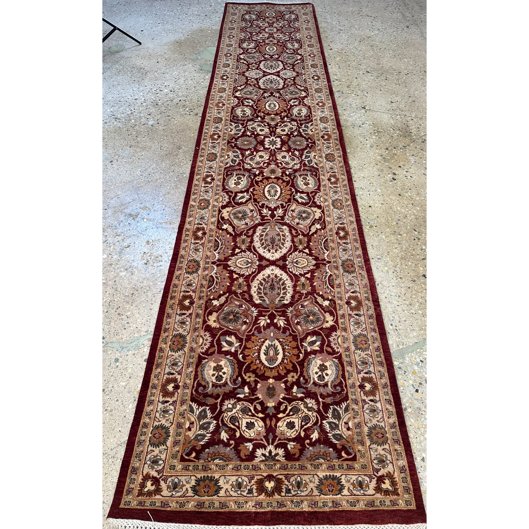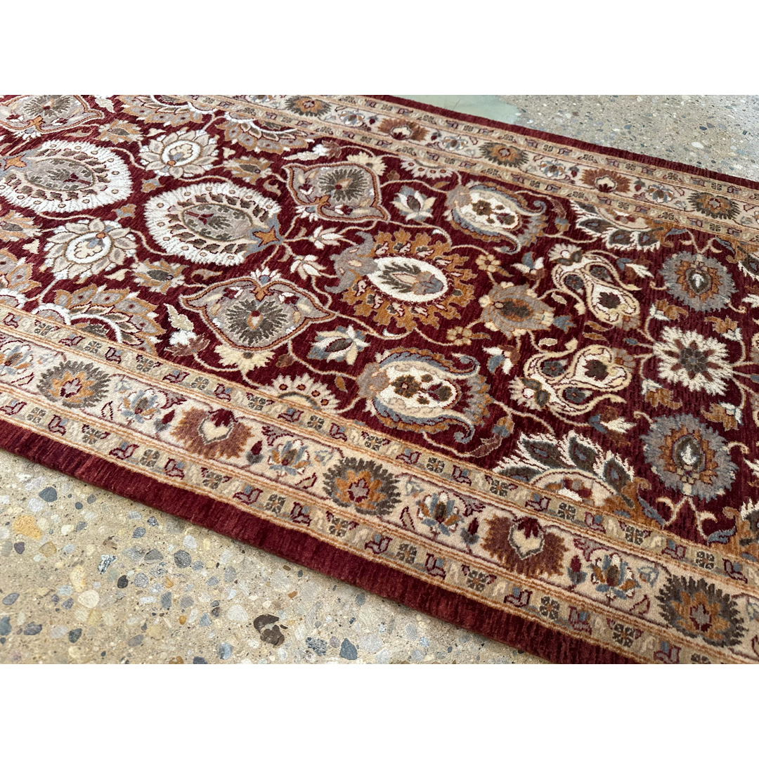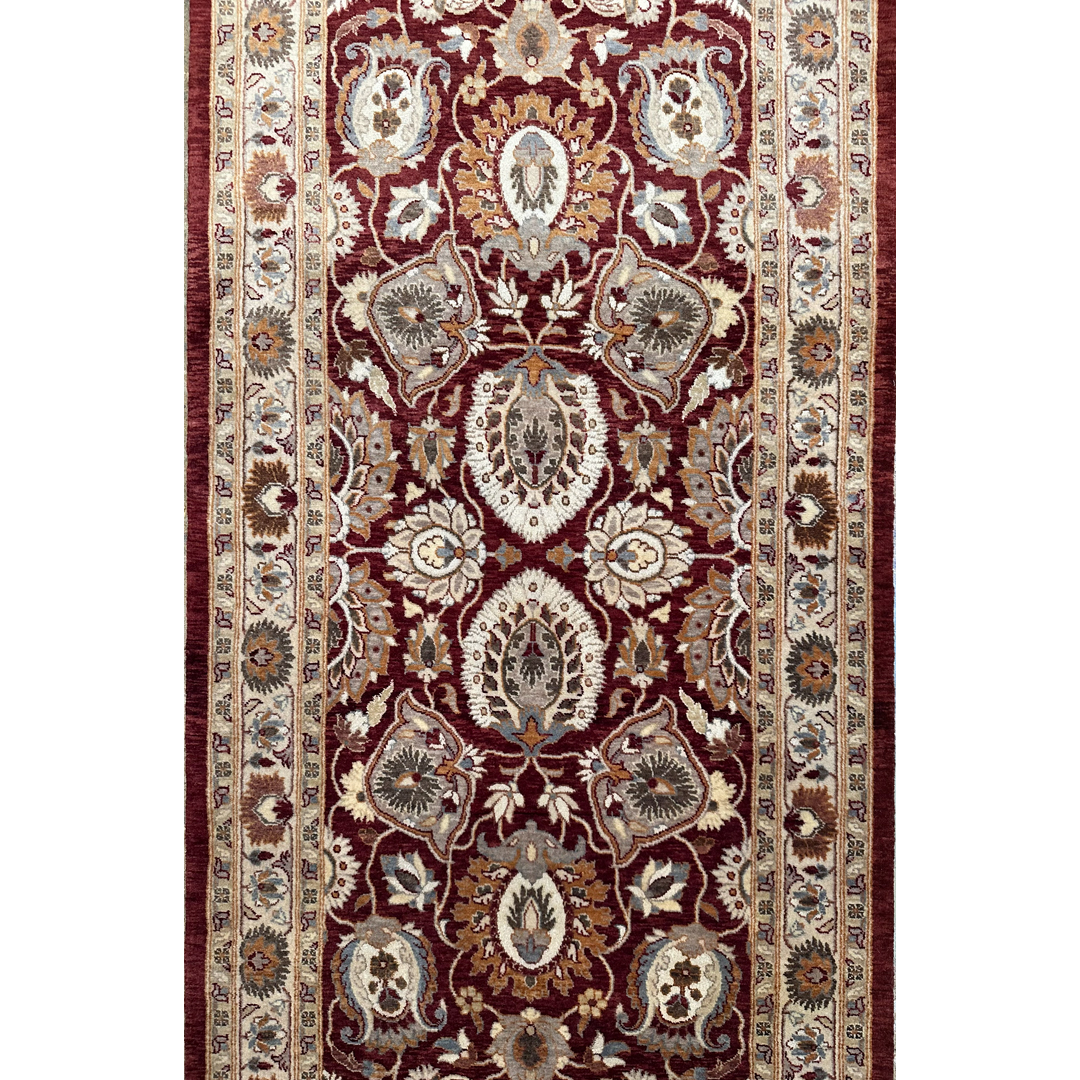 Enhance your hallway with the sophisticated charm of this fabulous 2’7″ x 12’10” ft. Persian Kashan design runner. Expertly hand-knotted in Pakistan, this piece features a rich, deep burgundy field that serves as a dramatic canvas for an intricate display of stylized floral palmettes and scrolling vines. The lush botanical motifs are rendered in elegant shades of creamy beige, soft tan, and slate blue, creating a sophisticated and harmonious composition. Framed by a contrasting ivory border filled with a delicate floral meander, this durable wool runner offers a timeless aesthetic perfect for adding warmth and traditional elegance to a long corridor or entryway.