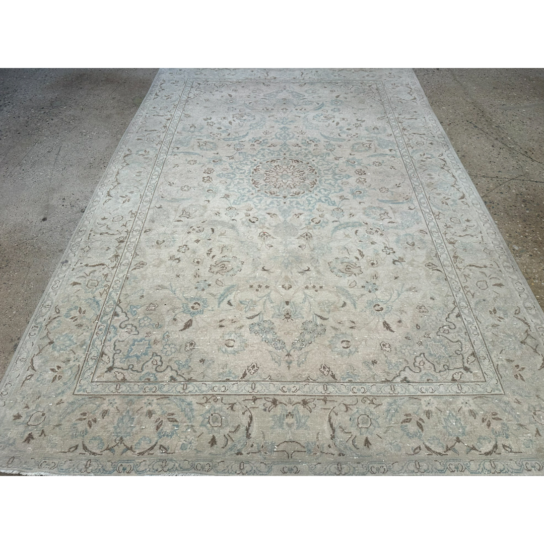 This vintage Persian Kashan rug features a sophisticated, ethereal aesthetic achieved through a professional distressing process. The design centers on a classic floral medallion, which radiates into a densely ornamented field of scrolling palmettes and delicate vine-work. Rendered in a serene palette of ivory, silver, and soft seafoam blue, the traditional motifs are artfully muted, creating a high-low texture that emphasizes the rug’s antique character while offering a modern, neutral presence. The low, sheared wool pile provides a refined, lived-in feel, making it an exceptional choice for transitional, coastal, or minimalist interiors. Its balanced composition and tranquil colorway offer a timeless elegance that anchors a room with understated luxury.