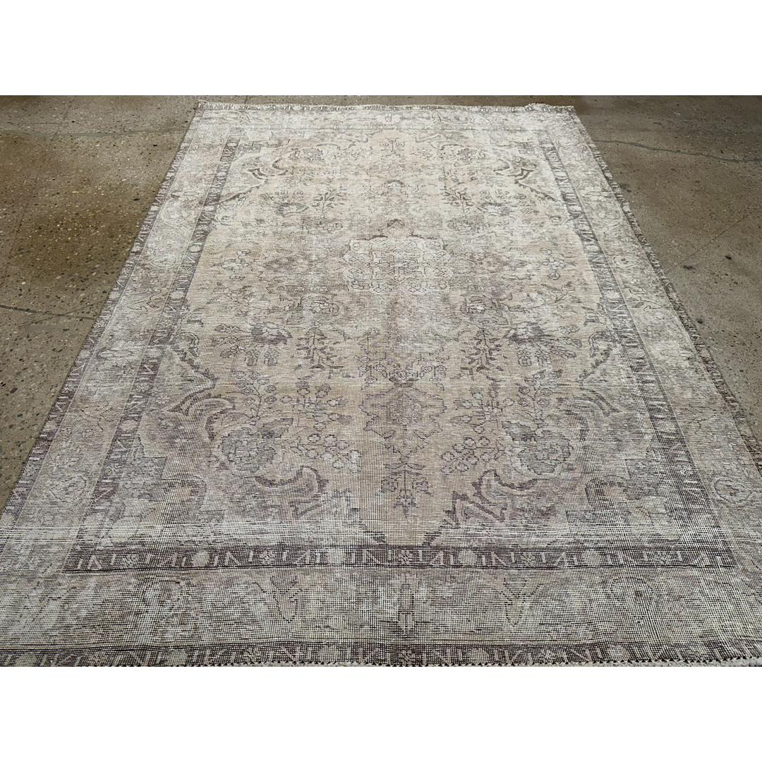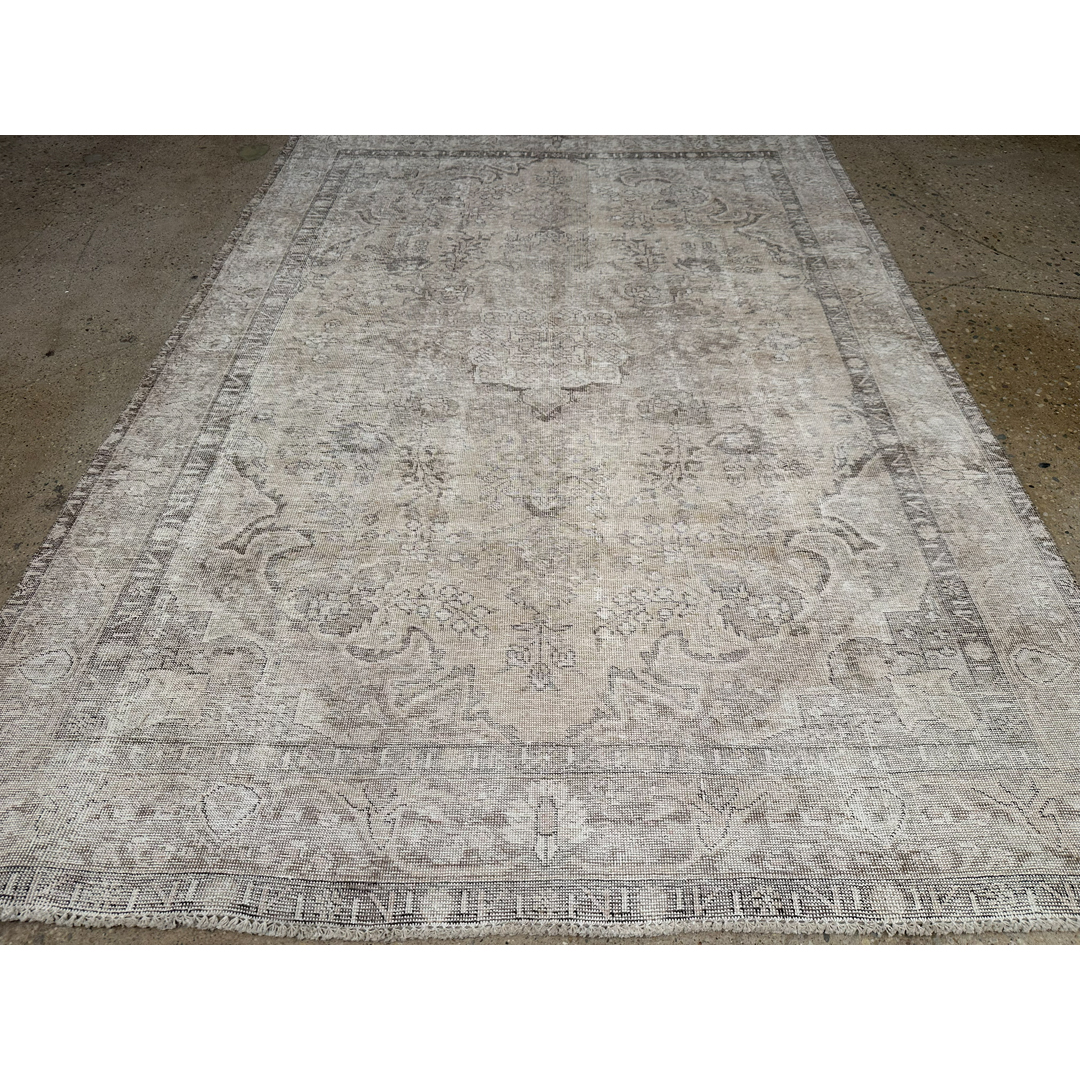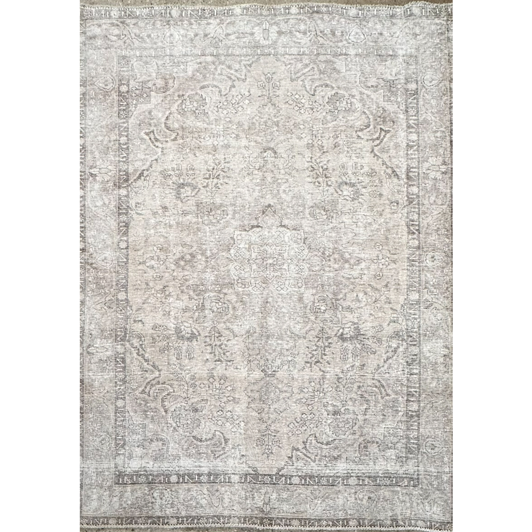 This vintage Persian rug showcases a refined, monochromatic aesthetic achieved through a professional distressing process in Pakistan. The design features a delicate central medallion surrounded by a field of ethereal floral sprays and scrolling vine-work, all rendered in a soft palette of silver, bone, and light taupe. The weathered finish artfully mutes the traditional motifs, creating a high-low texture that emphasizes the rug’s antique character while providing a contemporary, neutral presence. The low, sheared wool pile offers a sophisticated, lived-in feel, making it an ideal choice for modern-transitional or minimalist spaces. Its understated elegance and serene colorway provide a versatile foundation that can anchor a variety of interior styles without overwhelming the room’s decor.
