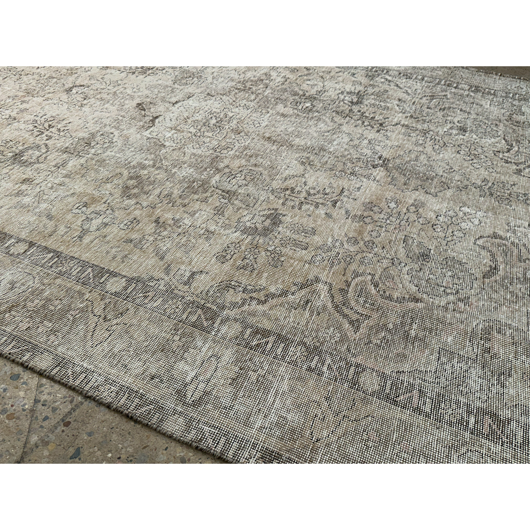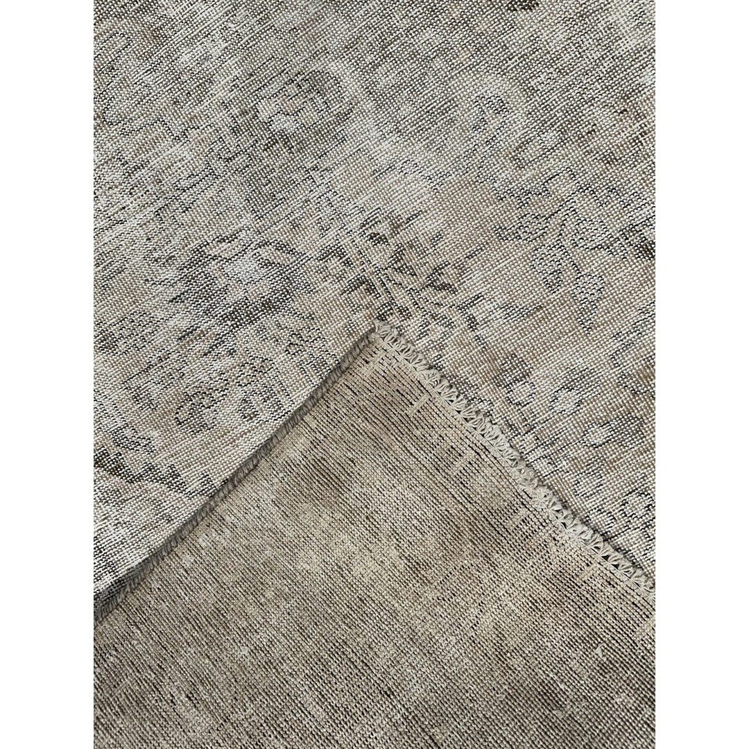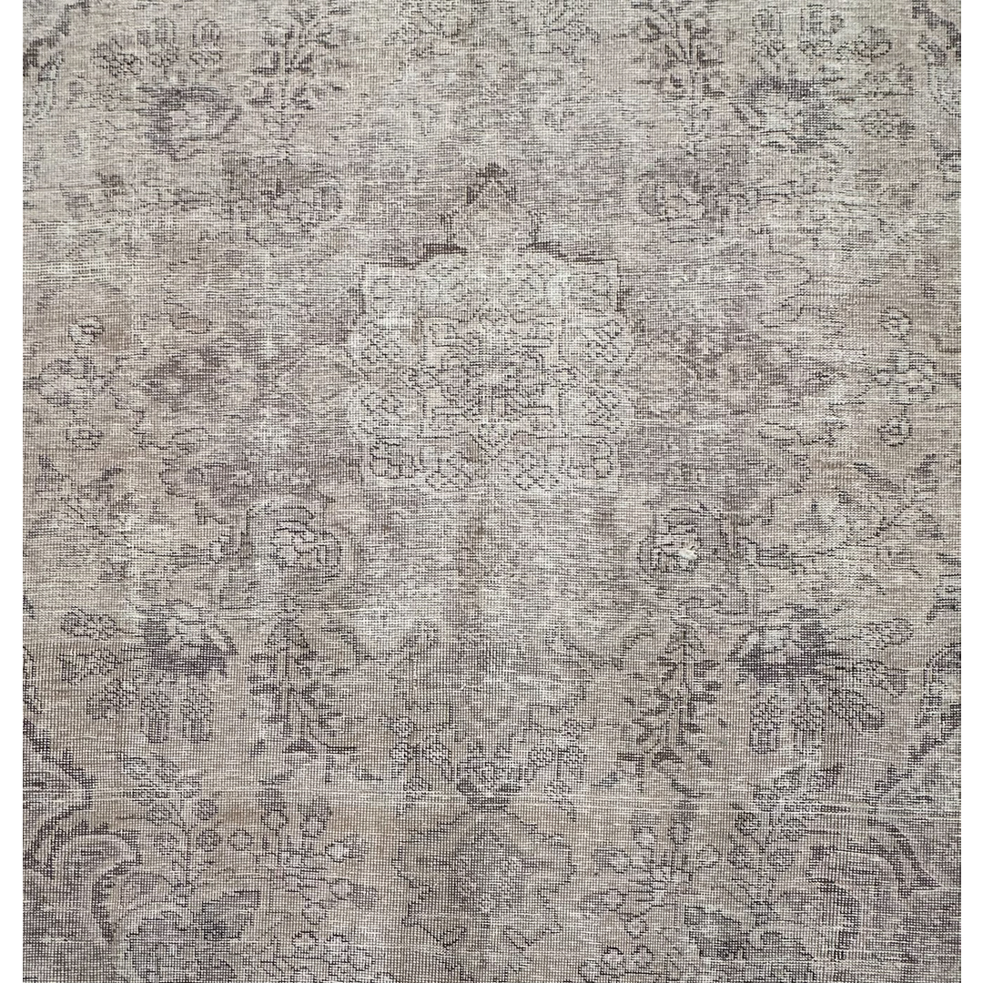 This vintage Persian rug showcases a refined, monochromatic aesthetic achieved through a professional distressing process in Pakistan. The design features a delicate central medallion surrounded by a field of ethereal floral sprays and scrolling vine-work, all rendered in a soft palette of silver, bone, and light taupe. The weathered finish artfully mutes the traditional motifs, creating a high-low texture that emphasizes the rug’s antique character while providing a contemporary, neutral presence. The low, sheared wool pile offers a sophisticated, lived-in feel, making it an ideal choice for modern-transitional or minimalist spaces. Its understated elegance and serene colorway provide a versatile foundation that can anchor a variety of interior styles without overwhelming the room’s decor.