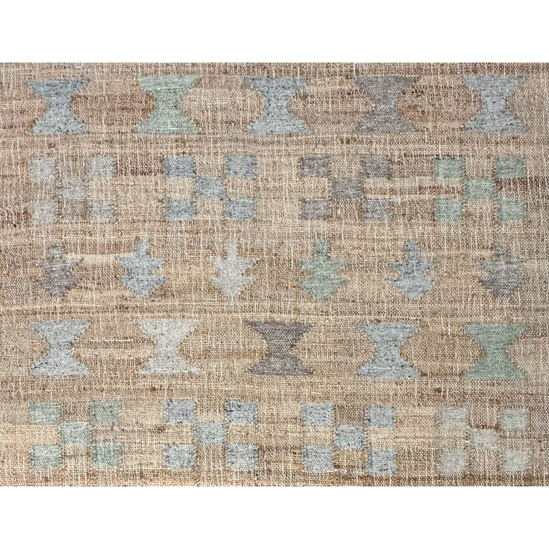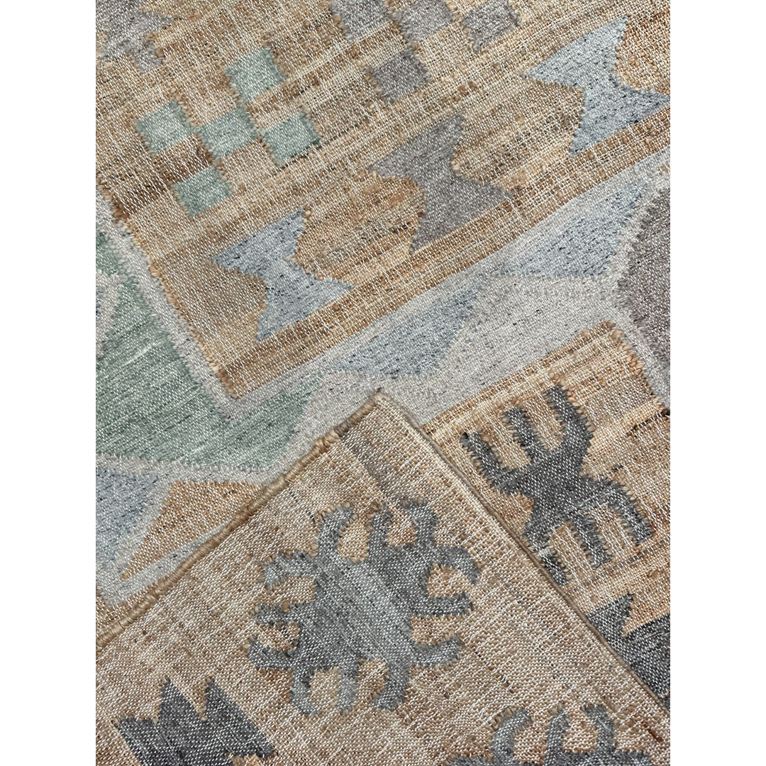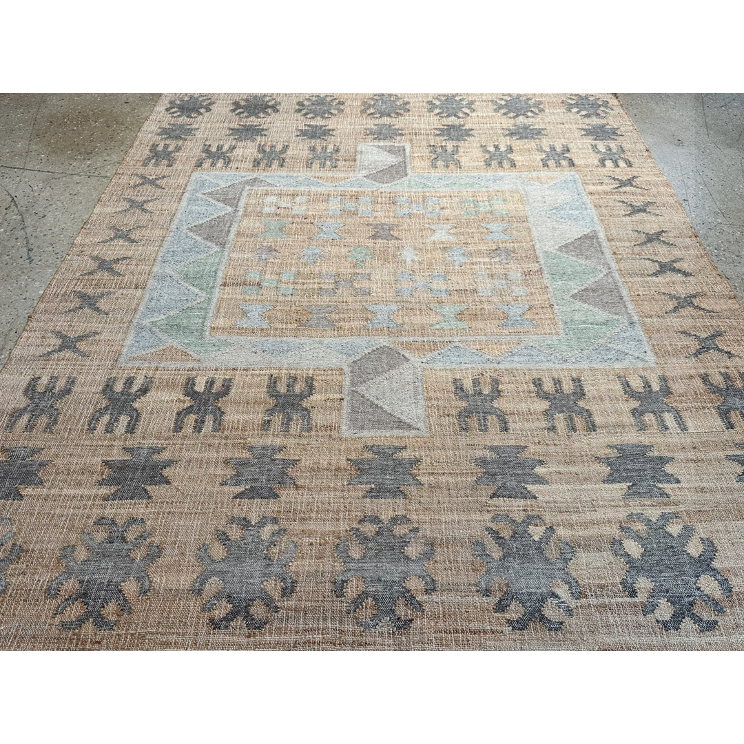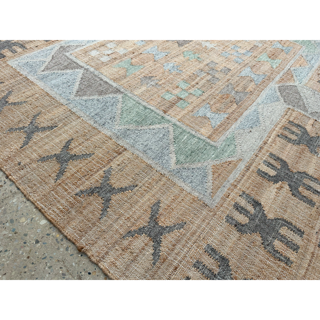 This flatweave rug features a sophisticated tribal-inspired composition organized into concentric rectangular registers. The central field is populated with a series of small, rhythmic geometric charms in muted earth tones, framed by a broad border of larger, stylized motifs in charcoal and soft grey. The design is unified by its architectural symmetry and a warm, natural tan field that emphasizes the organic texture of the materials. Hand-woven from a high-quality blend of natural jute and wool, the rug offers a durable and tactile surface with a refined, artisanal character. Its neutral palette and global-modern aesthetic make it a versatile statement piece, providing a grounded yet elevated foundation for bohemian, rustic-contemporary, or minimalist interiors.