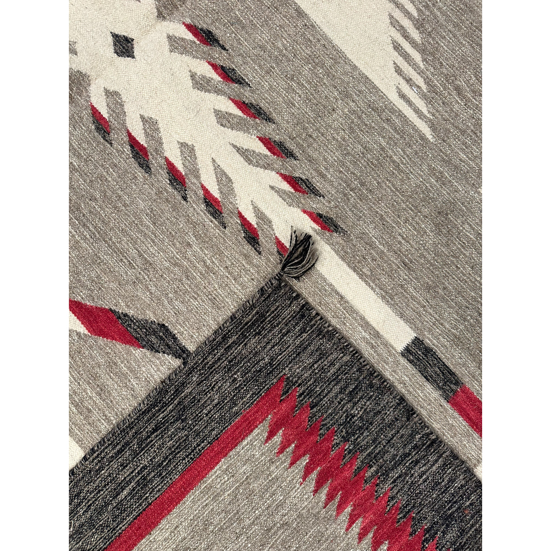 This exceptional Afghan flatweave rug offers a stunning homage to the geometric brilliance of classic Navajo and Southwestern textiles. The expansive, highly symmetrical composition is anchored by a stylized central cross medallion, which branches outward through a network of crisp, stepped linear pathways. Accented by striking serrated diamonds, floating triangles, and bold corner blocks, the intricate pattern is rendered in a high-contrast palette of vibrant crimson red, stark charcoal, and luminous ivory. These dynamic elements pop beautifully against a neutral, heathered taupe field.