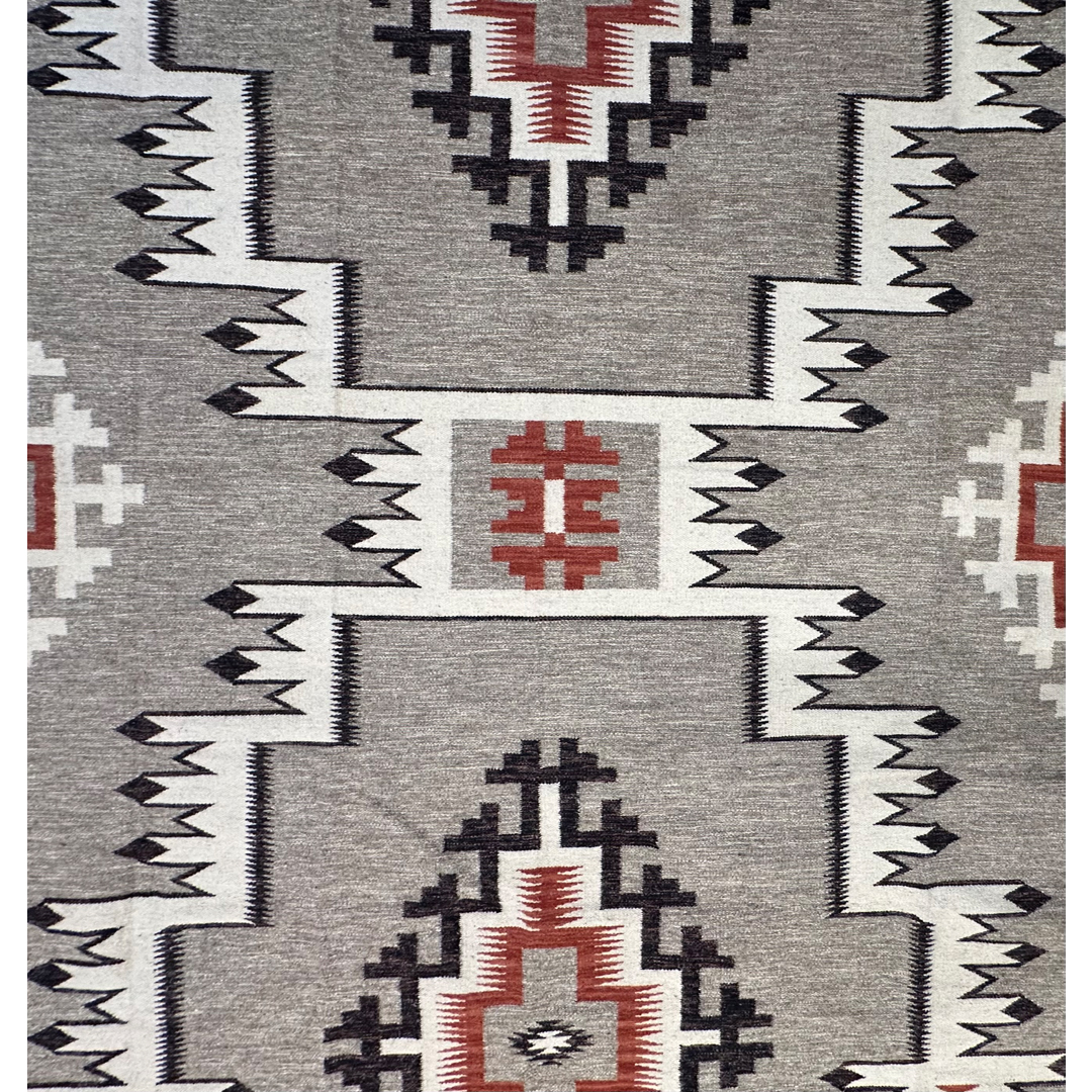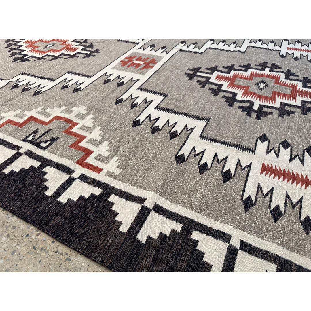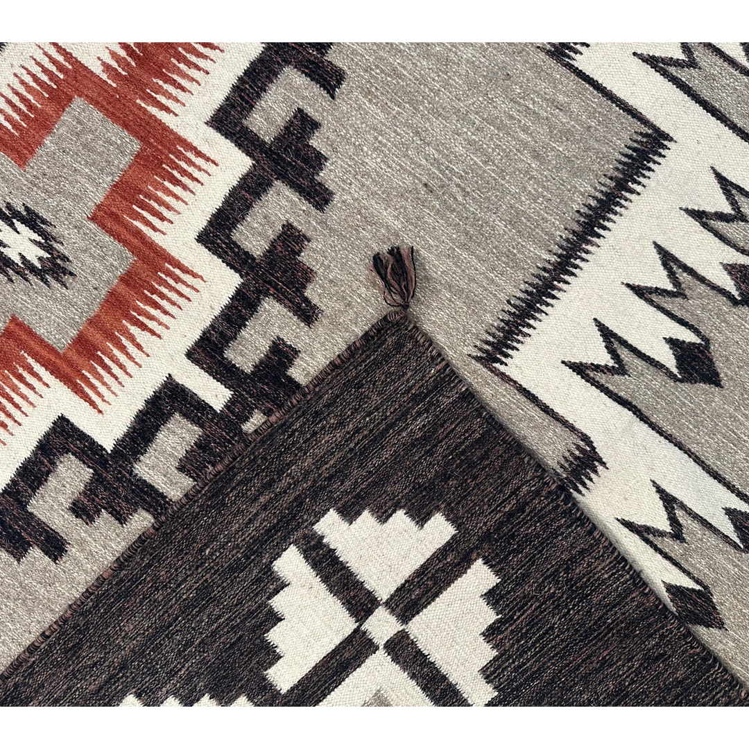 This striking Afghan flatweave rug offers a masterful homage to classic Southwestern and Navajo weaving traditions. The bold, highly graphic composition features a mesmerizing array of serrated, stepped diamonds and striking geometric bracket motifs that beautifully anchor the central field. These dramatic, angular elements create a powerful sense of symmetry and dynamic visual tension, perfectly capturing the iconic aesthetic of traditional desert-inspired textiles. Handwoven in a crisp, high-contrast palette, the softly heathered gray background is powerfully illuminated by stark accents of deep charcoal black, pure ivory, and rich rust red. Crafted with a durable, tight kilim-style weave, this premium wool flatweave provides an incredibly sleek, low-profile foundation.