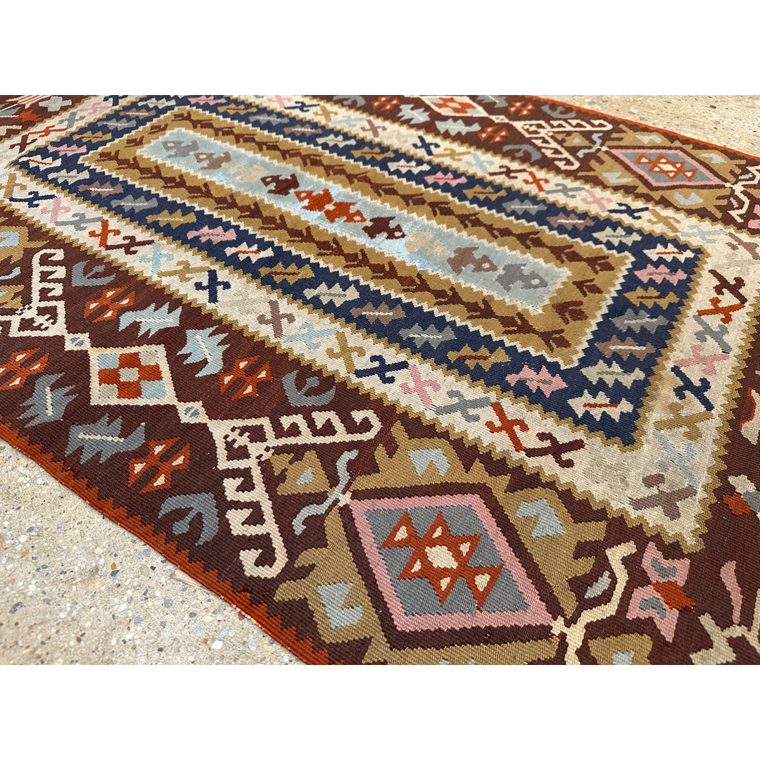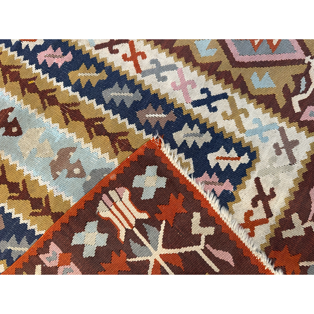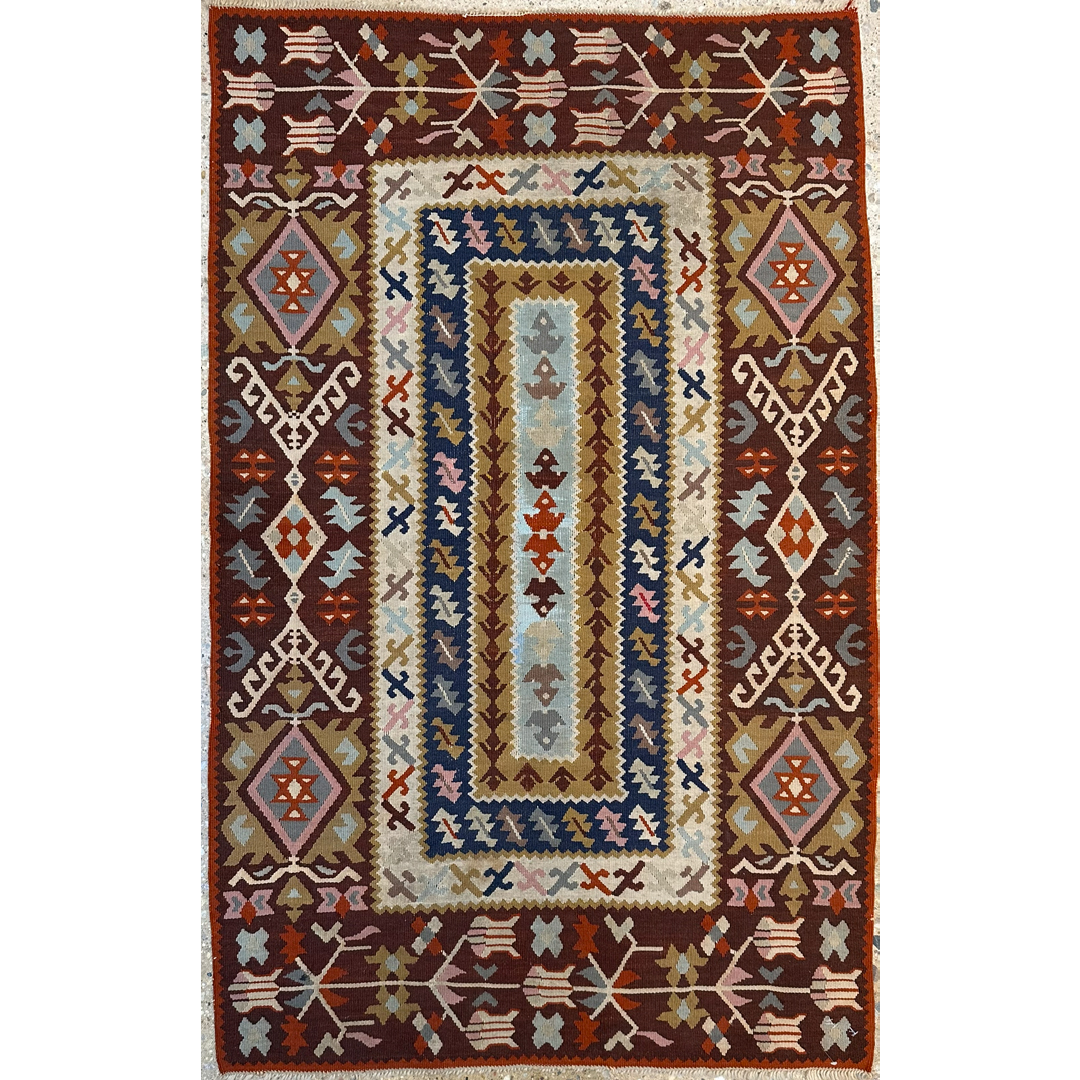 Infuse your space with vibrant color and tribal energy using this fantastic 3′ x 5′ ft. Persian Kilim rug. Expertly hand-woven using a traditional flatweave technique, this piece offers a lightweight and durable alternative to pile rugs. The design features a striking central column of serrated, concentric rectangles in shades of ivory, sky blue, and gold, set against a rich rust and burgundy field filled with geometric latch-hook motifs. Perfect for layering in a kitchen, entryway, or bohemian living area, this authentic tribal rug brings global style and versatile charm to any room.