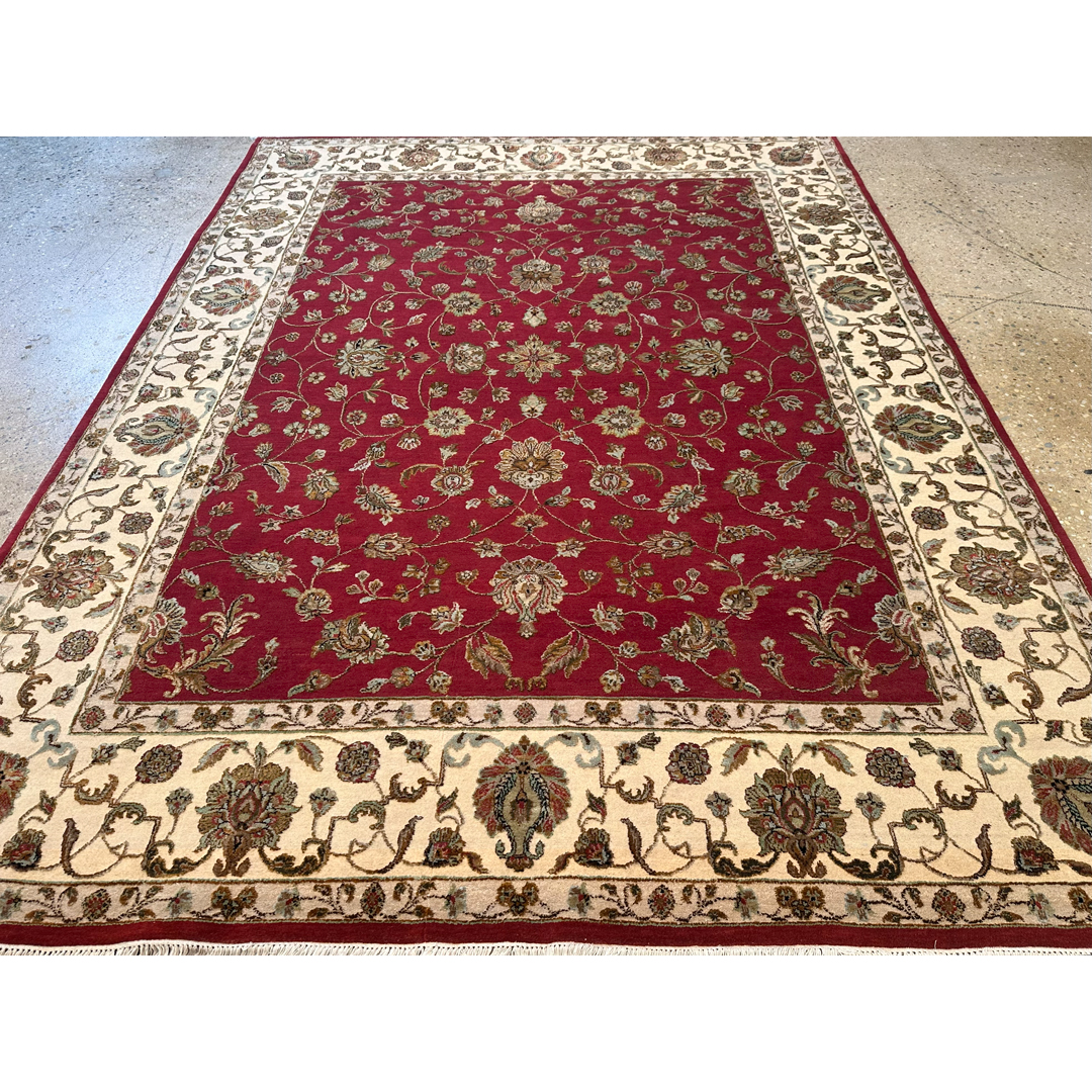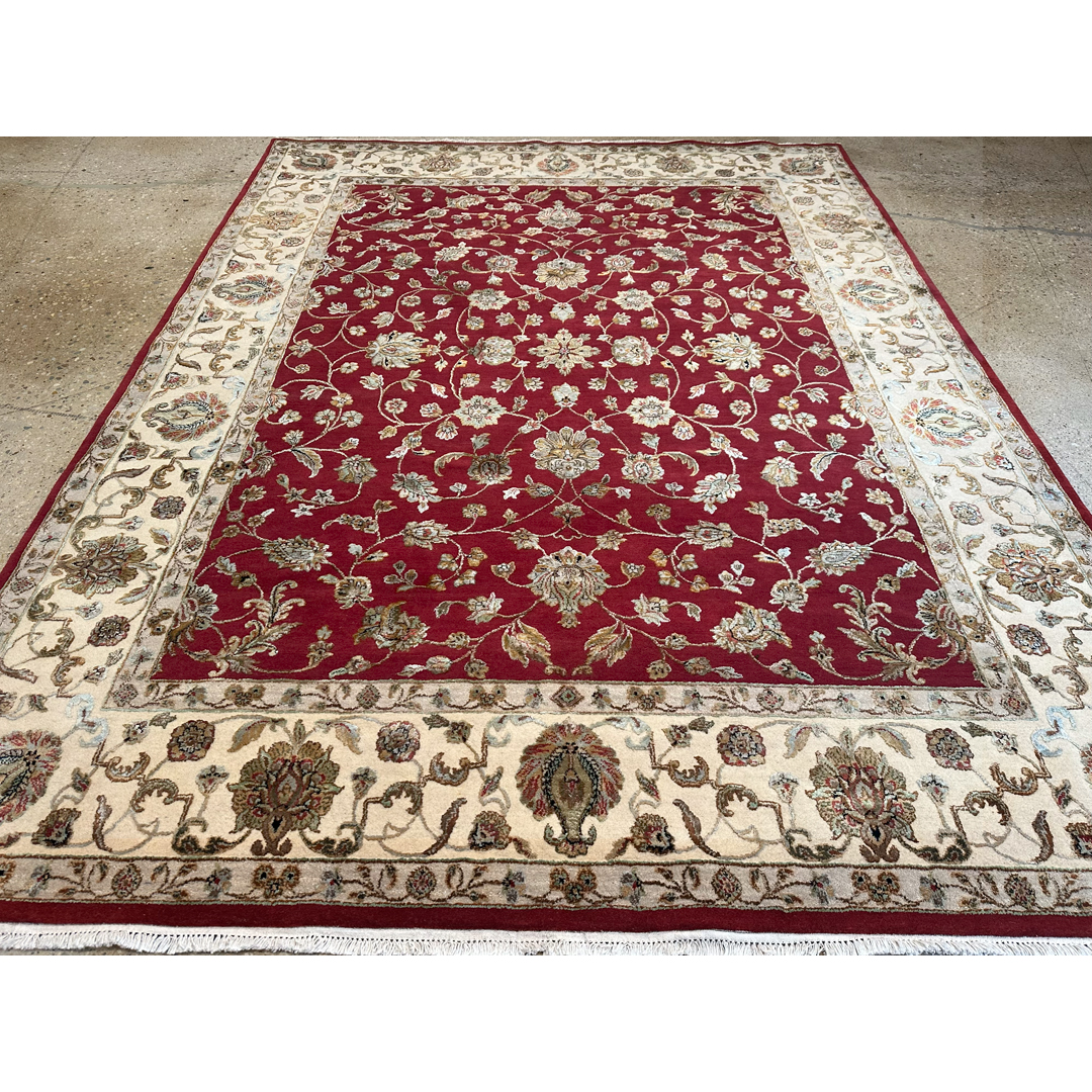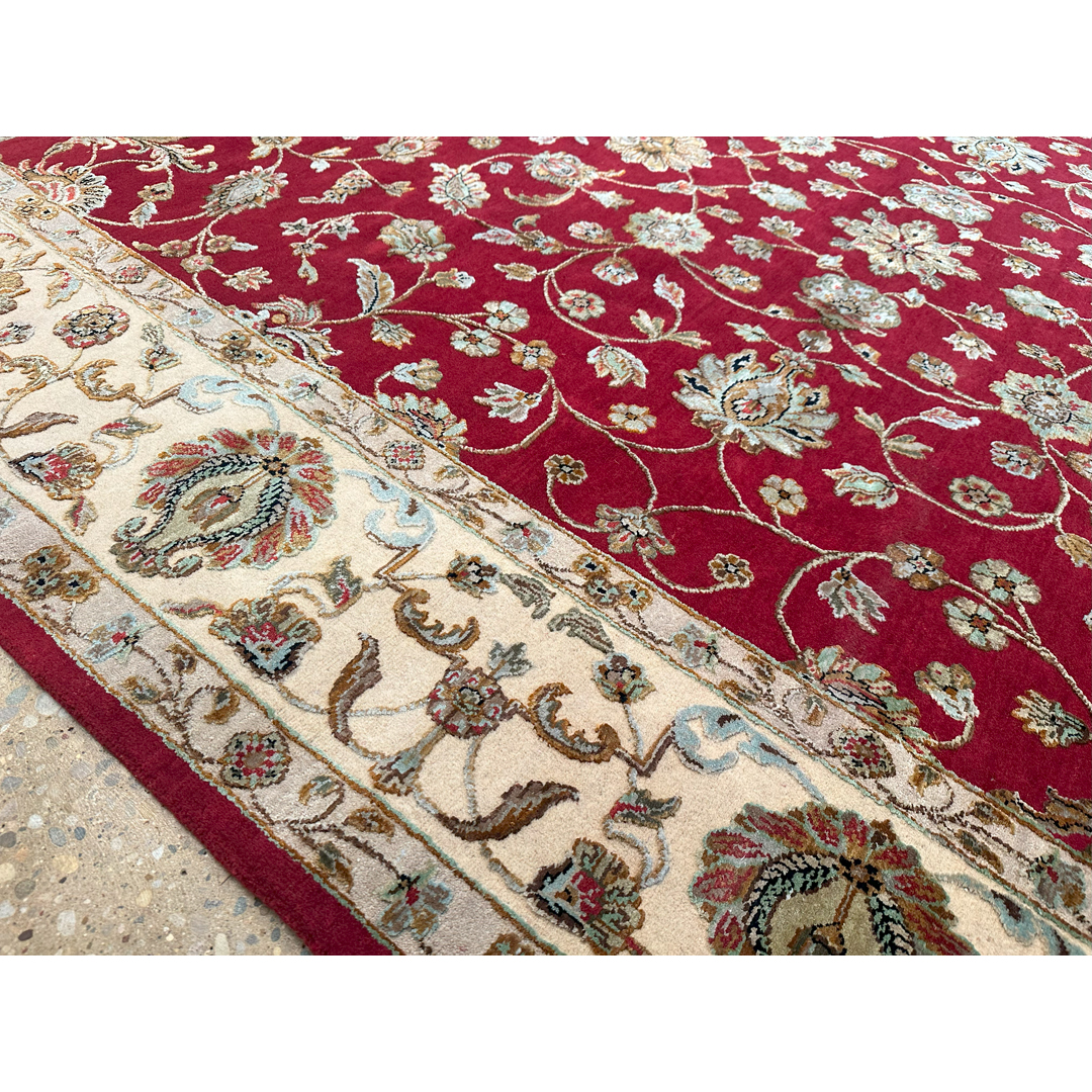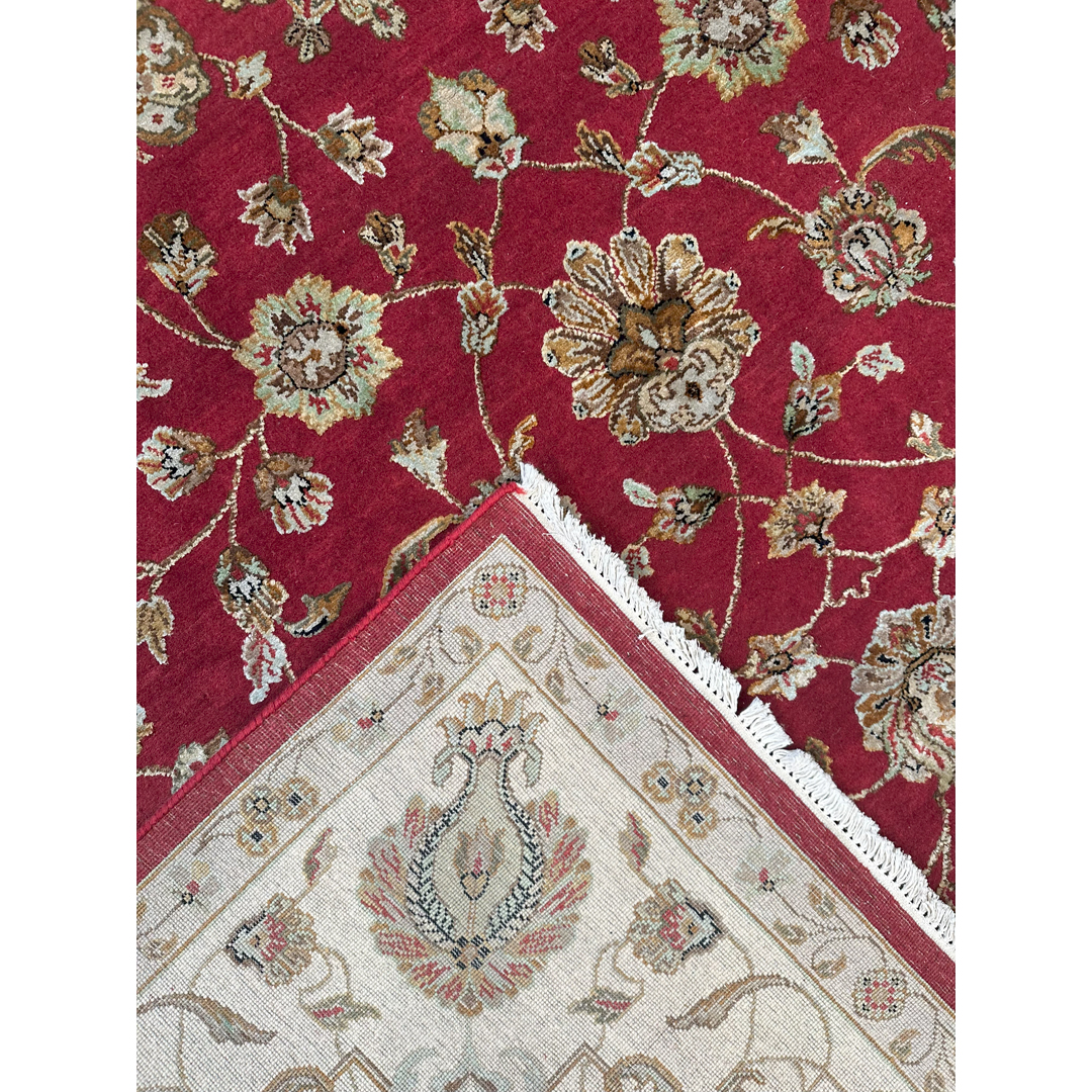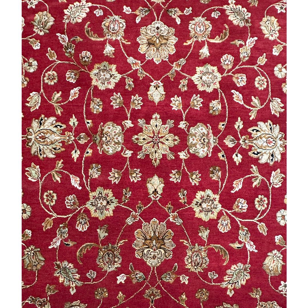 This hand-knotted rug offers a masterclass in transitional design, combining traditional floral artistry with a contemporary material blend. The rich, madder-red field is populated by a sophisticated all-over pattern of scrolling floral palmettes and delicate botanical sprays. The motifs are rendered in a luminous palette of gold, ivory, and soft sage, elevated by the addition of bamboo silk, which provides a high-end sheen and a multidimensional texture.