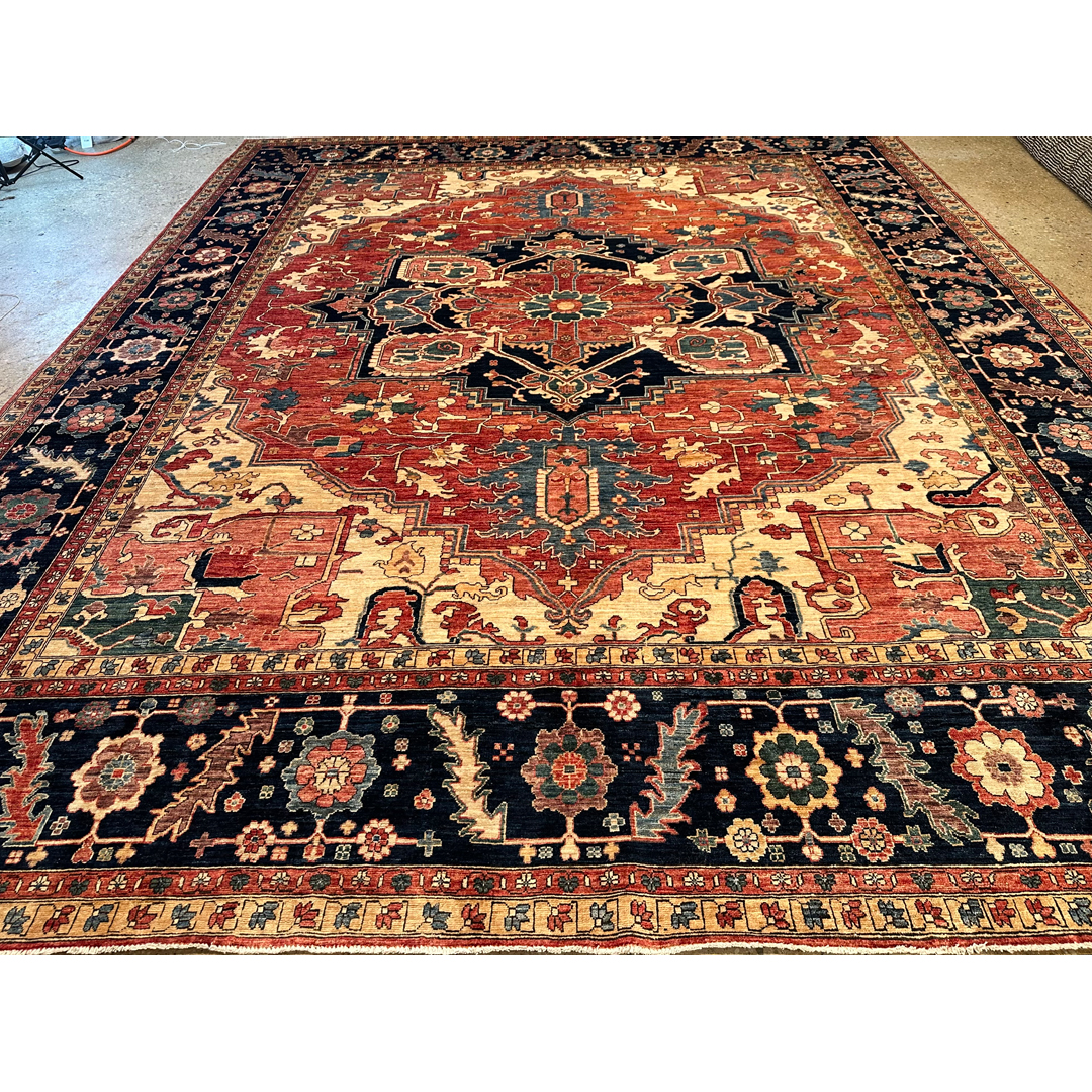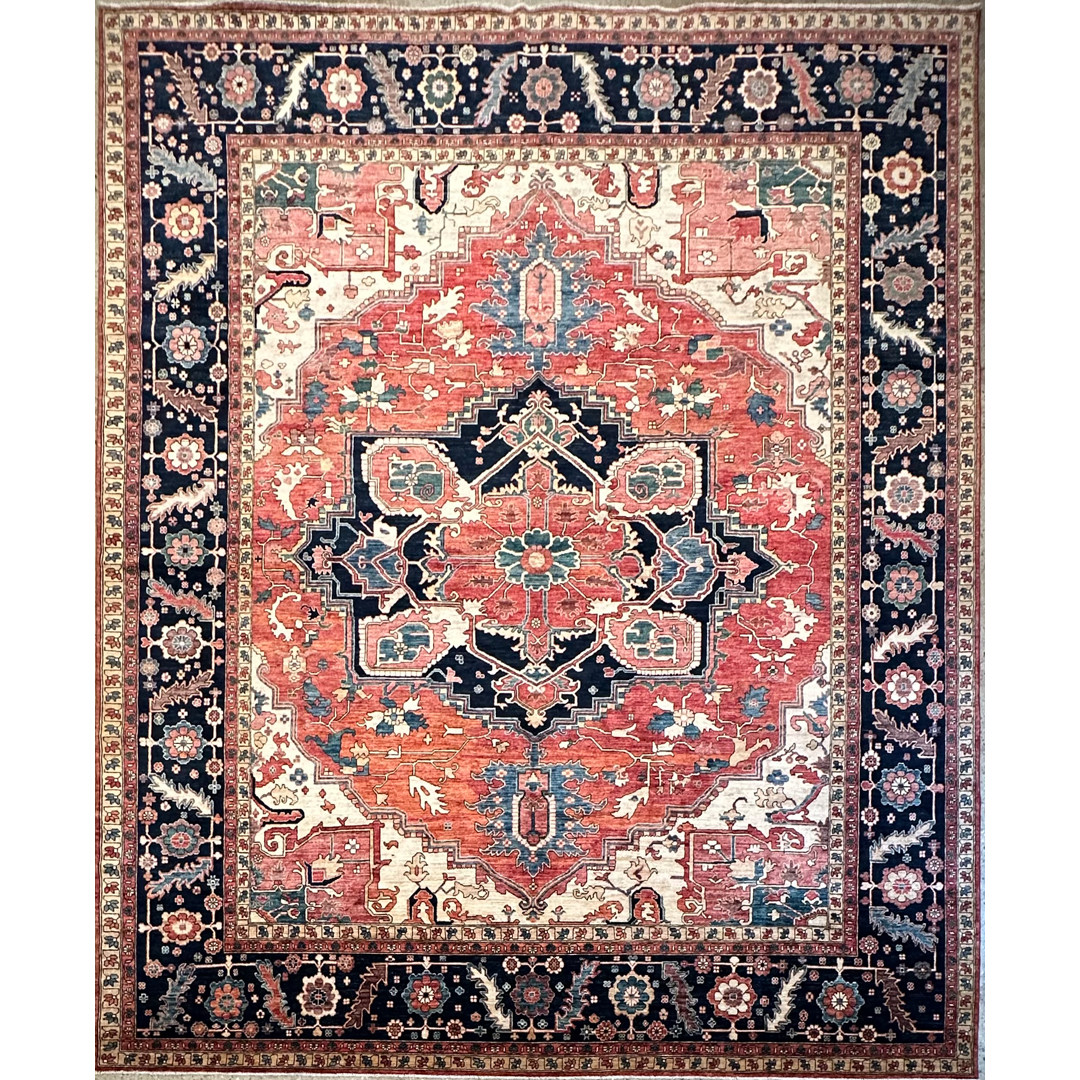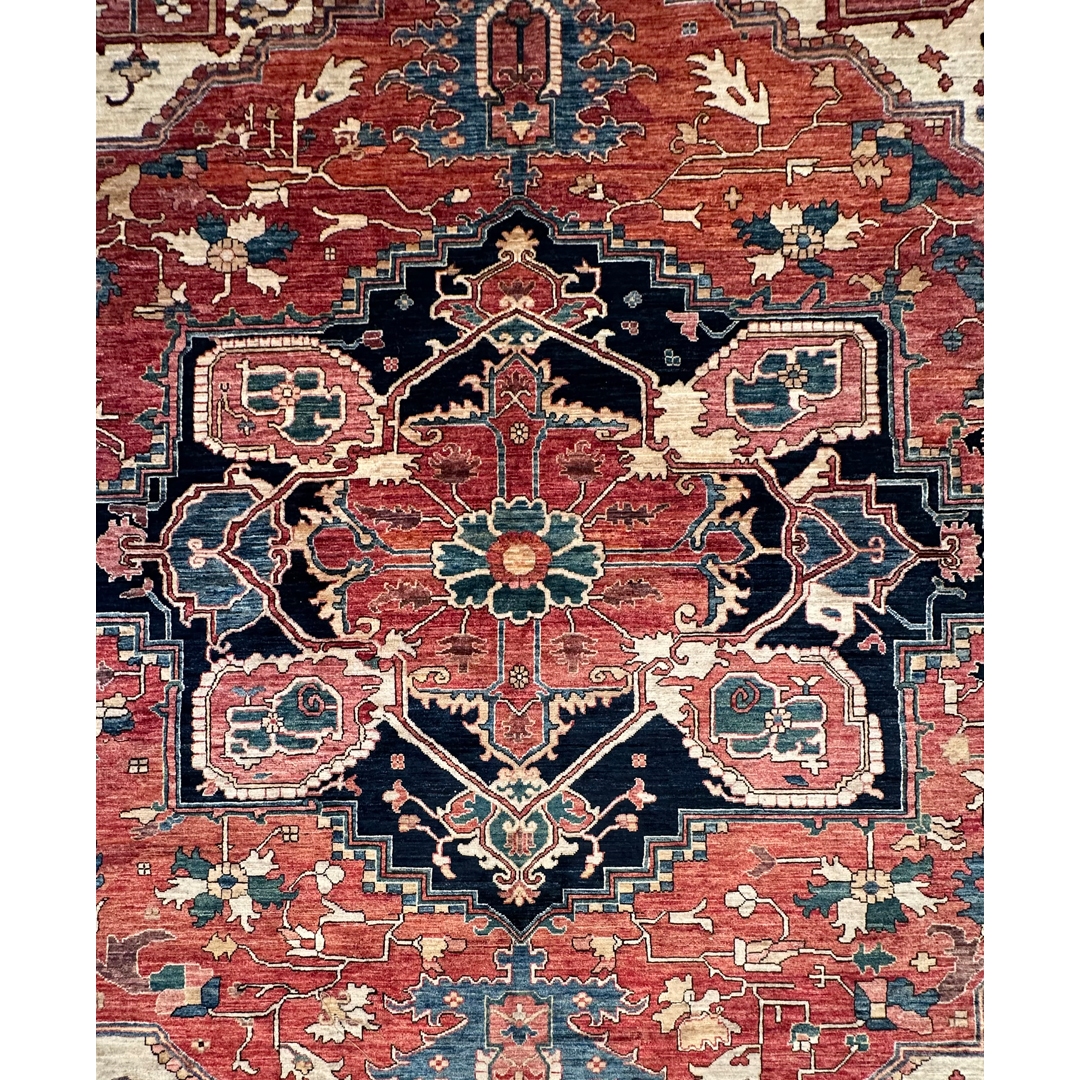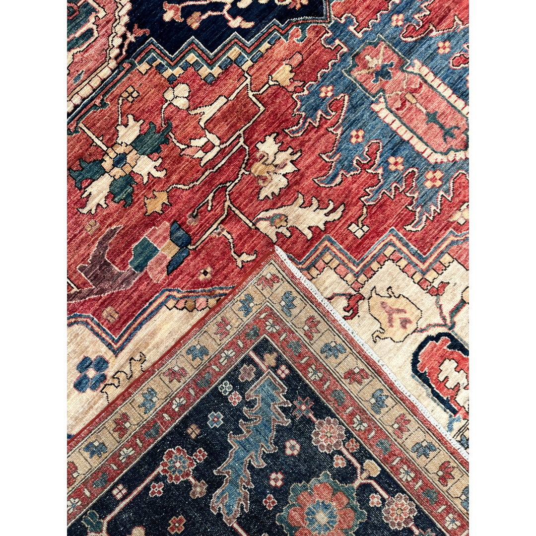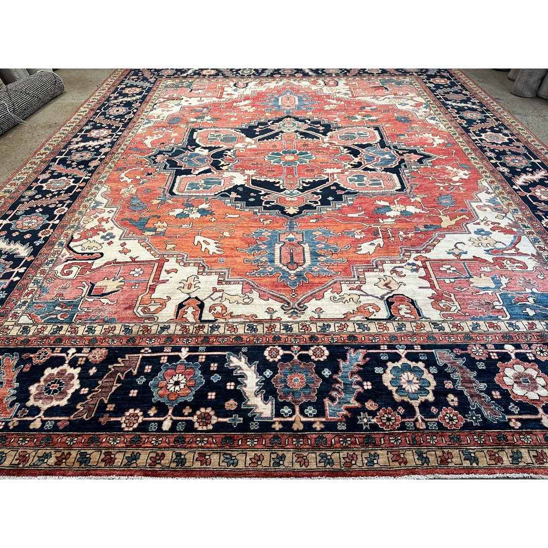 Create a bold foundation of classic grandeur and welcoming warmth with this stunning Serapi–inspired rug, newly made in Afghanistan. Measuring 12’2″ x 15’3″, this expansive oversized area rug is perfectly suited for anchoring a great room, formal living space, or large dining area with statement-making presence. It features a dramatic, oversized central medallion framed by angular botanical motifs and a richly detailed border, echoing the iconic geometry and architectural balance of traditional Serapi designs. Its saturated yet harmonious color palette blends warm brick red and coral tones with deep navy, soft ivory, and accents of teal, creating striking contrast with timeless appeal. Expertly handwoven with a dense, resilient pile, this rug delivers luxurious comfort underfoot and enduring craftsmanship, bringing refined character to both classic and transitional interiors.