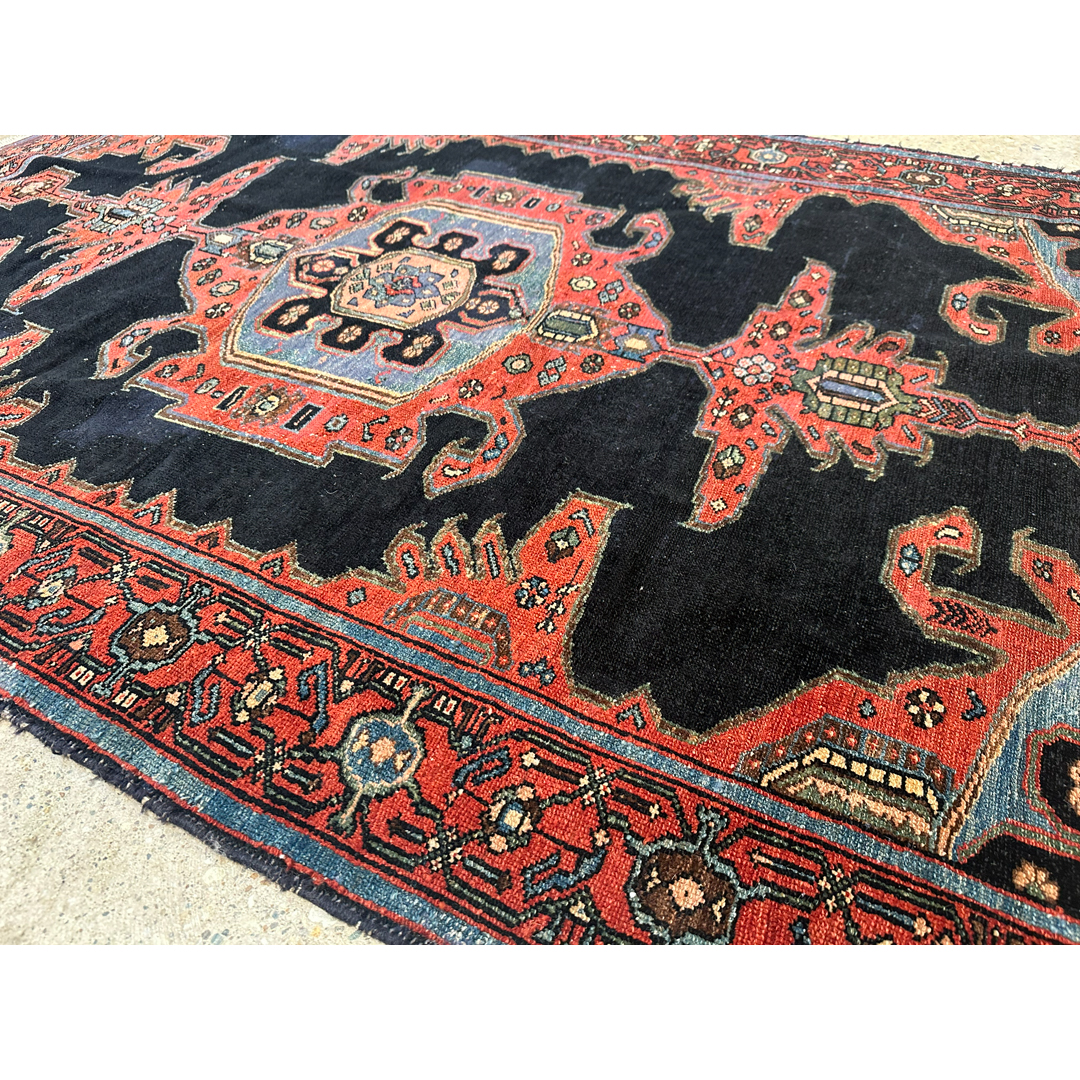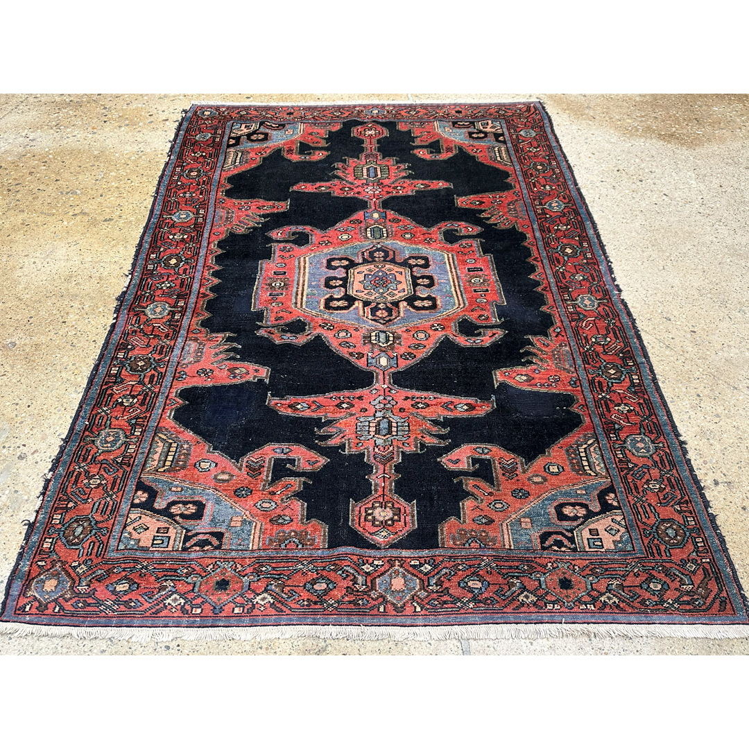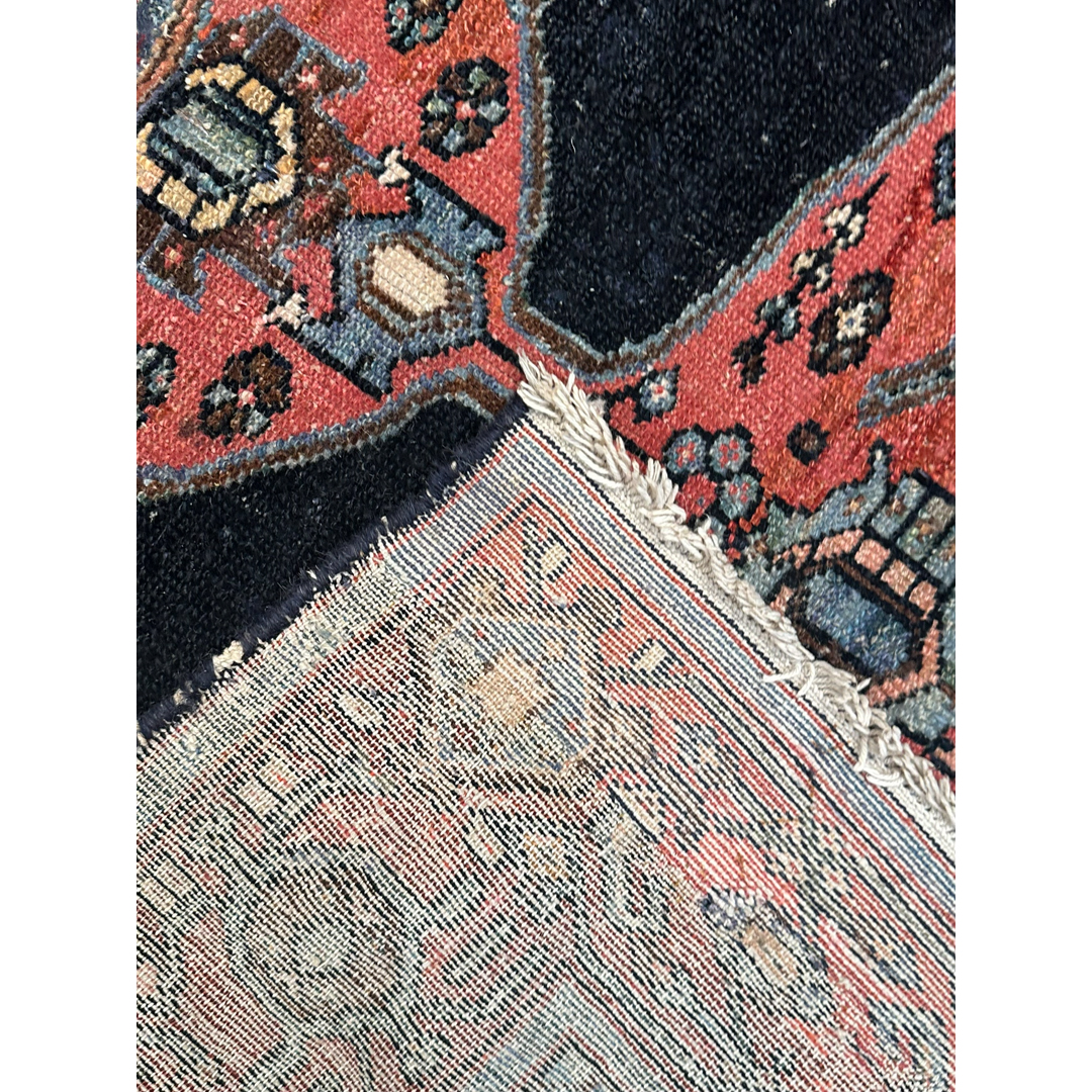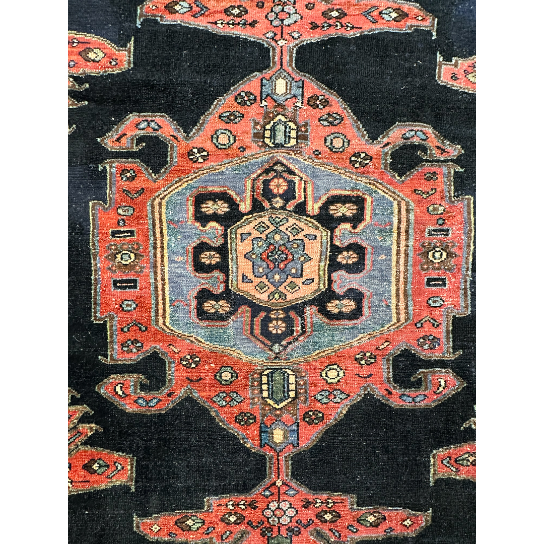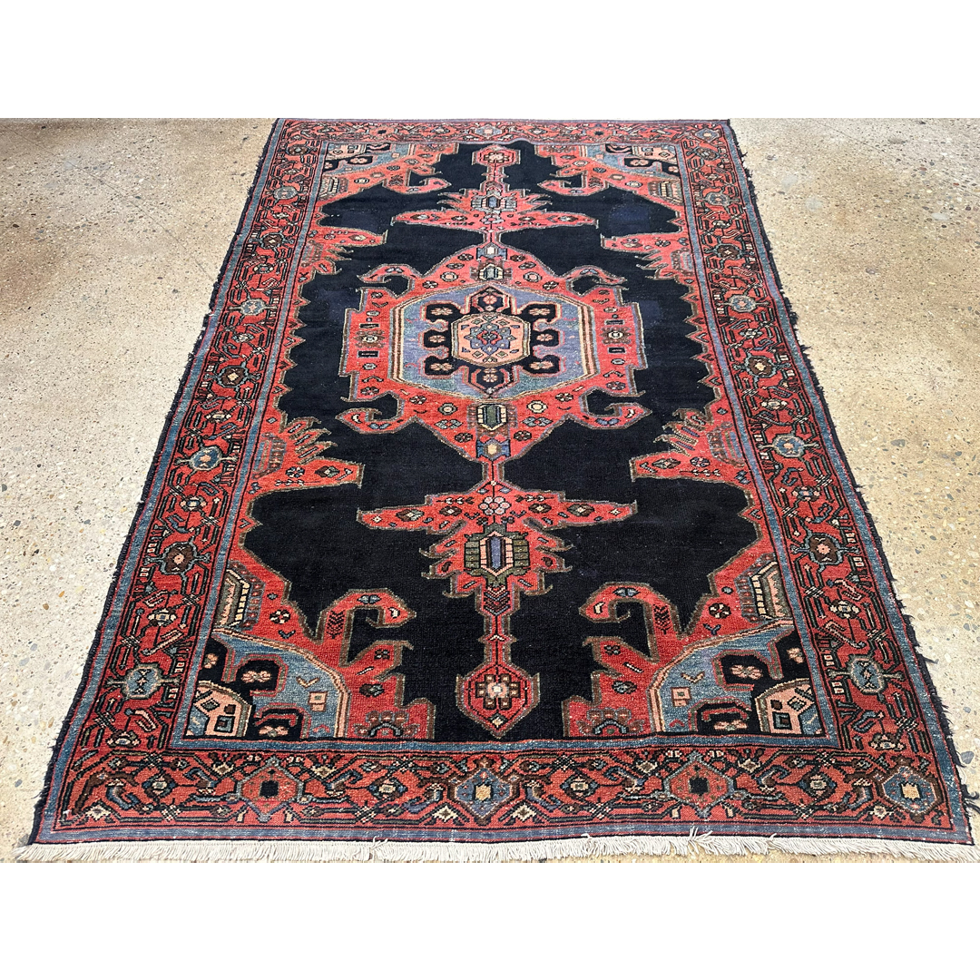 This antique Malayer rug, exhibiting the refined Farahan influence, features a powerful and high-contrast geometric composition. The deep indigo field serves as a dramatic backdrop for a large, triple-layered central medallion in tones of terracotta, powder blue, and cream. Flanking the central medallion are two elongated, stylized vertical pendants, while the corners are anchored by bold, angular spandrel motifs that echo the rug’s architectural heritage. Known for their sophisticated tribal designs and exceptional wool quality, this Malayer piece is hand-knotted with a precise, low pile that highlights the clarity of its geometric floral borders. The rich, natural dye palette and balanced symmetry make this an exquisite collector’s piece, suitable for adding a sense of history and warmth to a study or a transitional entryway.