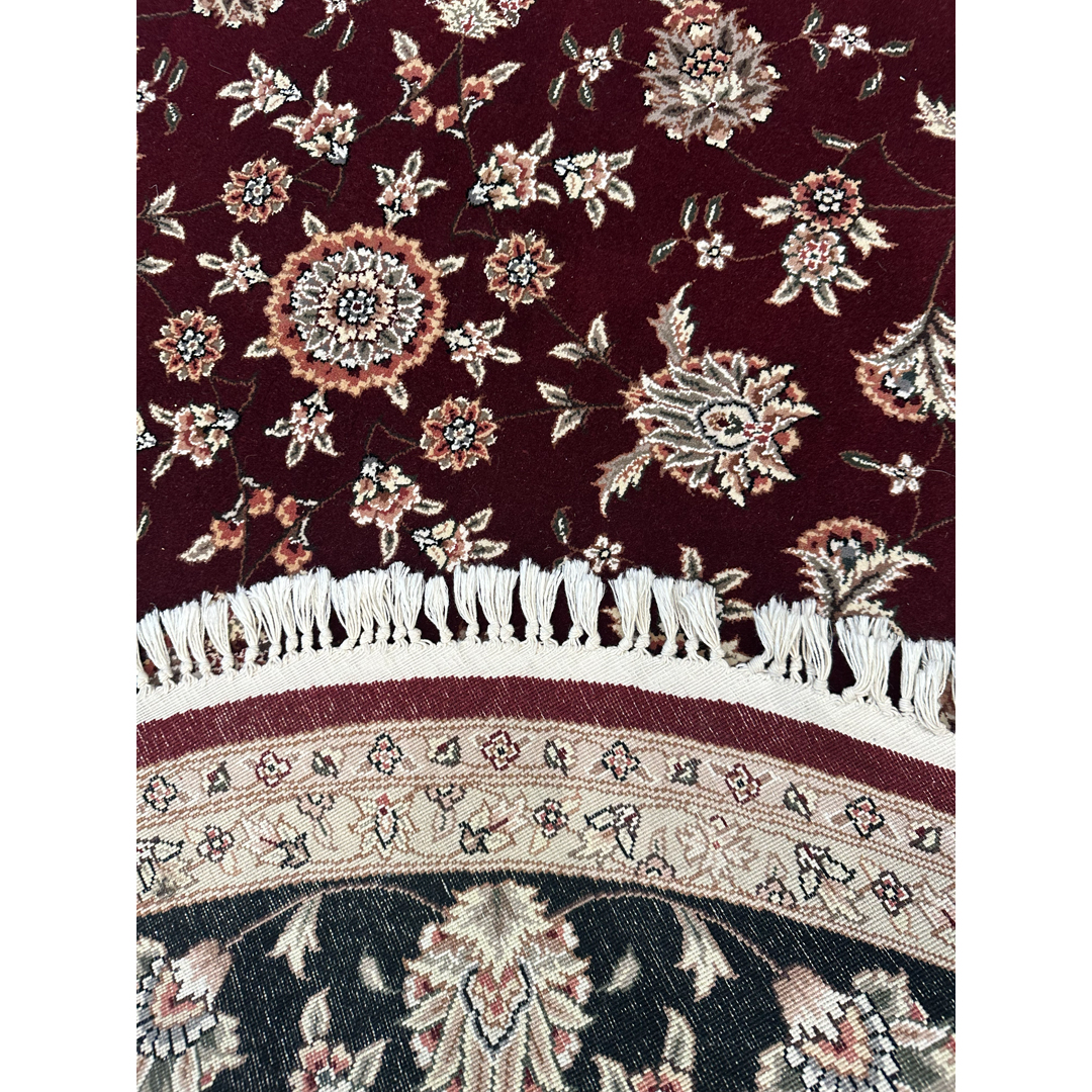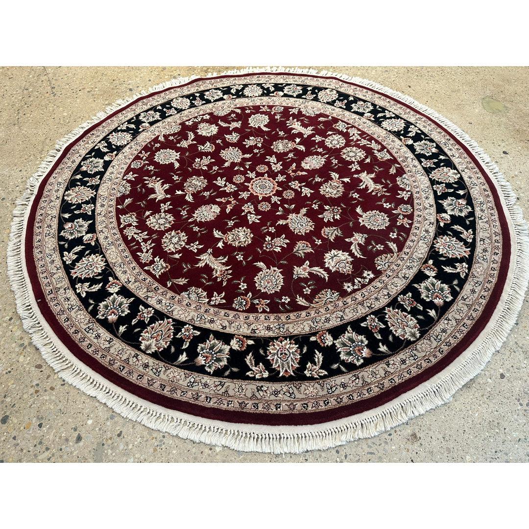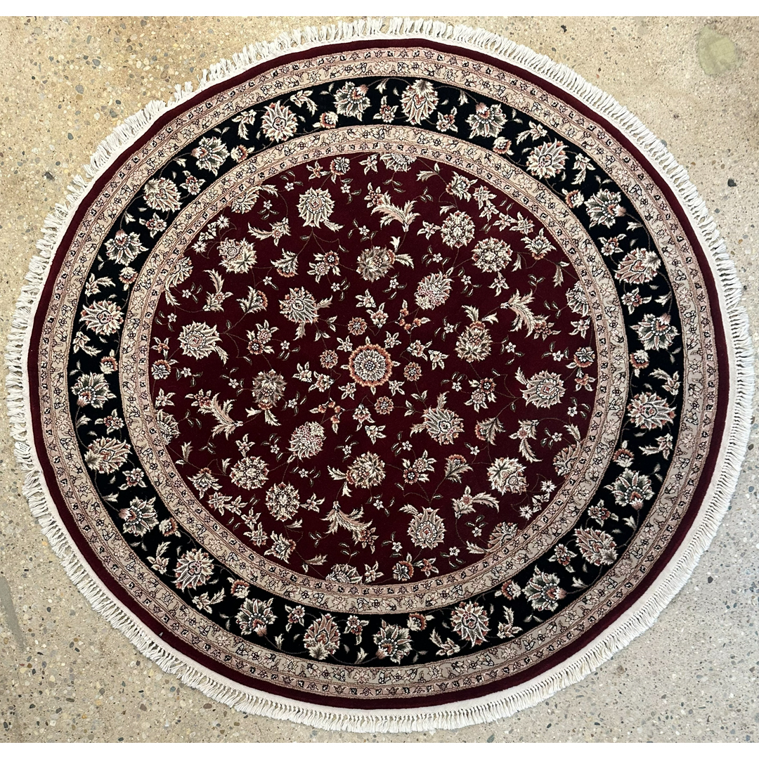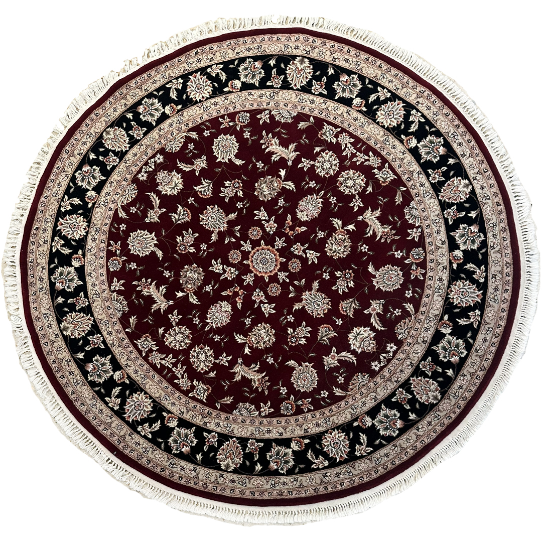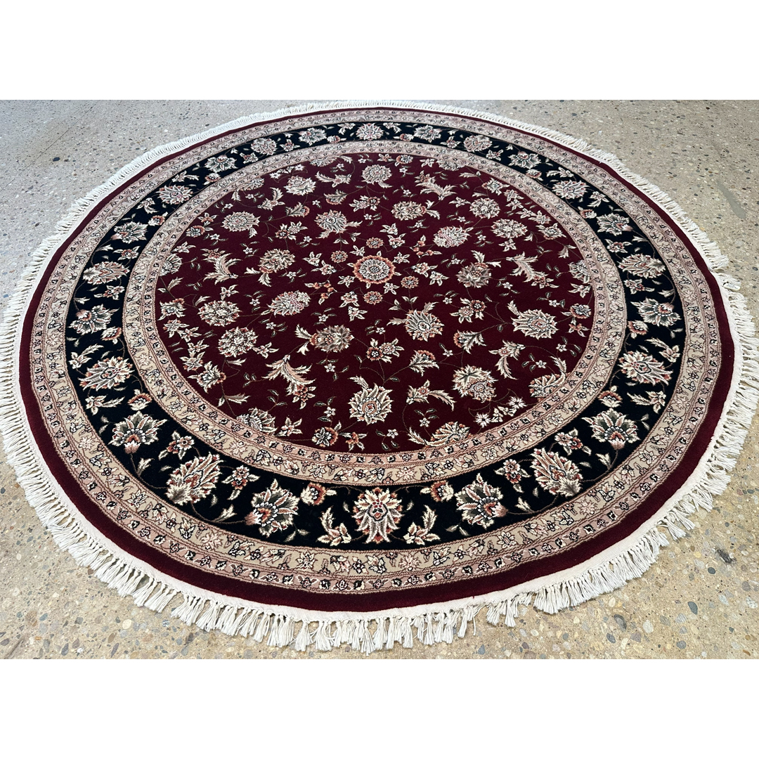 This exquisite round handknotted rug exudes formal elegance and luxurious craftsmanship. The perfectly circular, radiating composition is anchored by a delicate central floral rosette. From this focal point, a mesmerizing, symmetrical array of intricately detailed botanical vines, scrolling arabesques, and finely rendered floral palmettes gracefully expands outward. The rich, deeply saturated field of dark crimson-burgundy provides a regal backdrop for the luminous, high-contrast motifs rendered in soft ivory, warm taupe, and pale sage.