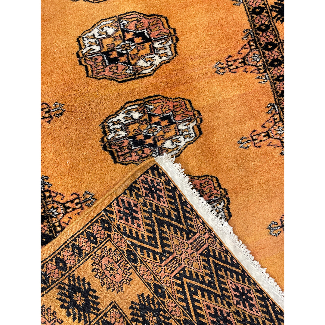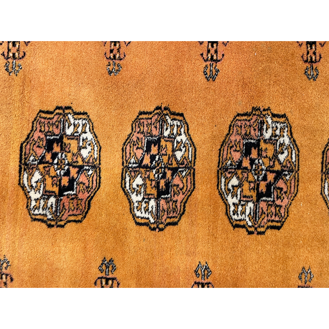 This exquisite 1960s vintage Princess Bokhara rug offers a rare and sophisticated departure from the traditional deep reds often found in this style. Featuring a lustrous, honey-gold field that radiates warmth, the rug is anchored by rows of precision-woven octagonal guls in contrasting tones of charcoal, soft rust, and cream. Woven in Pakistan, the Princess designation speaks to its fine craftsmanship and tight weave, creating a velvety texture that feels luxurious underfoot. Measuring 3′ x 5’5″ ft., this versatile piece is perfectly scaled for a bedside anchor, a welcoming entryway, or a brightening accent in a hallway. Its golden palette acts as a neutral with personality, capable of bringing a soft, sun-washed elegance to both modern and traditional interiors.