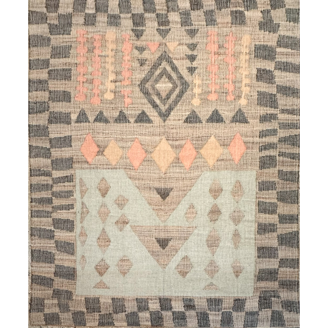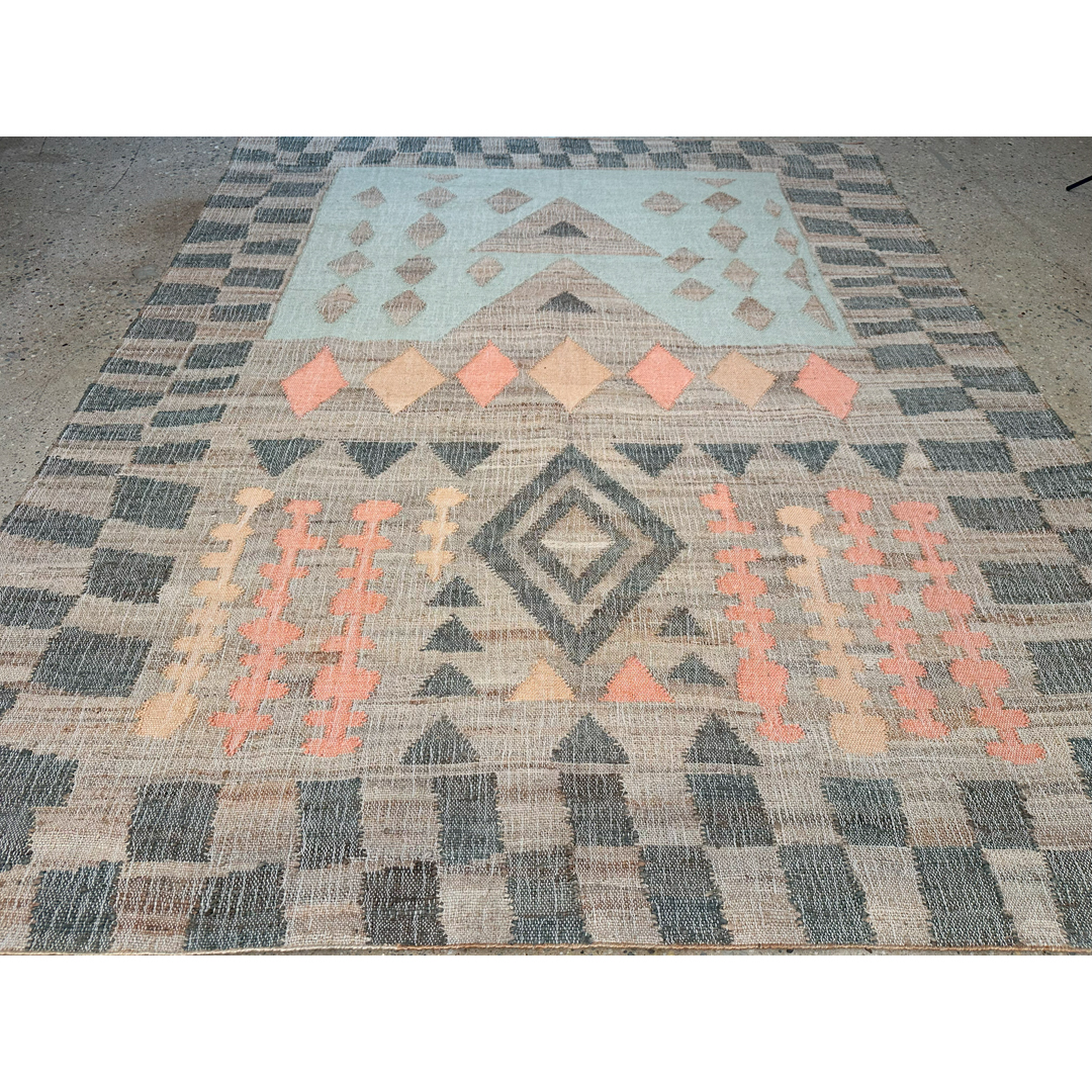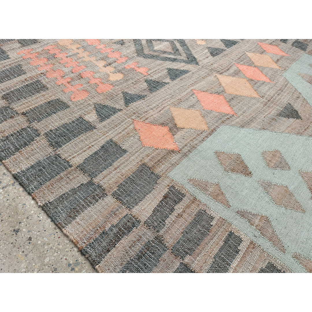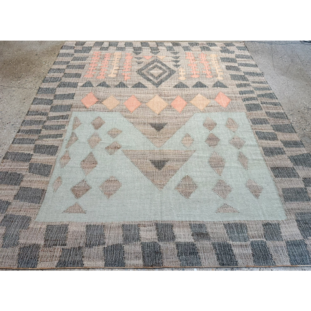 This flatweave rug features a dynamic, multi-panel geometric composition inspired by traditional tribal aesthetics. The design is organized into distinct horizontal registers, featuring a prominent central diamond medallion, a row of terracotta-toned rhombuses, and a series of smaller geometric charms set against a soft sage-green block. The entire piece is framed by a broad, checkerboard-style border in charcoal and tan, creating a strong architectural presence. Hand-woven from a sustainable blend of natural jute and wool, the rug offers a rugged, organic texture that highlights its artisanal craftsmanship. Its earthy palette of clay, sage, charcoal, and natural tan makes it a versatile statement piece, providing a grounded yet sophisticated foundation for global-modern, bohemian, or rustic-contemporary interiors.