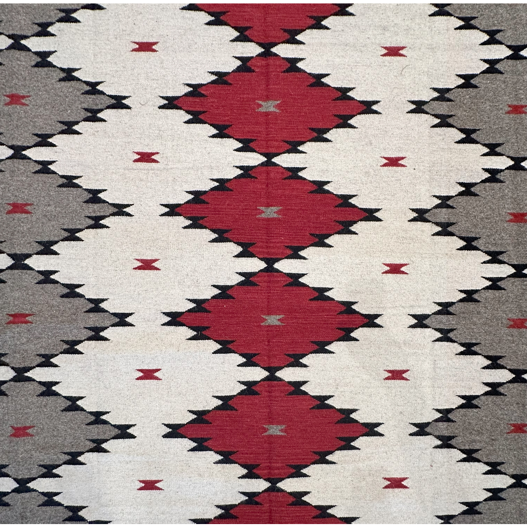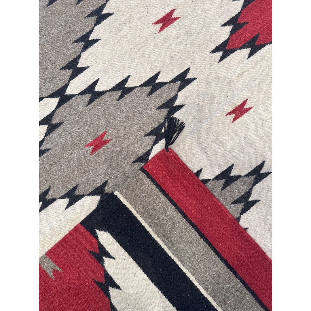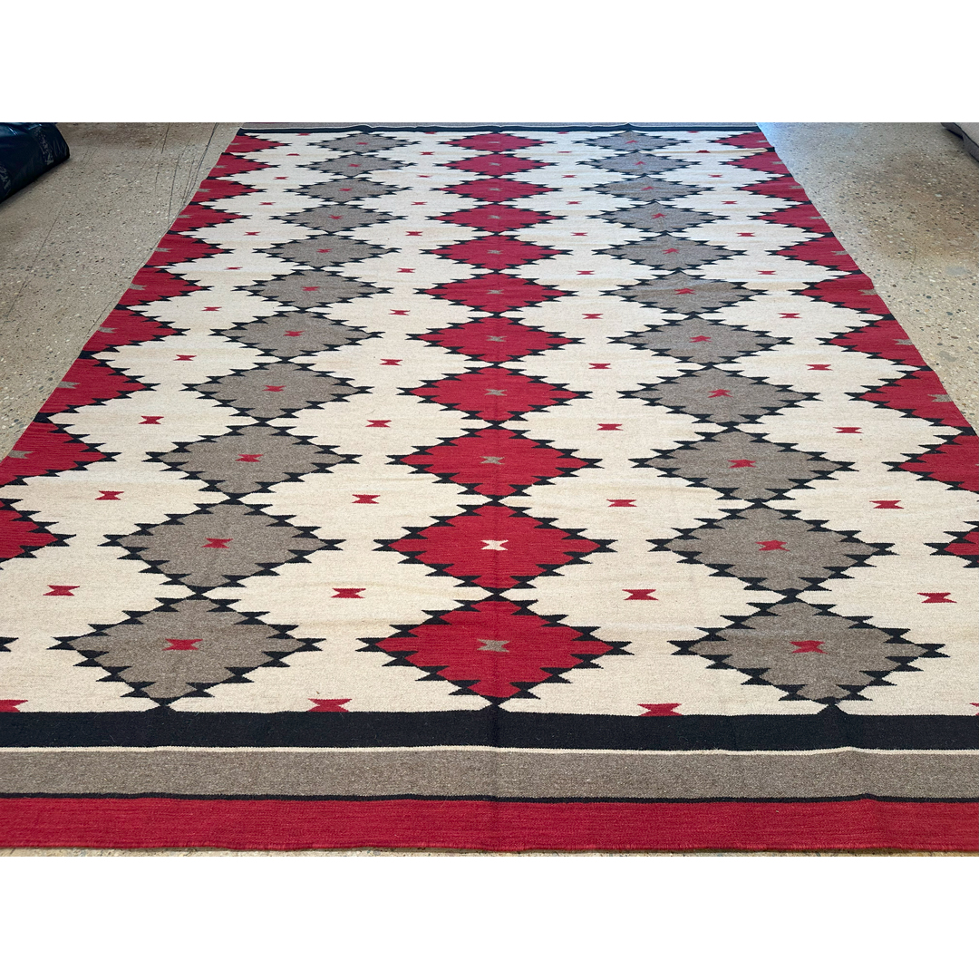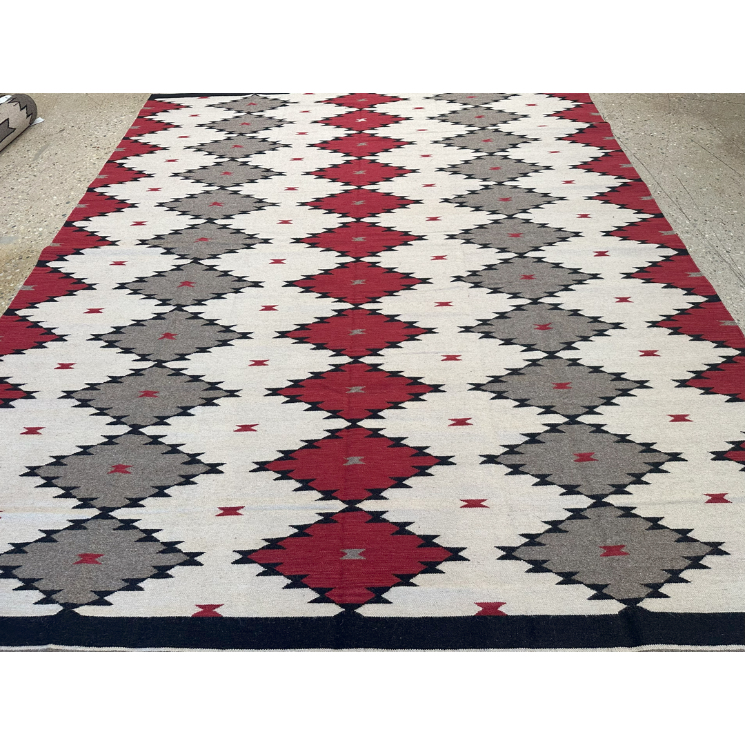 Make a striking architectural statement with this expansive 9×12 flatweave carpet. Inspired by the iconic geometry of traditional Navajo textiles, this modern wool rug brings a sophisticated, rustic-chic energy to the contemporary home. The design features a bold, rhythmic progression of serrated diamonds rendered in a high-contrast palette of deep crimson, charcoal, slate grey, and crisp ivory.