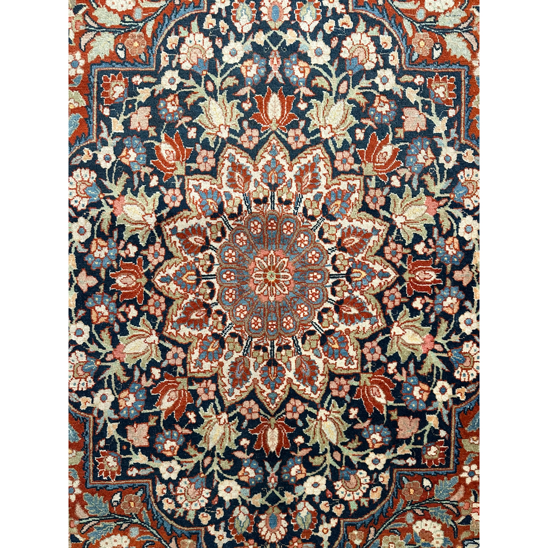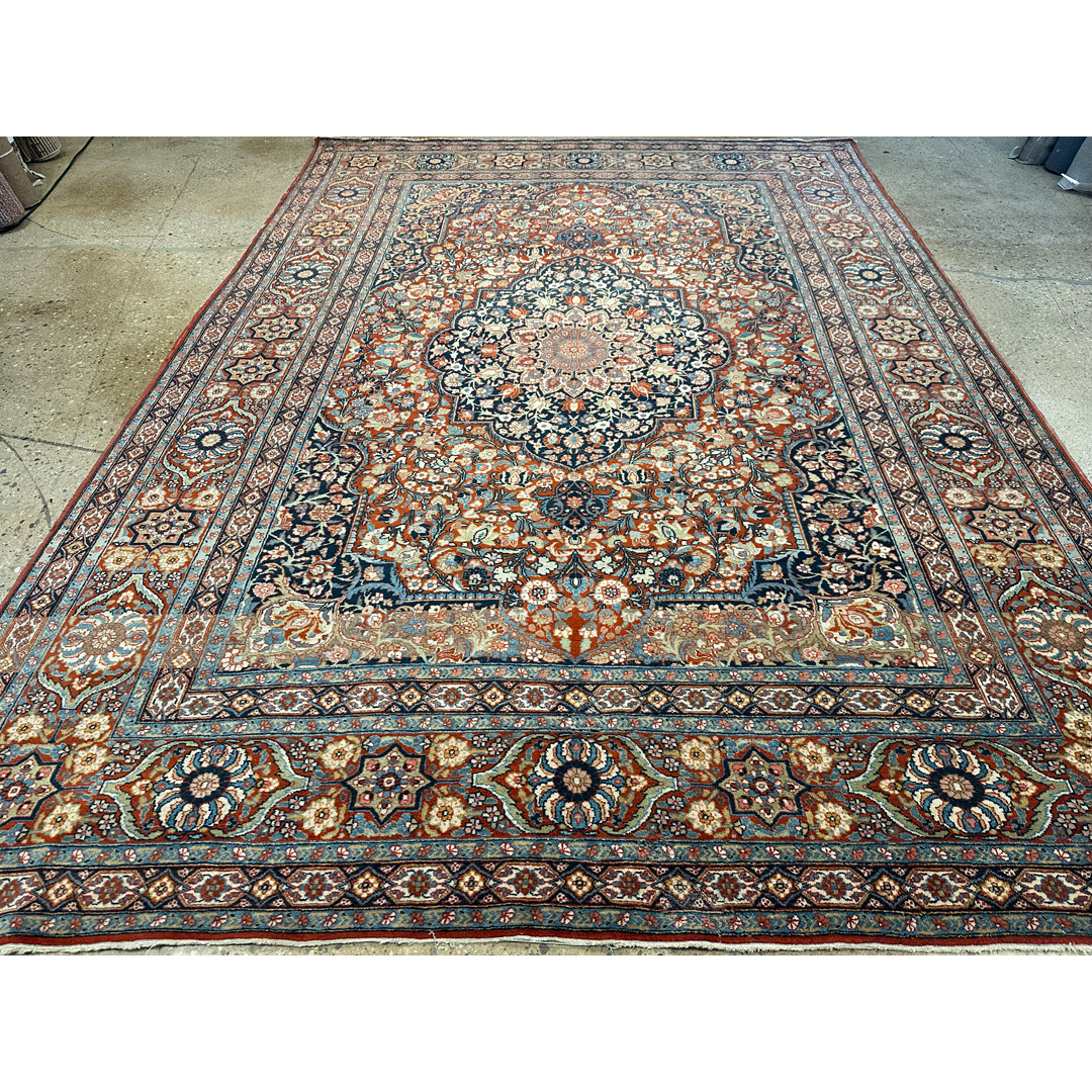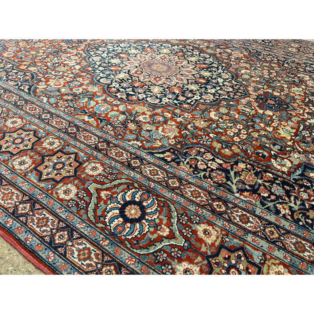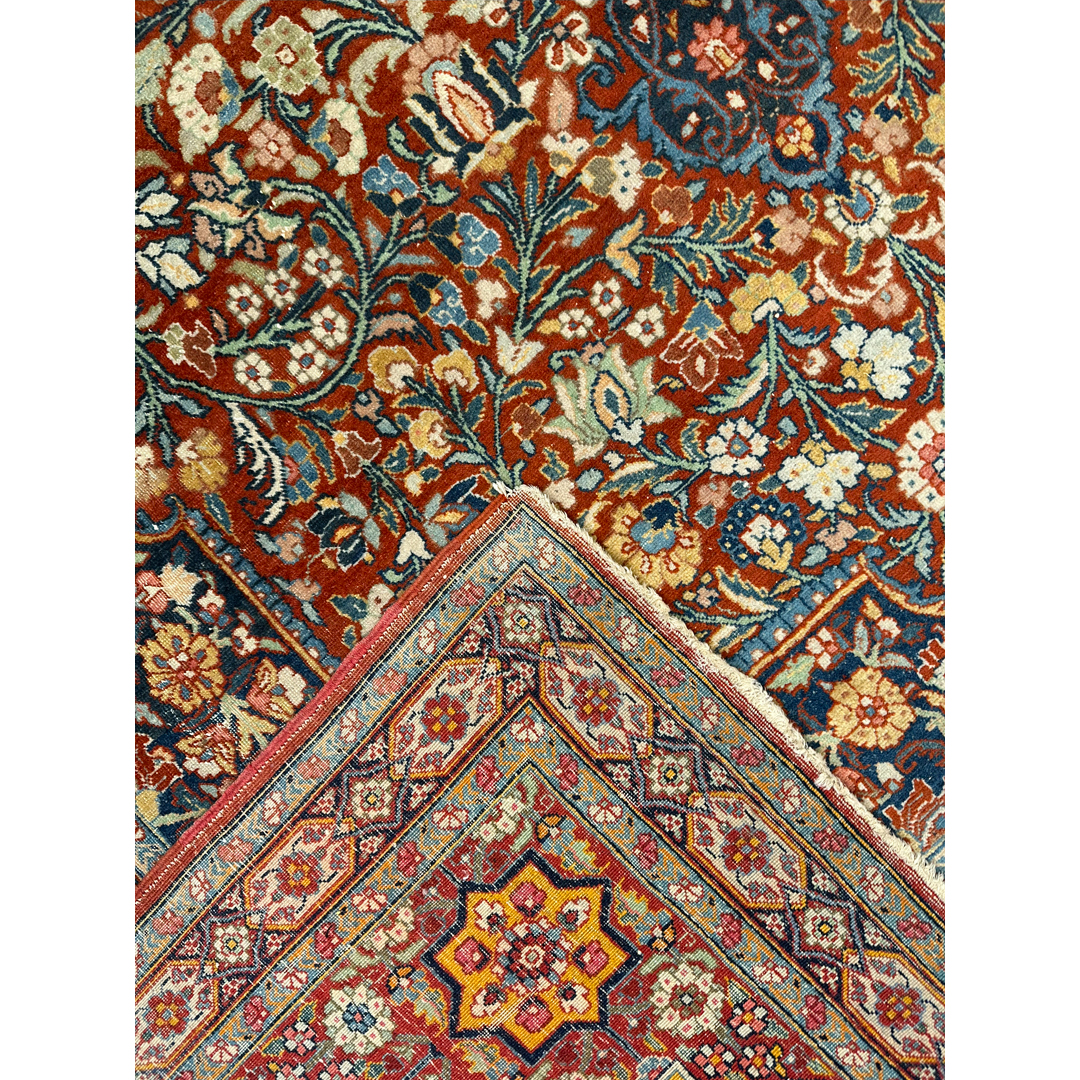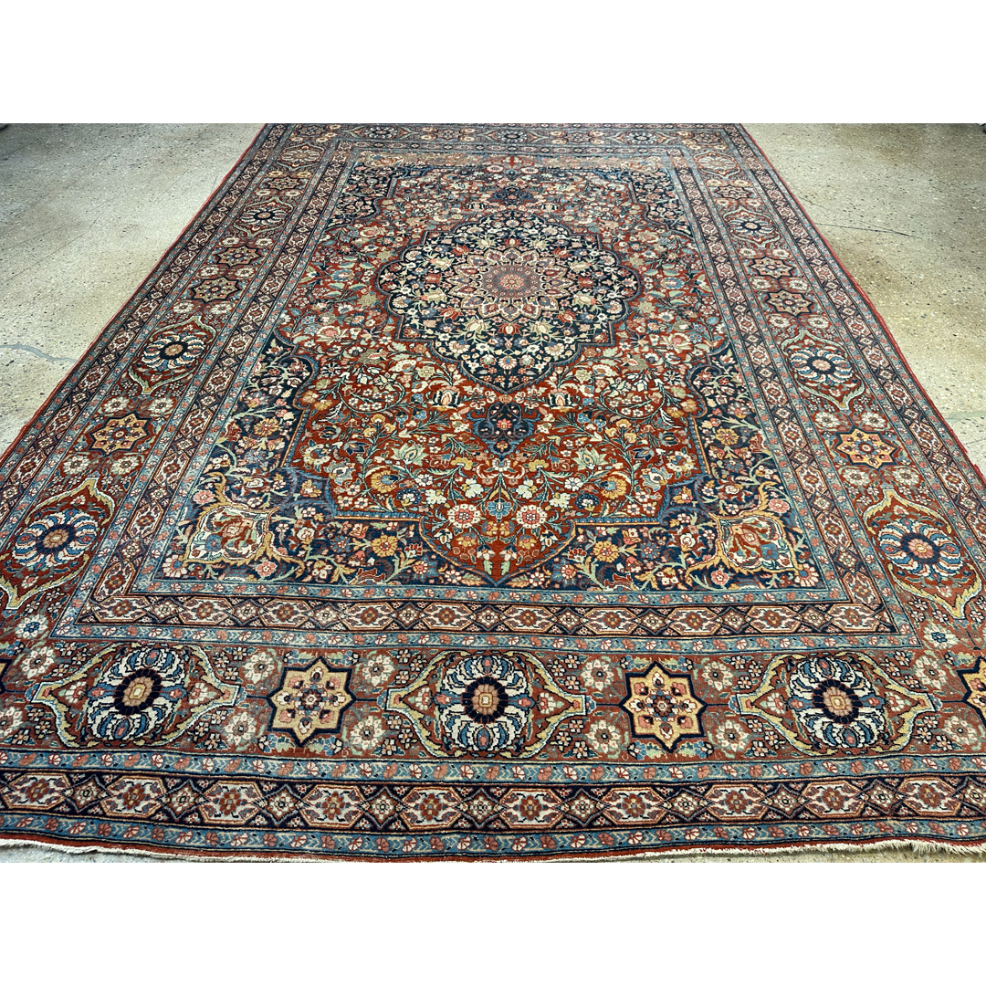 Bring a piece of woven history into your home with this handsome 9′ x 13′ ft. antique Persian rug attributed to the master Haji Jalili period. Hand-knotted in the 1910s, this exceptional carpet features a warm, coppery rust field that provides a sophisticated foundation for the room. The design is centered on a magnificent, multi-lobed medallion rendered in contrasting shades of ivory, midnight blue, and sage, surrounded by a field densely packed with intricate floral vines and Herati motifs. Elaborate corner spandrels mirror the central medallion’s elegance, while a series of detailed borders frame the composition with classic Persian artistry. This distinguished rug offers a refined aesthetic and soft, time-softened palette that makes it an ideal choice for a grand library, formal dining room, or master suite.