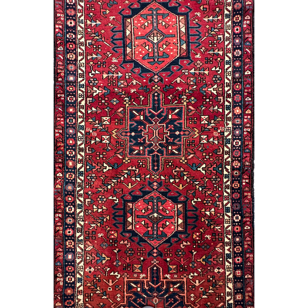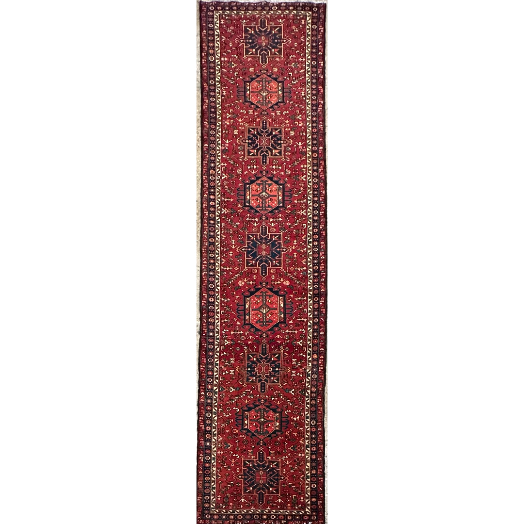 This vintage Heriz Karajeh runner features a striking, saturated red field adorned with a series of eight distinct geometric medallions. These large-scale medallions alternate in shape and are woven in deep indigo, ivory, and terracota tones, creating a powerful rhythmic progression along the length of the piece. The field is densely populated with stylized geometric floral motifs and angular vine-work, framed by a classic Heriz border of repeating serrated leaves and rosettes.