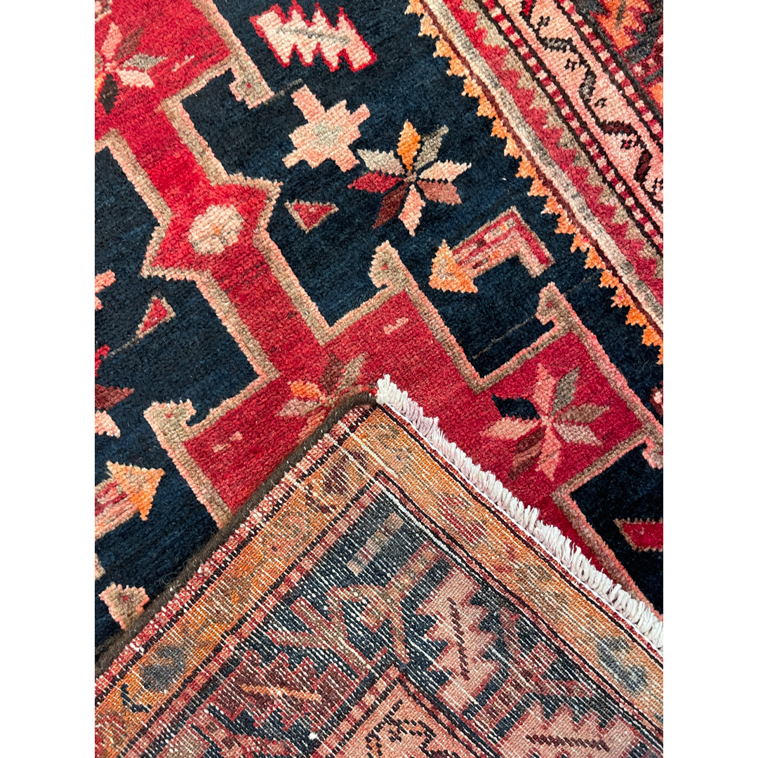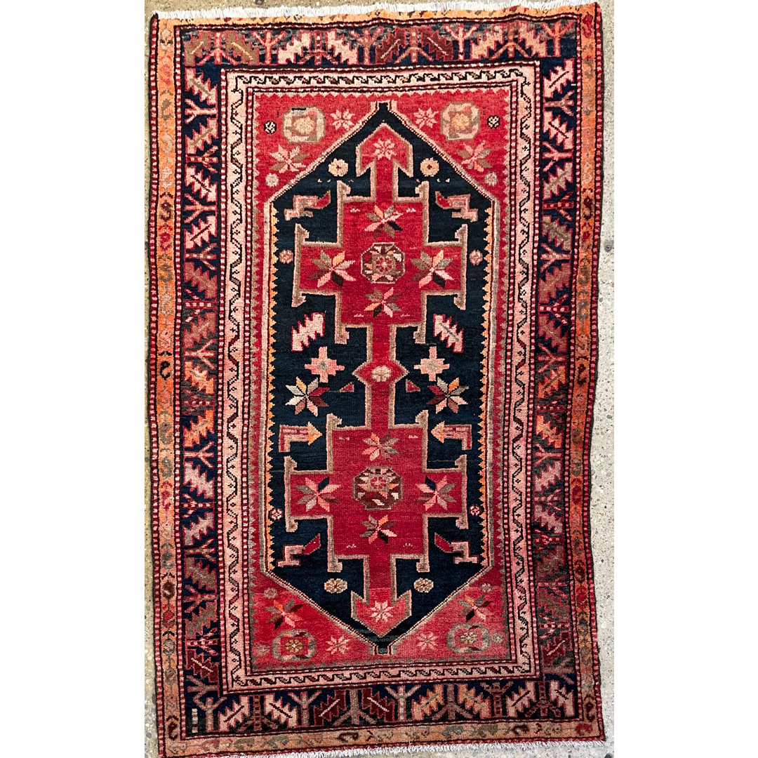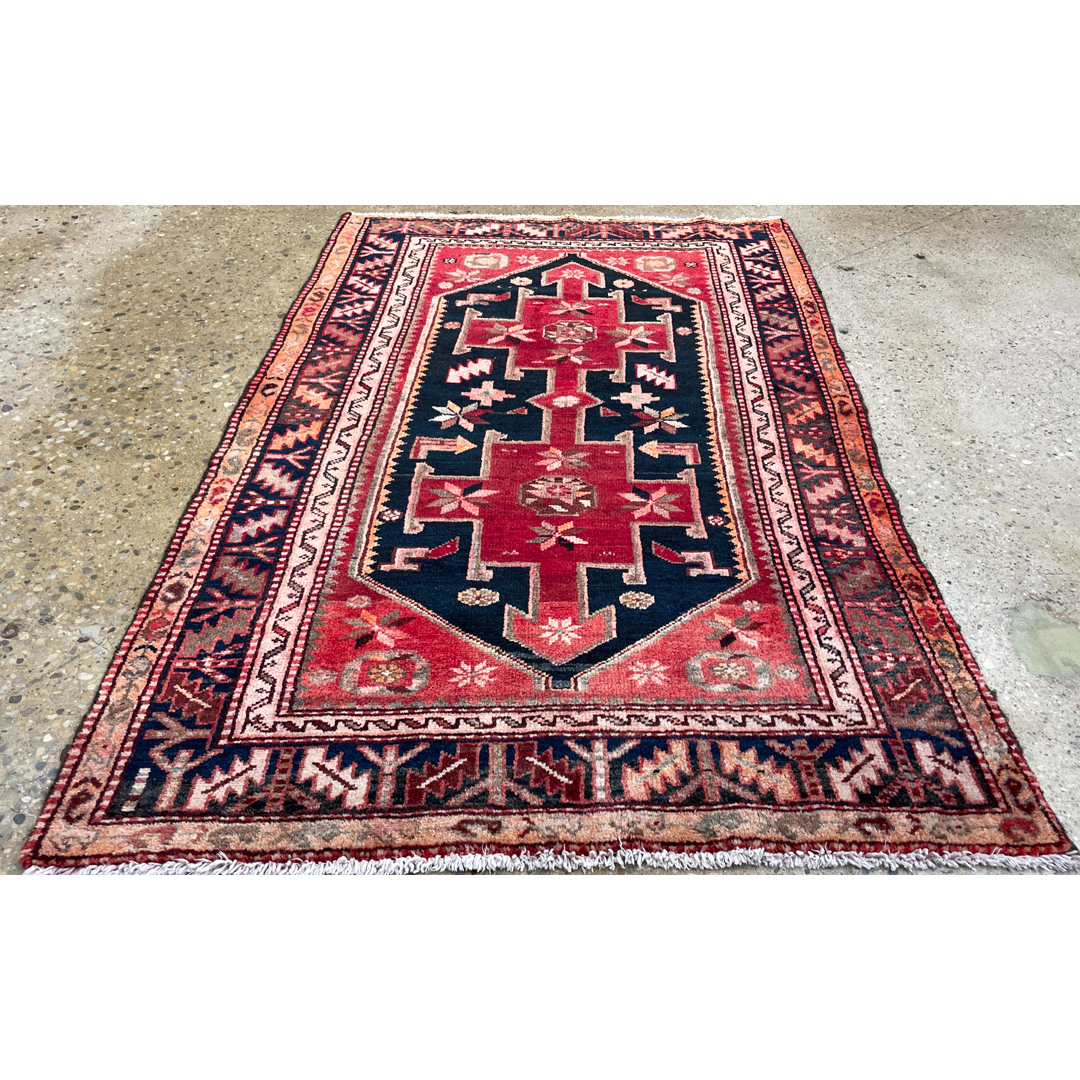 Create a warm and inviting atmosphere with this harmonious 3’8″ x 5’10” ft. antique Persian Hamadan rug, a genuine hand-knotted treasure from the 1940s. This authentic piece features a bold, geometric medallion design set against a rich, deep navy blue field. The central motif, rendered in vibrant red and ivory, anchors the composition, while stylized floral elements and tribal symbols float in the surrounding space. Framed by a series of detailed borders in complementary rust, salmon, and indigo tones, this durable wool rug offers a perfect blend of village charm and historic character, making it an ideal accent for an entryway, kitchen, or cozy seating area.