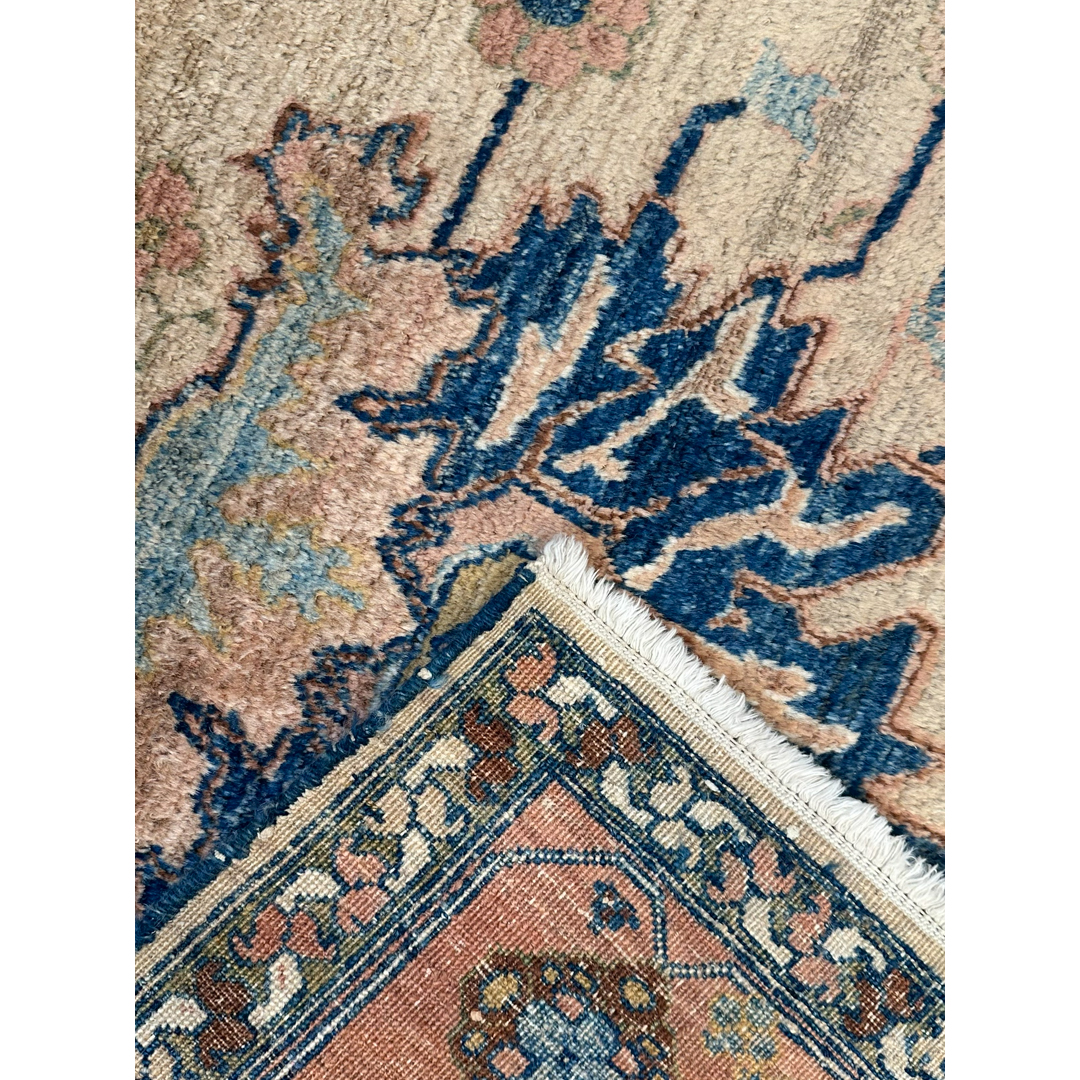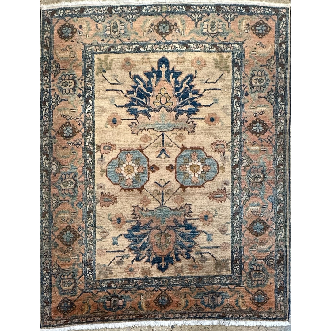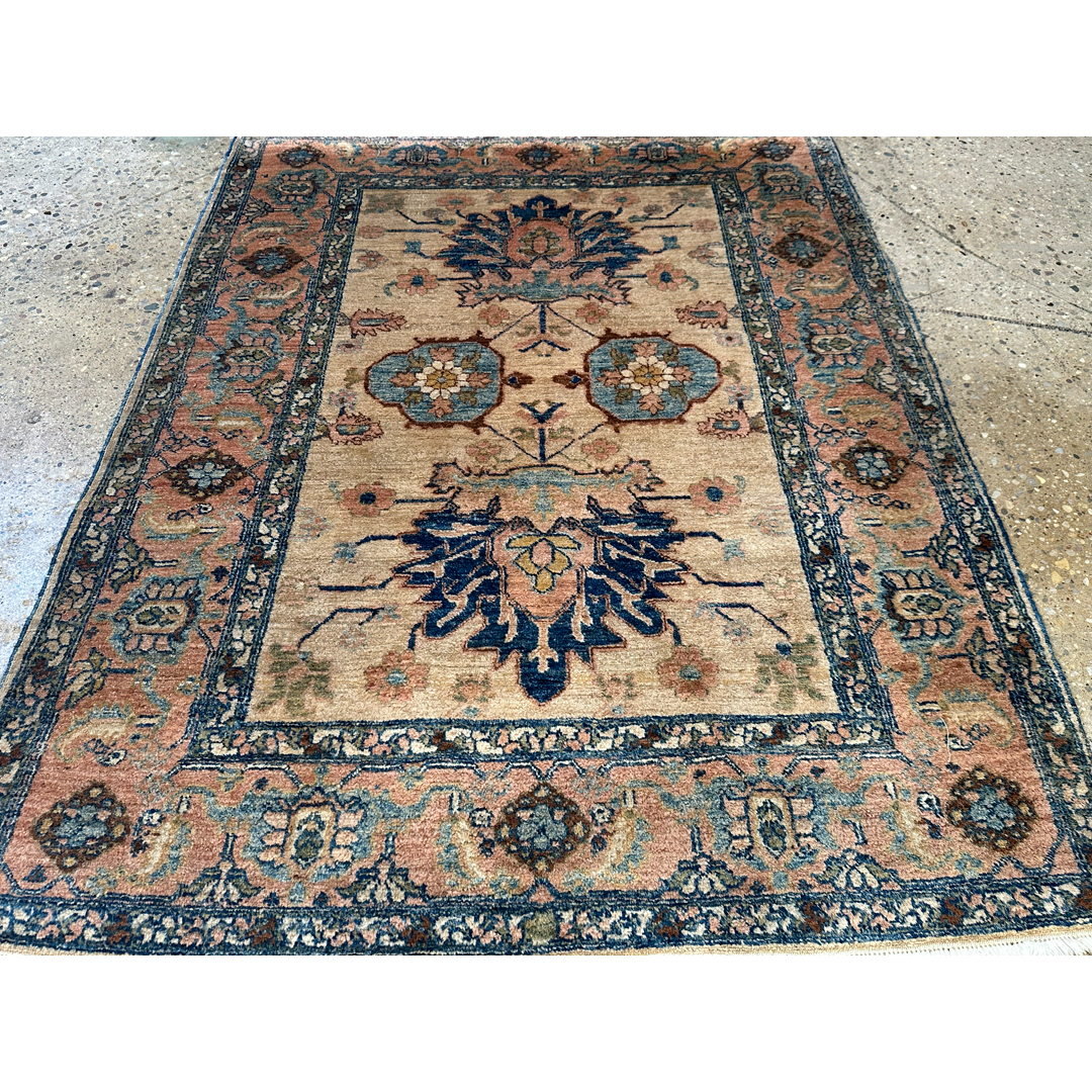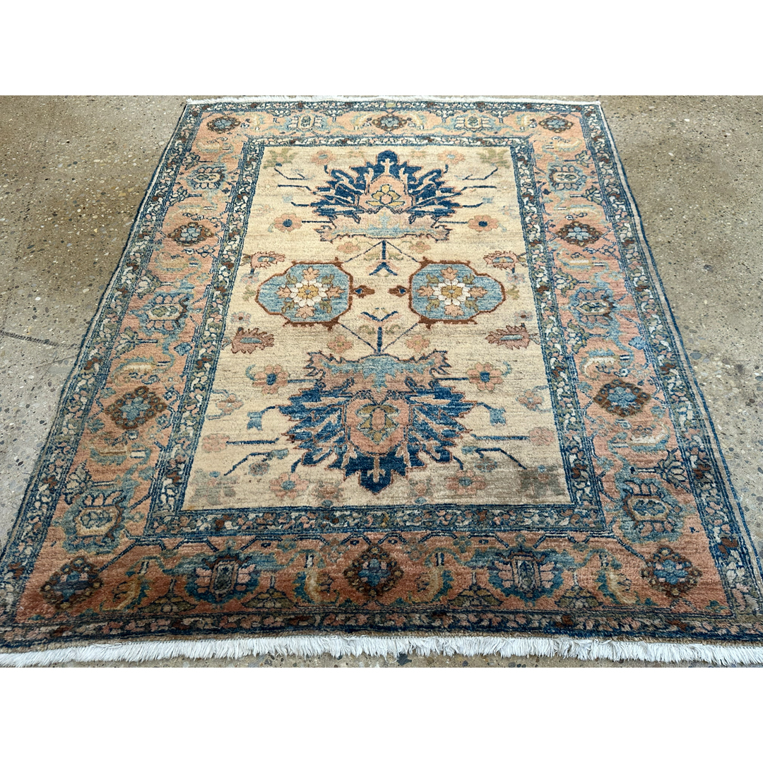 Create a focal point of understated elegance with this harmonious 4’9″ x 6’1″ ft. vintage tribal Persian rug, styled in the tradition of Heriz weaving. Unlike its typically bold red counterparts, this piece features a rare and soothing palette, showcasing a warm sandy-beige field that feels open and airy. The design is anchored by a vertical arrangement of large, stylized palmettes in deep navy blue, flanked by central geometric medallions in soft sage and slate blue. Framed by a wide border in a gentle terracotta-salmon tone filled with intricate floral rosettes, this durable wool rug offers a sophisticated, earthy aesthetic perfect for a bedroom, study, or cozy living area.