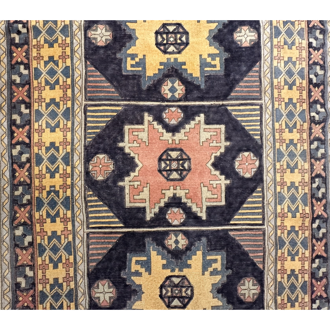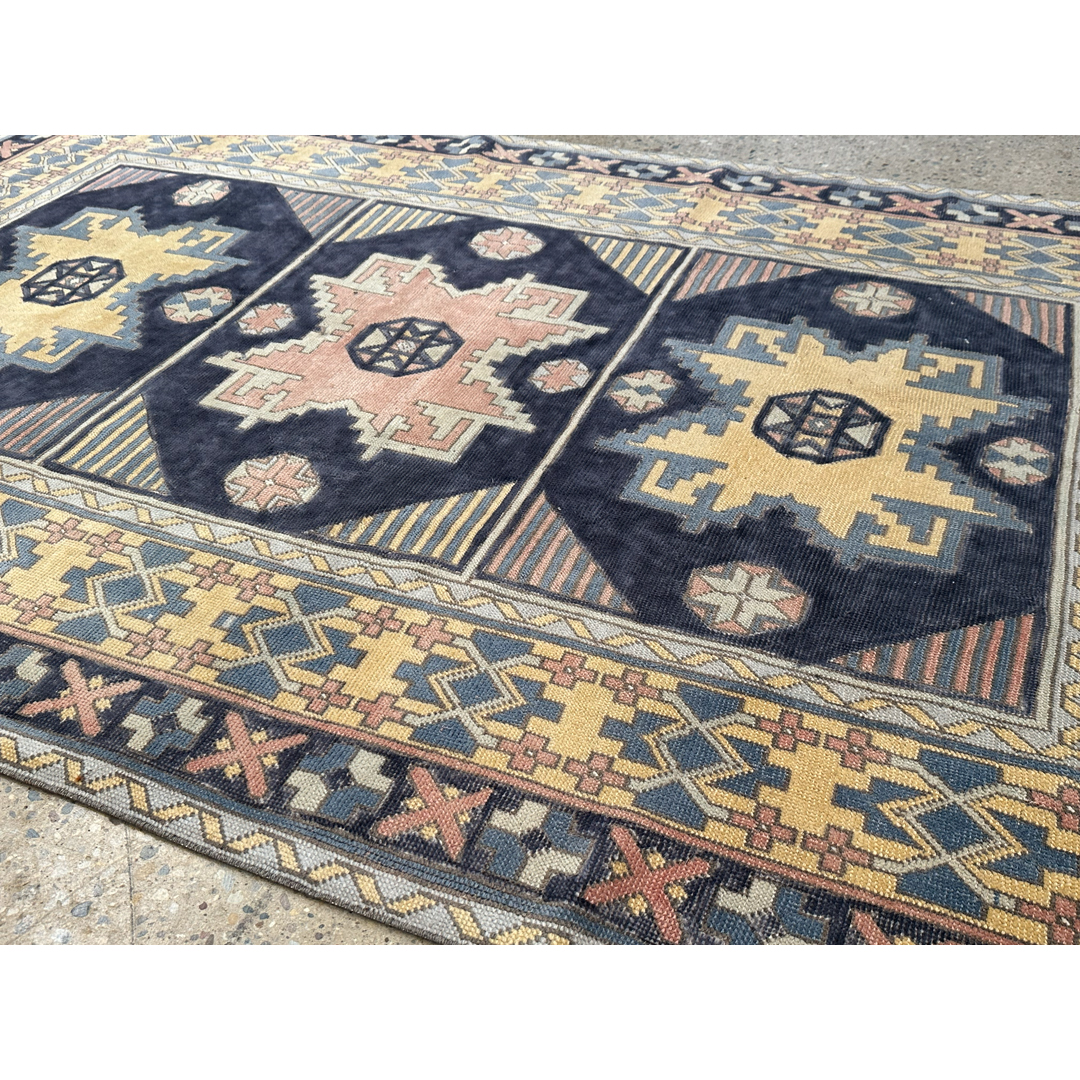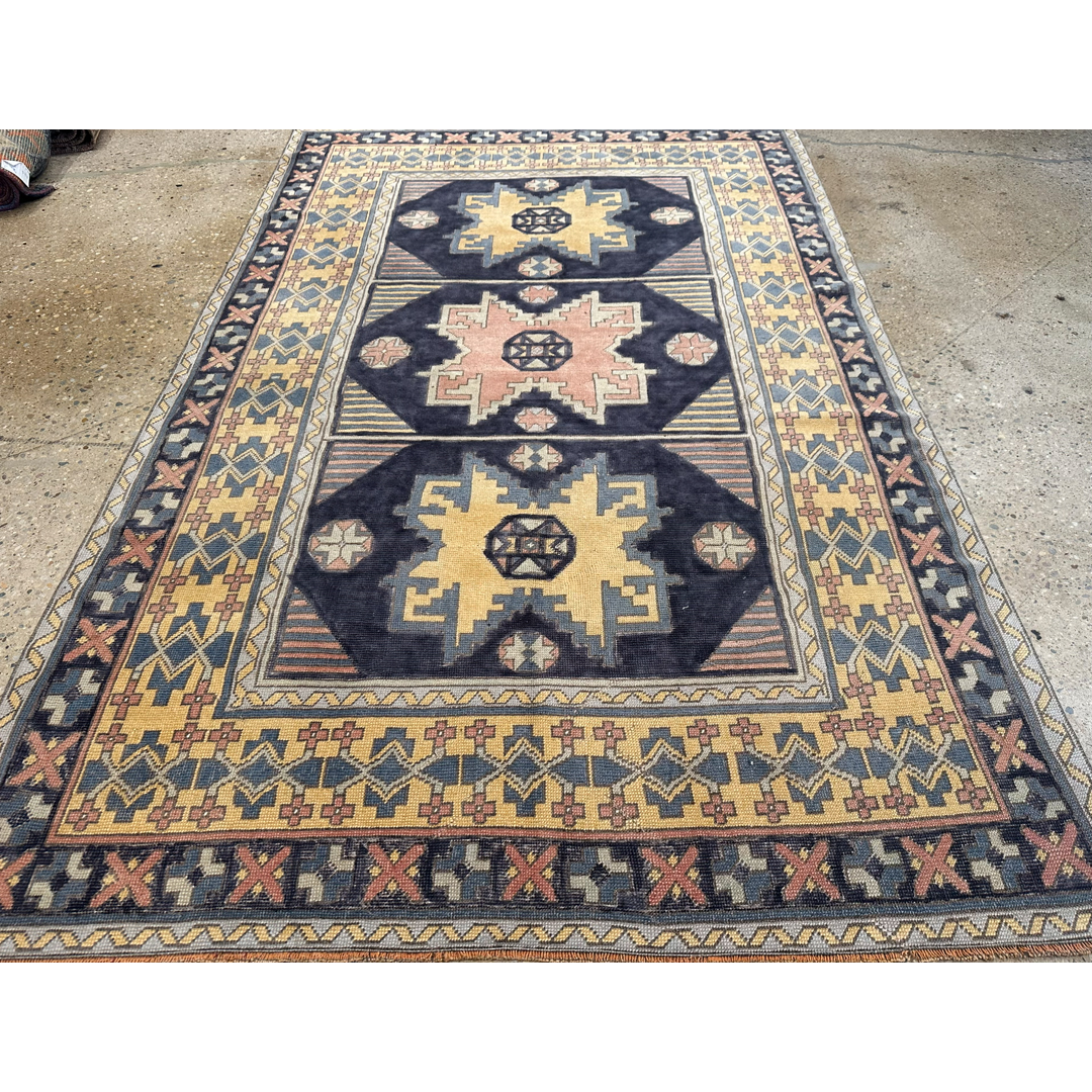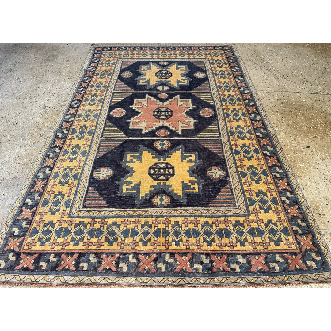 This ~6×9 Turkish carpet brings structured symmetry and vibrant, earthy color to any home. The central composition features three prominent star-cross medallions, intricately detailed with inner geometric motifs and set within a dark, indigo rectangular field.