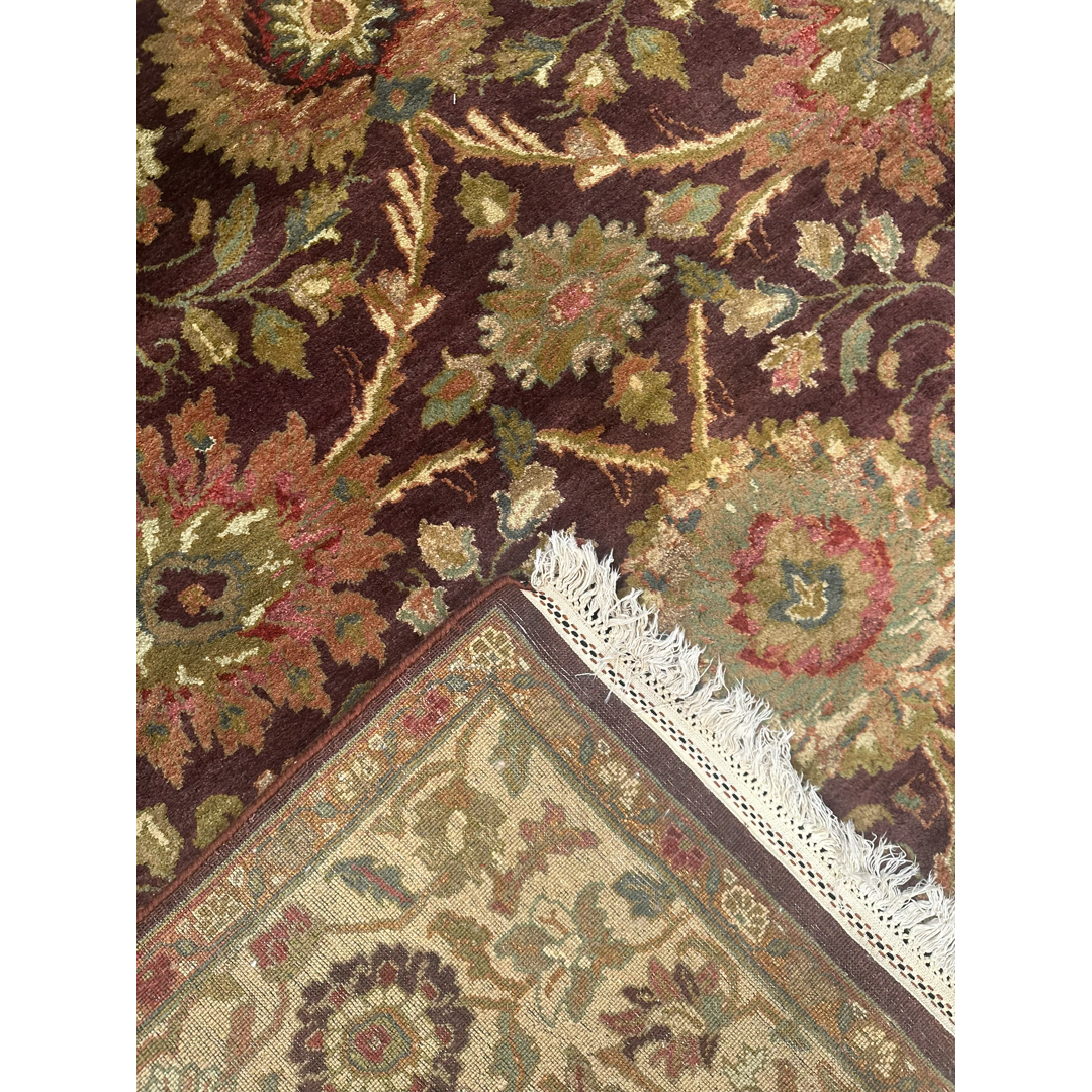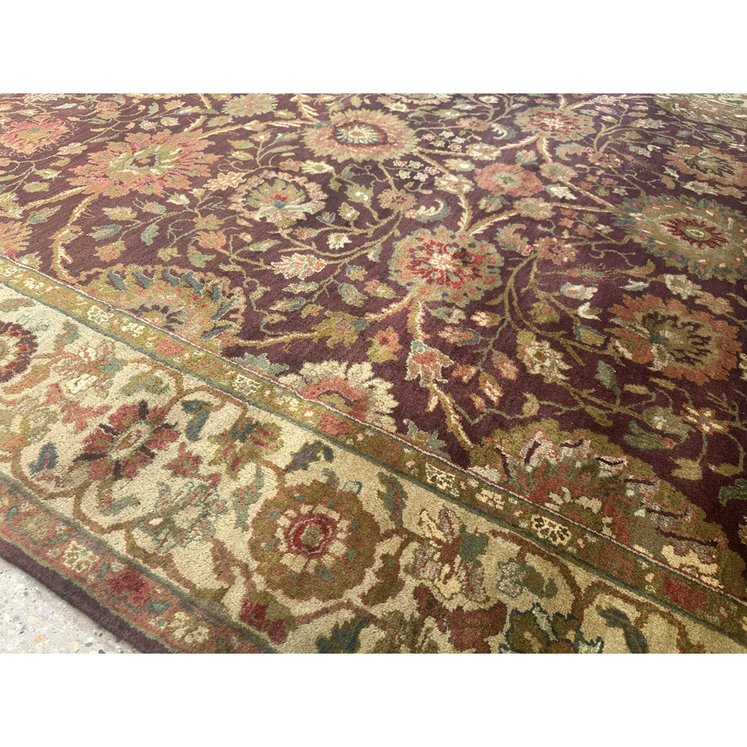 This hand-knotted Indo-Agra rug features a classic, all-over floral design that draws inspiration from the grand Mughal traditions of Northern India. The field is rendered in a deep, regal burgundy tone, providing a rich foundation for a sophisticated network of scrolling vines, oversized lotus palmettes, and delicate botanical sprays. The motifs are woven in a harmonious palette of sage green, antique gold, and soft terracotta, creating a warm and inviting aesthetic.