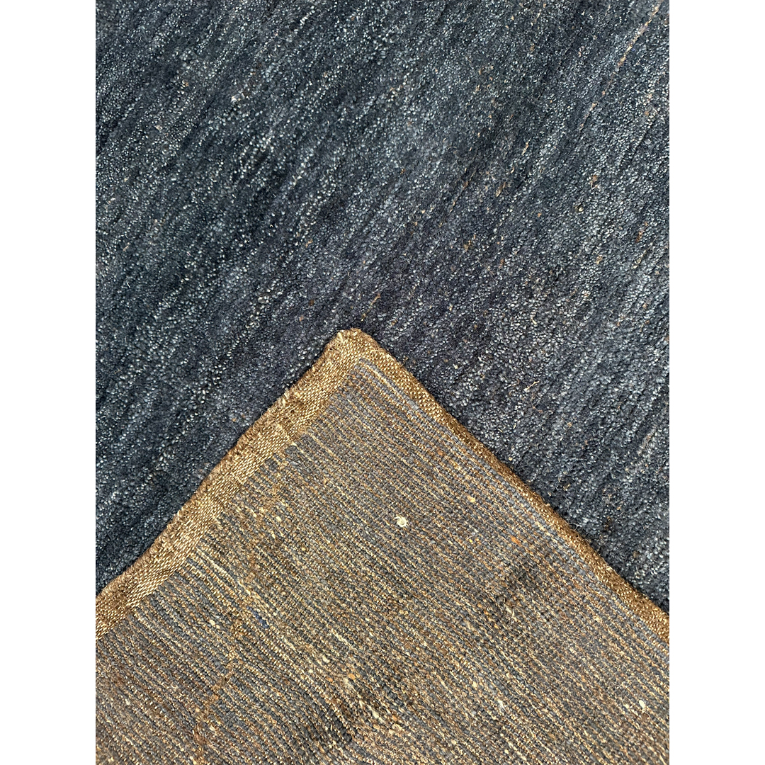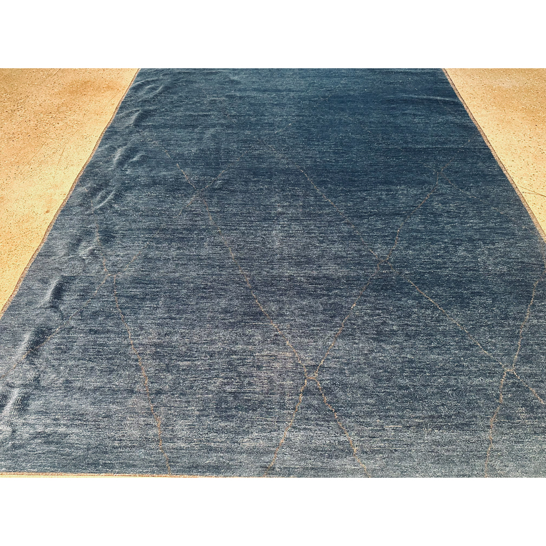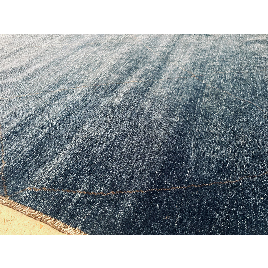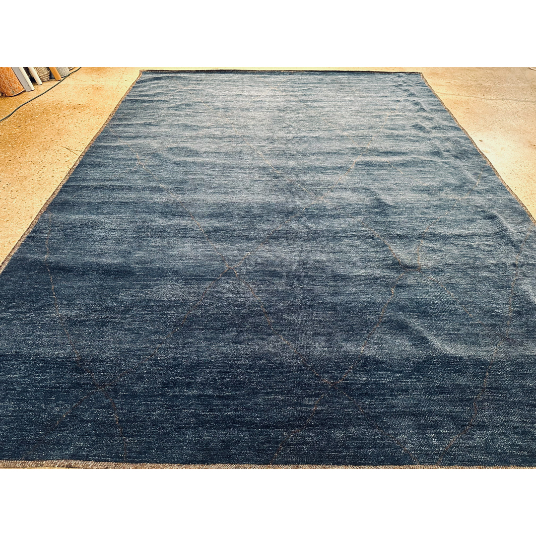 This modern Moroccan-style rug, measuring 9’2″ x 12’3″, combines the rich, atmospheric depth of its color palette with a minimalist tribal aesthetic. The design features an oversized, ethereal diamond trellis, a subtle nod to traditional Moroccan Beni Ourain pattern, floated across a field of deep, variegated blues. Hand-knotted from premium wool, the piece presents subtle, natural horizontal striations that catch the light to reveal a sophisticated texture. With its generous scale and contemporary low pile, this rug serves as a tranquil yet commanding foundation, perfectly suited for a modern living room or a curated primary suite.