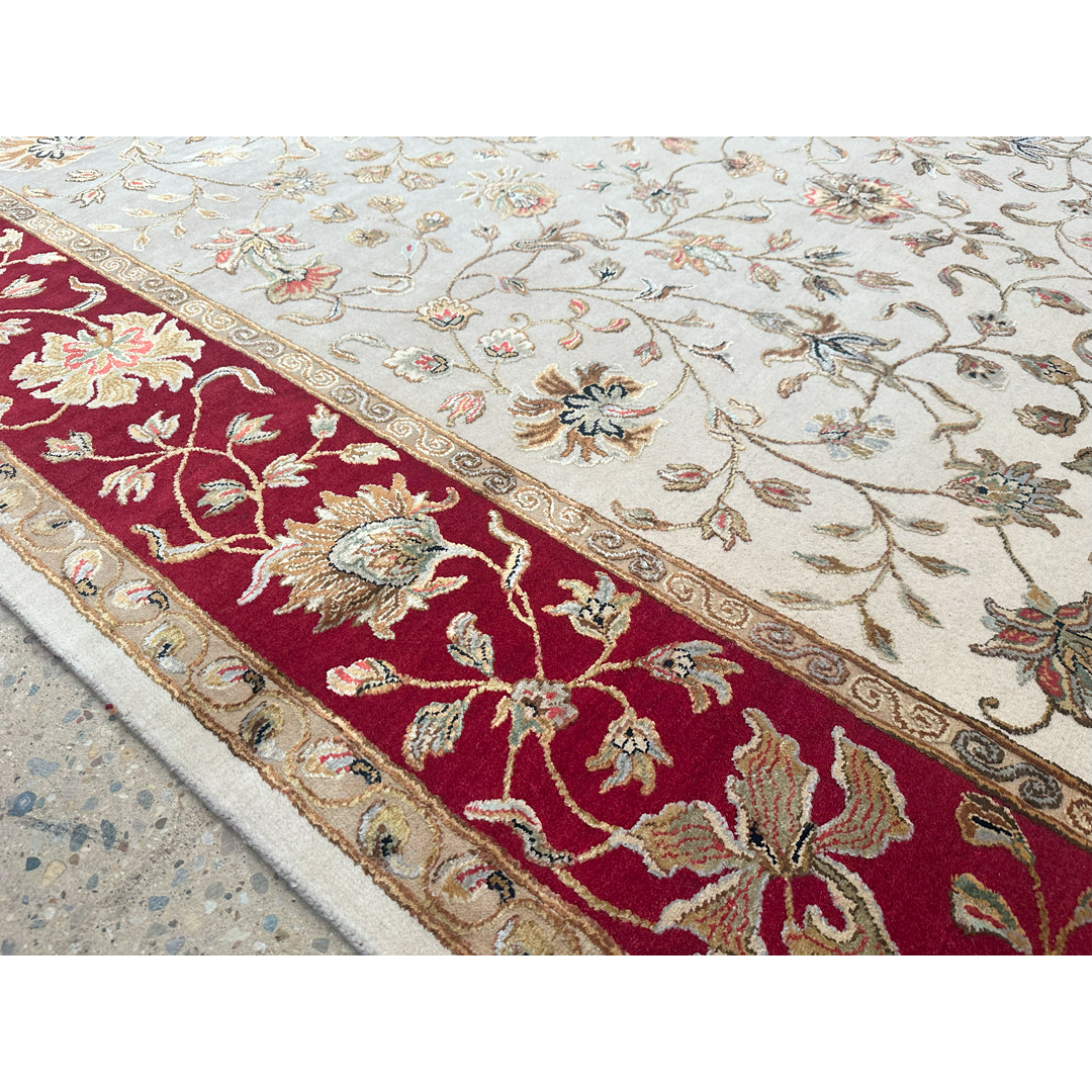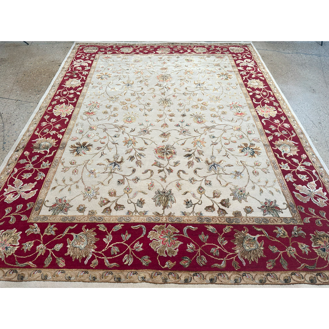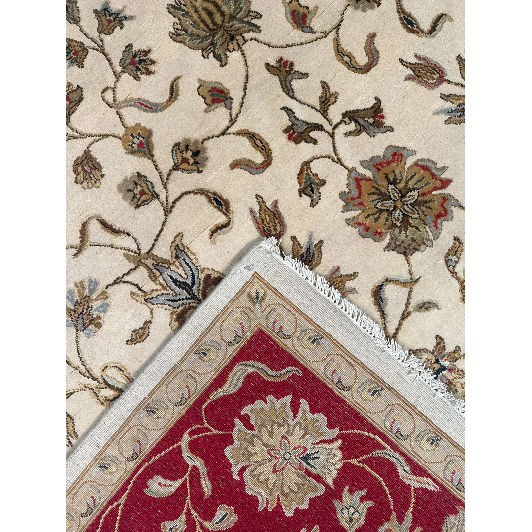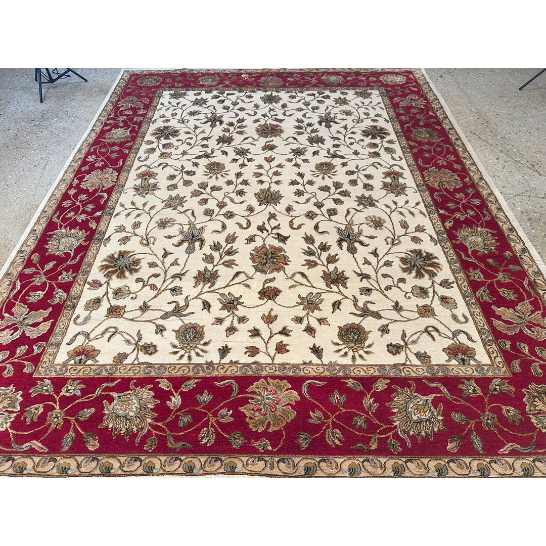 Anchor your home in timeless elegance with the Interesting Indian, an exquisite rug showcasing a classic Tabriz design. Measuring a versatile 8′ x 10′ ft., it features a luminous creamy ivory field adorned with a graceful all-over pattern of scrolling vines and floral blossoms. The entire composition is framed by a stately and powerful border in a rich, deep ruby red, creating a stunning and sophisticated contrast. Expertly hand-knotted in India, its true luxury lies in the exquisite blend of fine wool and bamboo silk, which gives the pile a beautiful, subtle sheen and an exceptionally soft feel underfoot. This 8×10 area rug is the perfect foundation for a formal living room or an elegant dining space, bringing a touch of classic splendor and luxurious comfort to your home. Contains a wool base with bamboo silk highlights on the flowers.