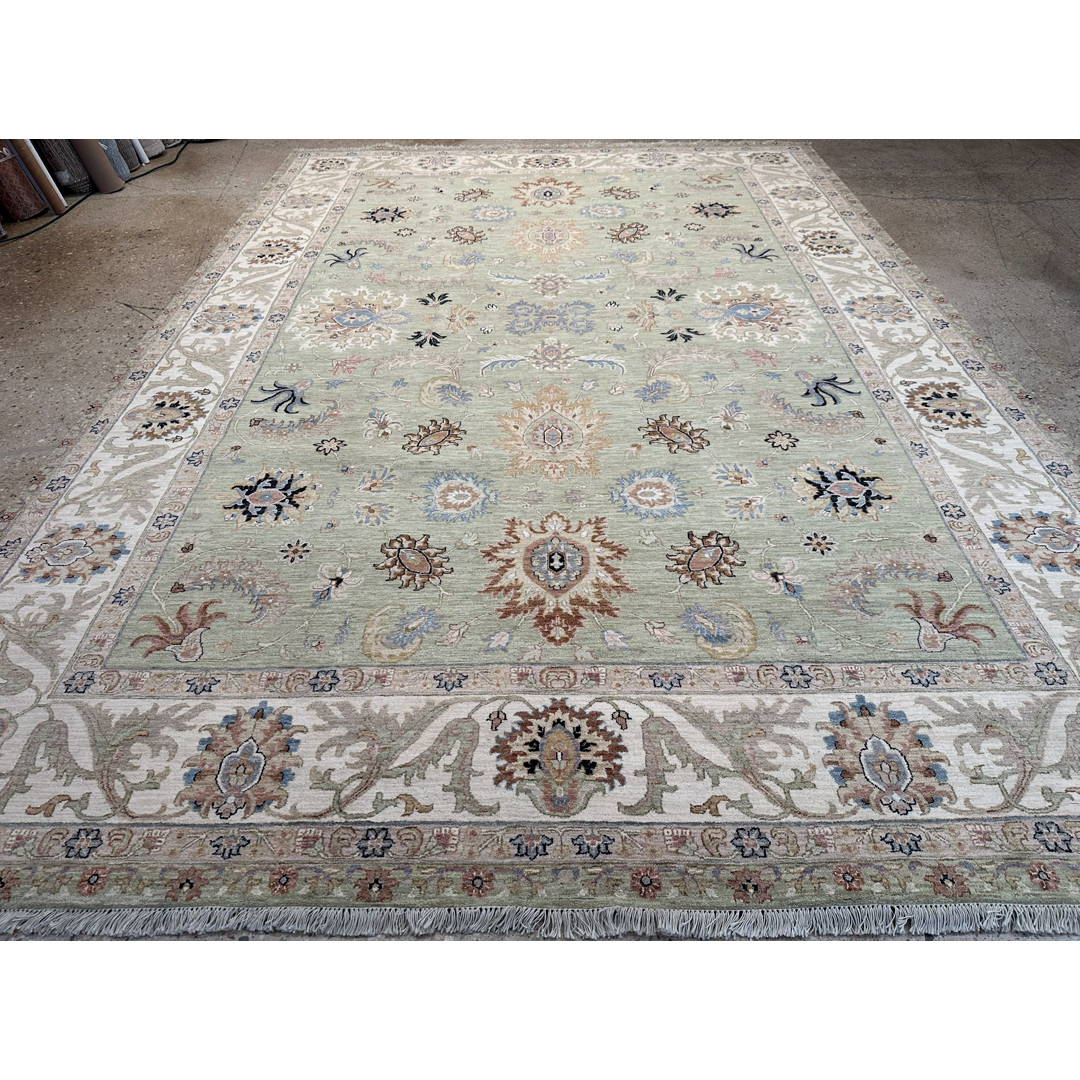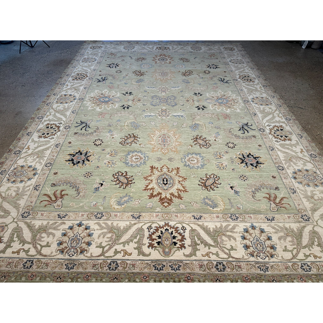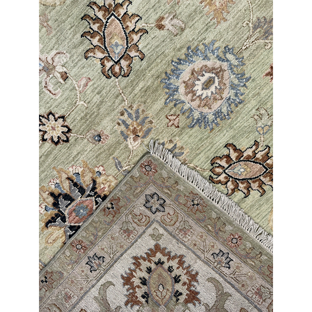 This masterfully hand-knotted Indian Rug presents a refreshing, contemporary interpretation of classic Persian aesthetics. Measuring an expansive 9’10” x 14’2″, this oversized piece is designed to bring a sense of airy tranquility and organic elegance to large-scale living spaces. The rug is defined by its sophisticated “tone-on-tone” philosophy, featuring a lush sage green field contrasted by a wide, luminous cream border. The all-over pattern of delicate floral palmettes and scrolling vines is rendered with a light touch, creating a visual rhythm that is ornate yet remarkably uncluttered. Subtle accents of taupe, slate, and burnt sienna provide just enough definition to the botanical motifs without overwhelming the serene primary palette. With its calming green hues and classic border, this rug is a perfect match for the “New Traditional” aesthetic. It feels equally at home in a sun-drenched lakeside conservatory as it does in a formal greystone. Its neutral cream border allows it to pair seamlessly with white linen upholstery, light oak floors, or more traditional dark wood finishes.
