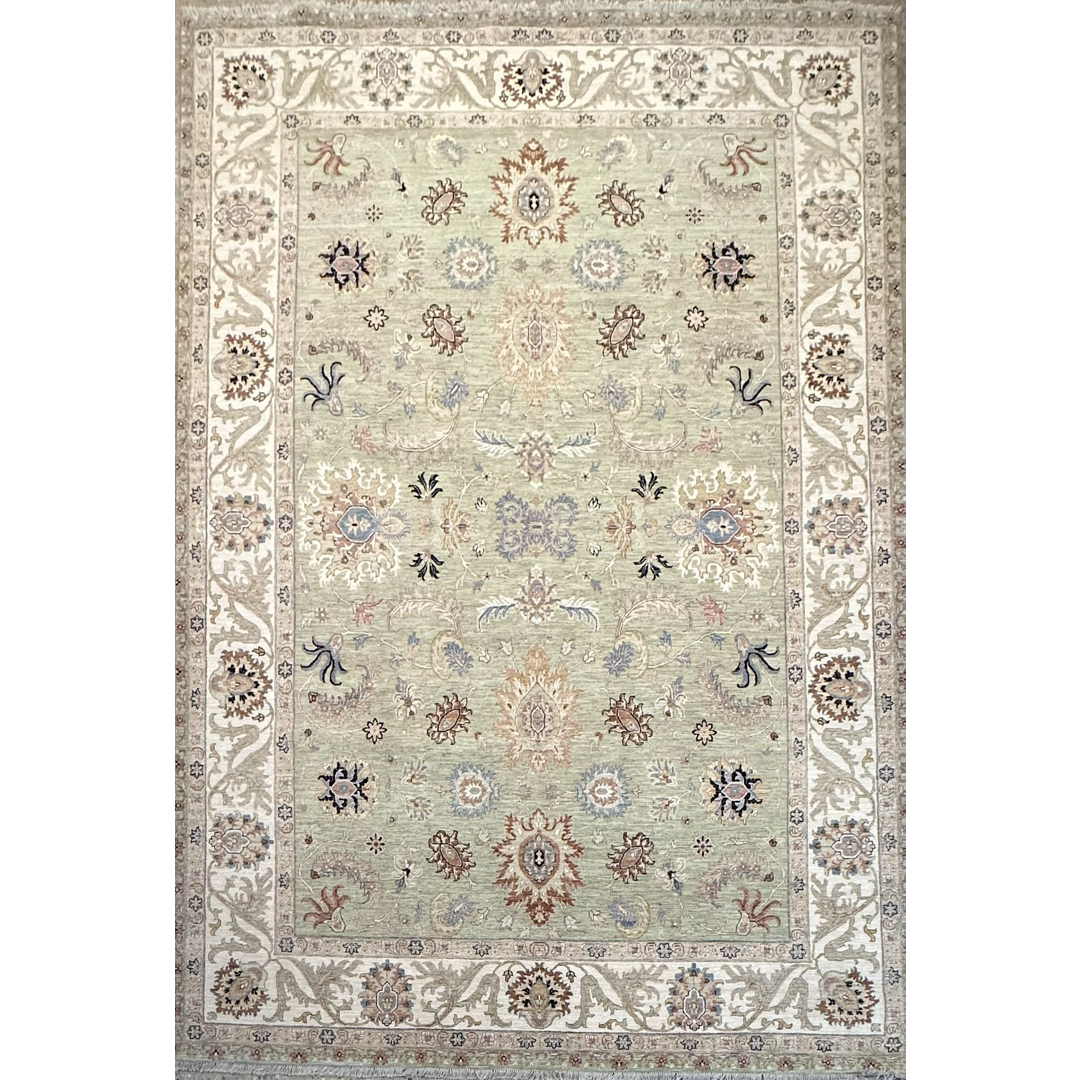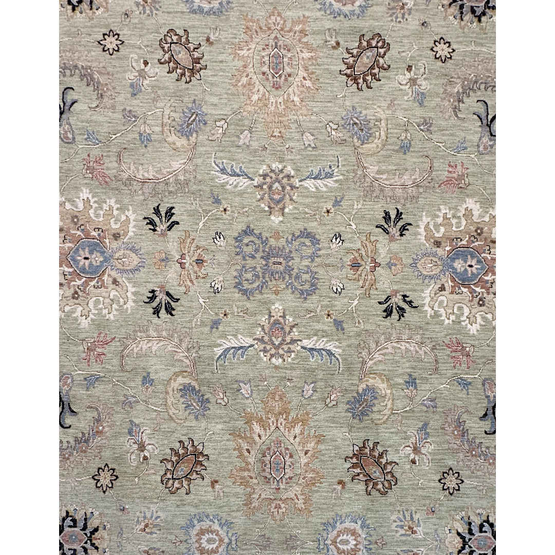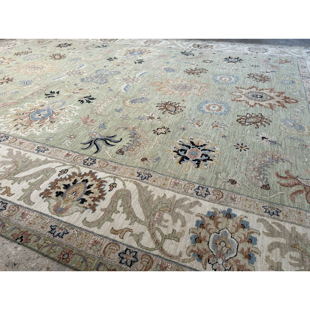 This masterfully hand-knotted Indian Rug presents a refreshing, contemporary interpretation of classic Persian aesthetics. Measuring an expansive 9’10” x 14’2″, this oversized piece is designed to bring a sense of airy tranquility and organic elegance to large-scale living spaces. The rug is defined by its sophisticated “tone-on-tone” philosophy, featuring a lush sage green field contrasted by a wide, luminous cream border. The all-over pattern of delicate floral palmettes and scrolling vines is rendered with a light touch, creating a visual rhythm that is ornate yet remarkably uncluttered. Subtle accents of taupe, slate, and burnt sienna provide just enough definition to the botanical motifs without overwhelming the serene primary palette. With its calming green hues and classic border, this rug is a perfect match for the “New Traditional” aesthetic. It feels equally at home in a sun-drenched lakeside conservatory as it does in a formal greystone. Its neutral cream border allows it to pair seamlessly with white linen upholstery, light oak floors, or more traditional dark wood finishes.