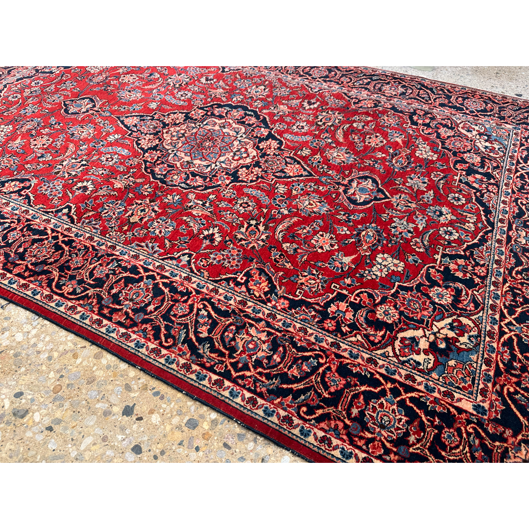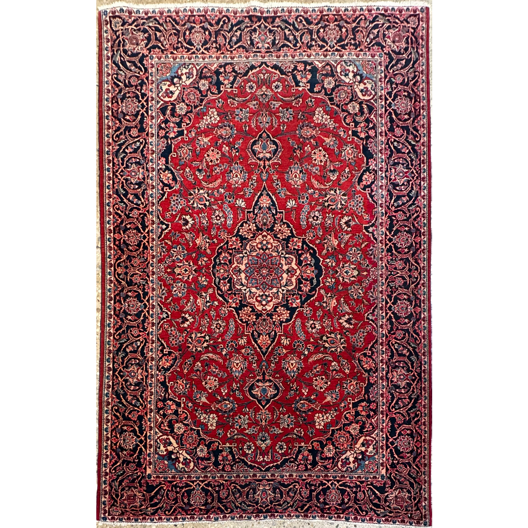 Elevate your interior design with this keen 4’5″ x 6’10” antique Persian Kashan rug, a genuine hand-knotted masterpiece from the 1940s. This exquisite carpet features the classic medallion-and-corner design, with a stunning, intricate central medallion in deep navy and ivory anchoring a rich, crimson-red field. The field is lush with scrolling floral vines, palmettes, and arabesques, all framed by a sophisticated navy blue border filled with repeating floral motifs. Renowned for their high knot density and velvety wool, this durable and elegant rug is perfect for adding a touch of traditional luxury to a living room, dining area, or formal study.