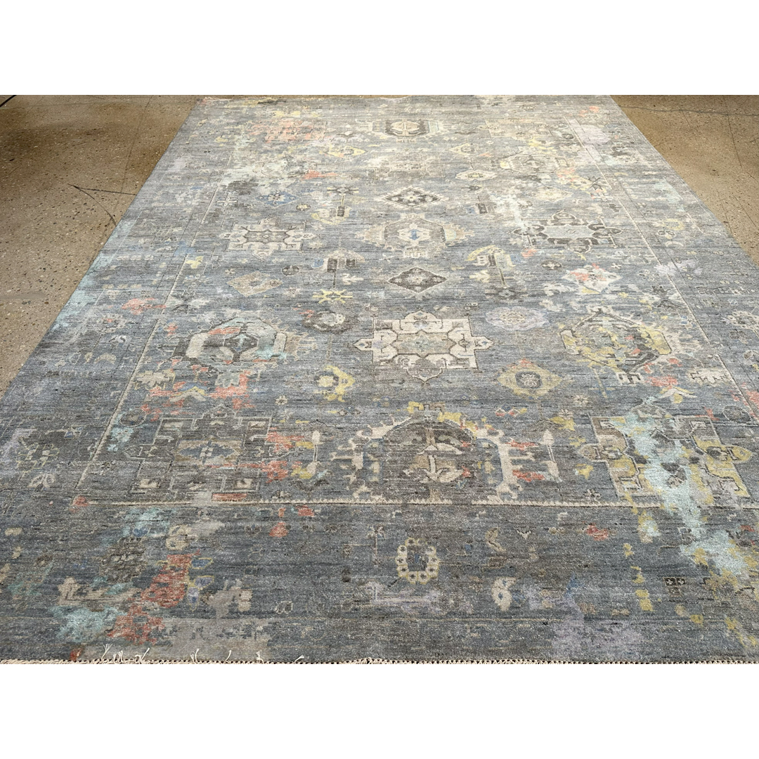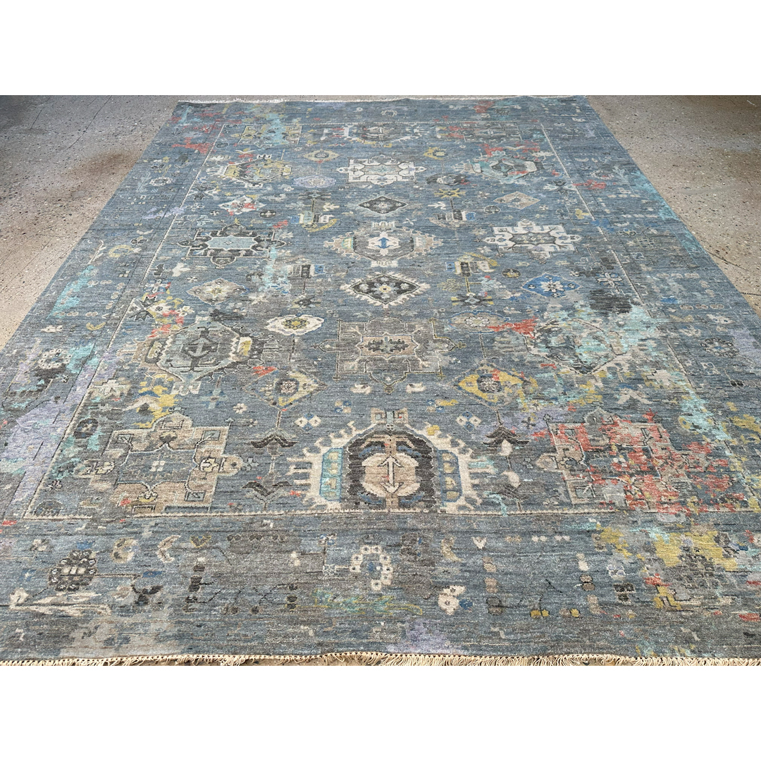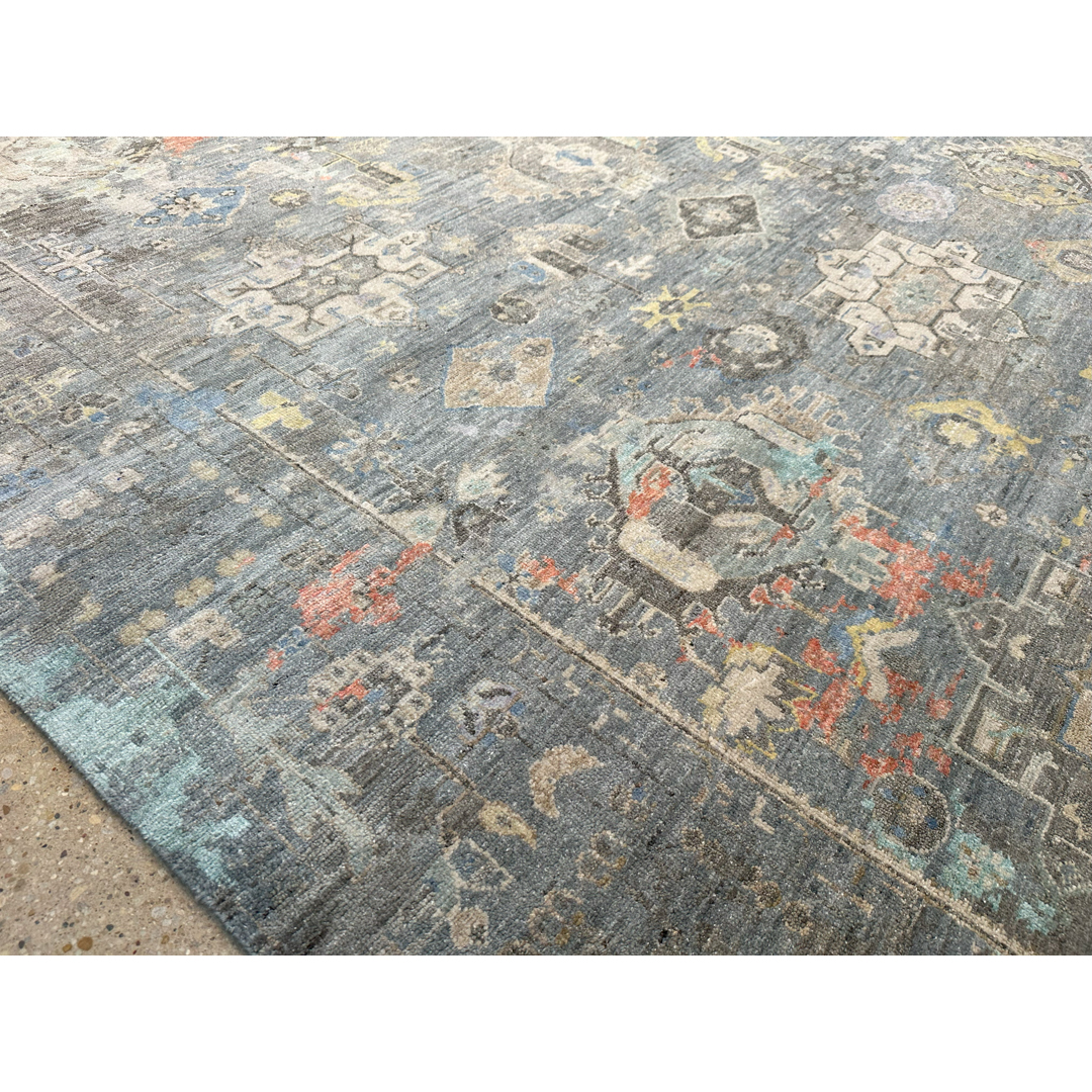 This transitional rug from Kalaty’s Khotan Collection offers a masterful fusion of ancient design and cutting-edge contemporary aesthetics. The composition features traditional East Turkestan geometric medallions and tribal motifs rendered with a modern, “erased” aesthetic. Emerging from a moody, highly textural slate-grey foundation are striking, watercolor-like splashes of blush pink, soft citron, pale aqua, and rust. This dramatic oxidation and artistic color-pooling transform the classic pattern into a dynamic, abstract landscape. Measuring a generous 9’2″ x 11’10” ft., this piece is an extraordinary foundation for spaces that celebrate the intersection of old and new.