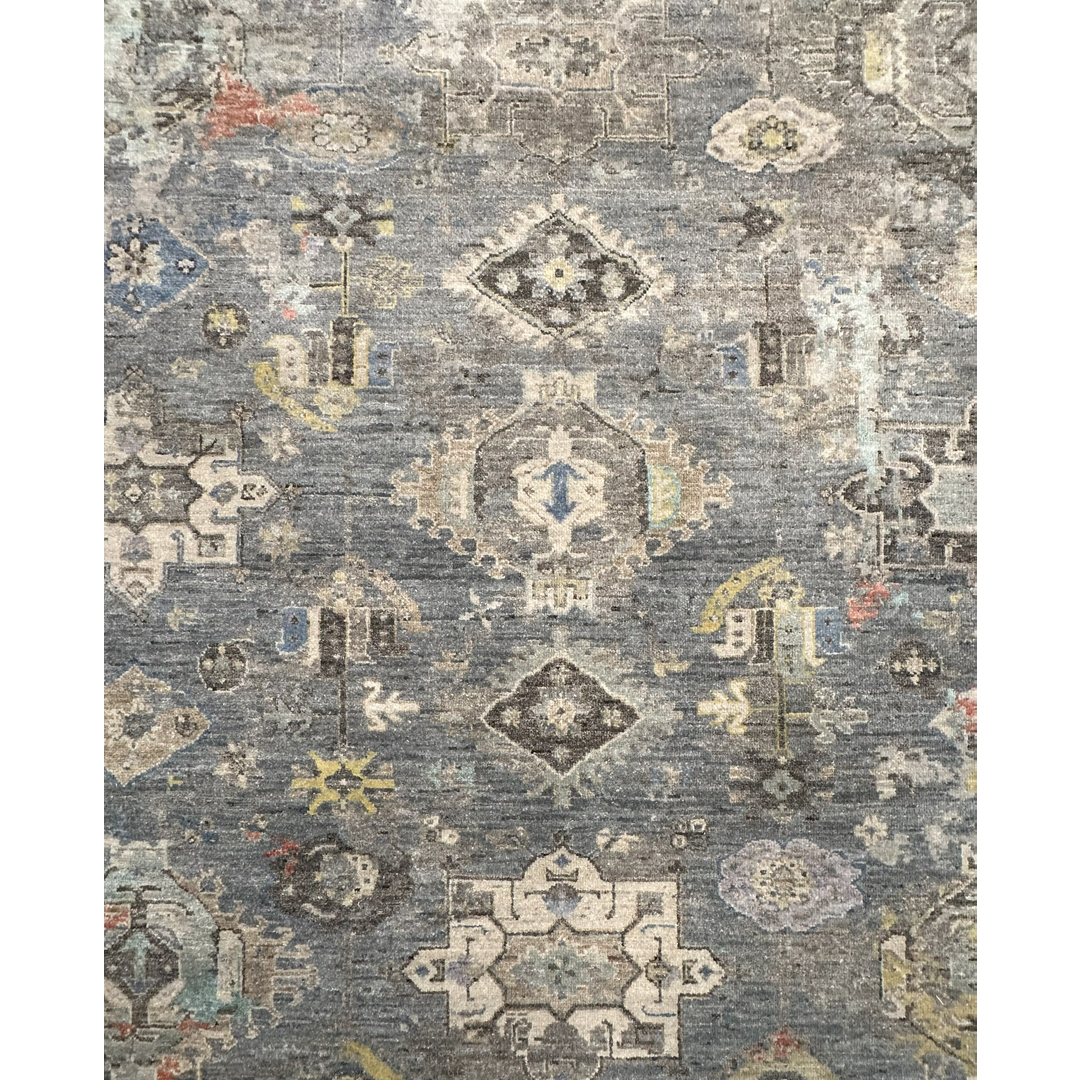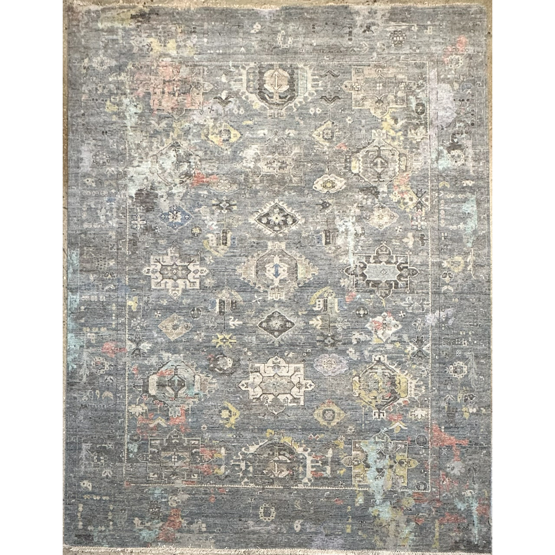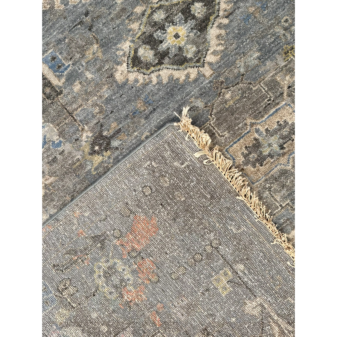 This transitional rug from Kalaty’s Khotan Collection offers a masterful fusion of ancient design and cutting-edge contemporary aesthetics. The composition features traditional East Turkestan geometric medallions and tribal motifs rendered with a modern, “erased” aesthetic. Emerging from a moody, highly textural slate-grey foundation are striking, watercolor-like splashes of blush pink, soft citron, pale aqua, and rust. This dramatic oxidation and artistic color-pooling transform the classic pattern into a dynamic, abstract landscape. Measuring a generous 9’2″ x 11’10” ft., this piece is an extraordinary foundation for spaces that celebrate the intersection of old and new.