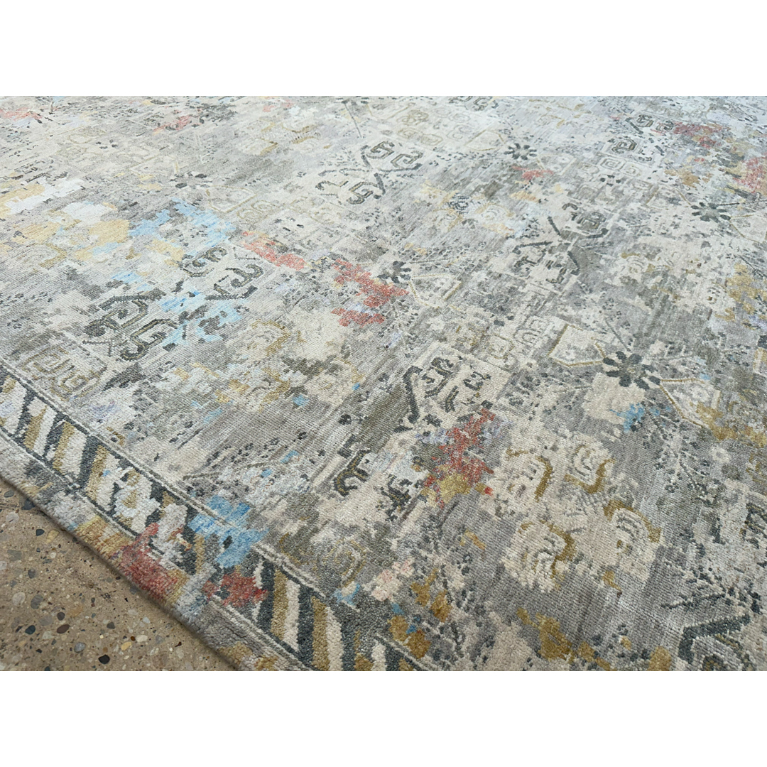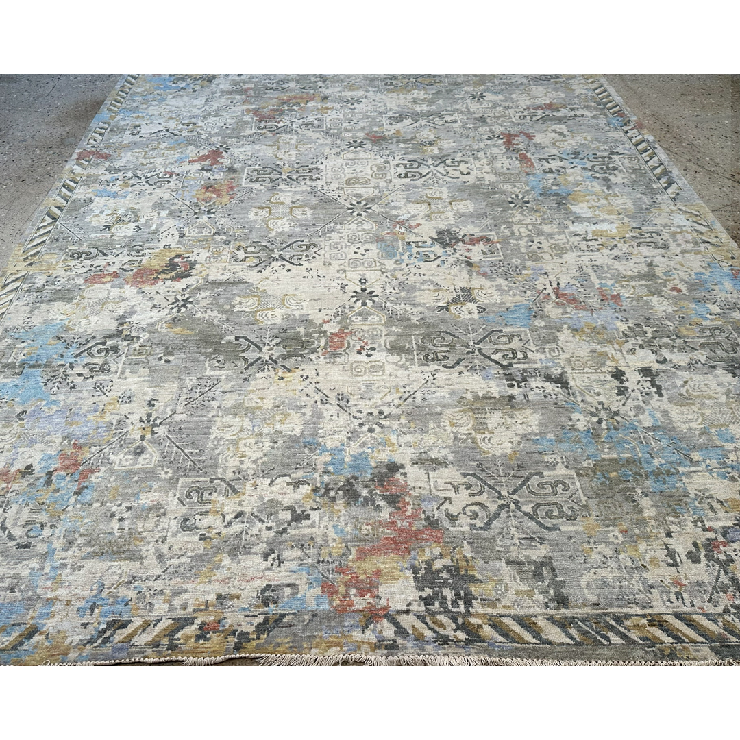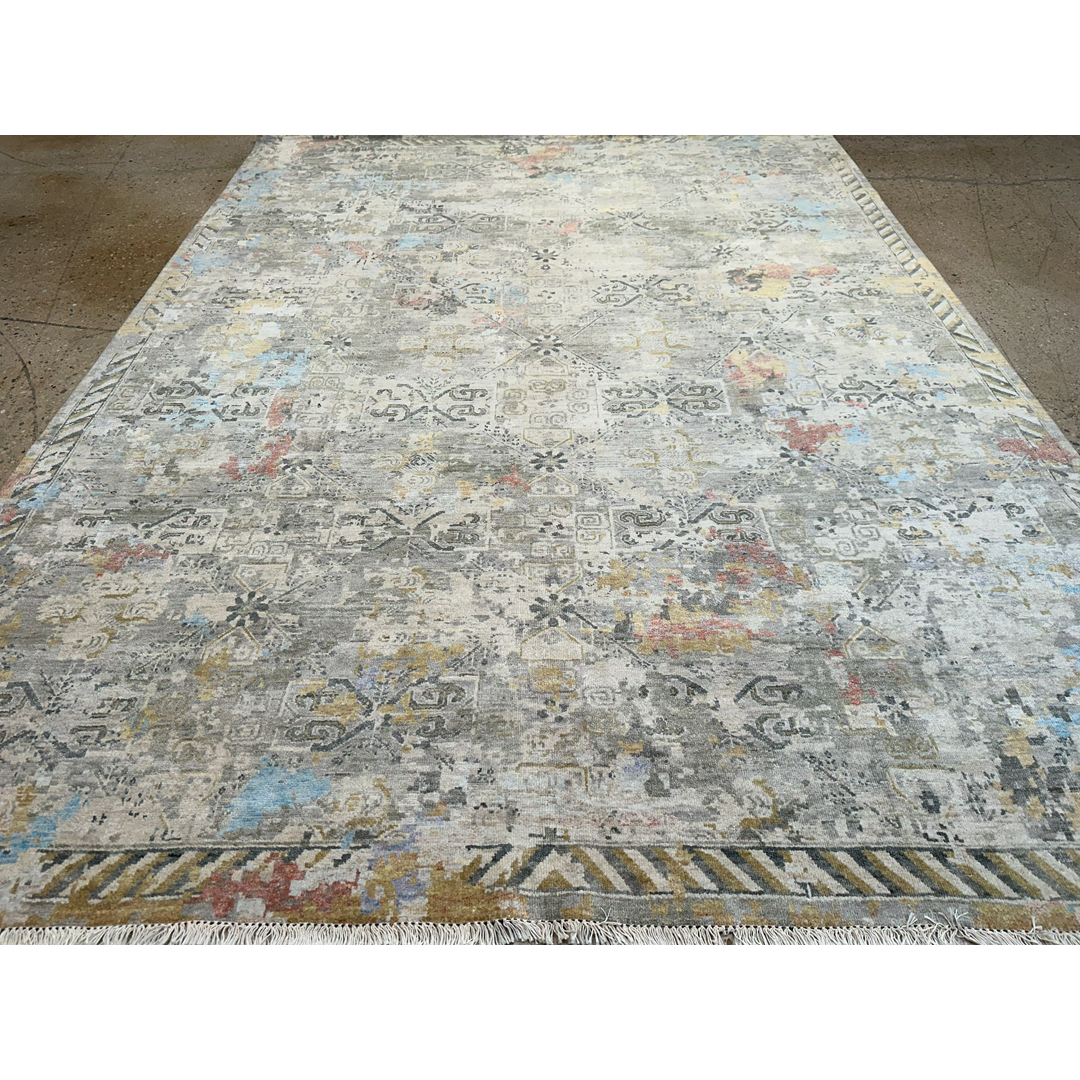 Measuring 9 by 12 feet, this modern Indian area rug from the Khotan Collection provides a highly textural foundation for transitional and contemporary rooms. The design reinterprets classic East Turkestan Khotan motifs, featuring a faint, repeating geometric lattice and stylized medallions, through a heavily “erased,” modern lens. This abstract, fragmented pattern is executed in a luminous silver, pale grey, and cream background, dynamically accented by painterly splashes of faded sky blue, soft gold, and muted rust. By combining ancient Silk Road geometry with a modernized, pastel-infused color story and a highly textured finish, this piece achieves a highly adaptable, eclectic aesthetic.