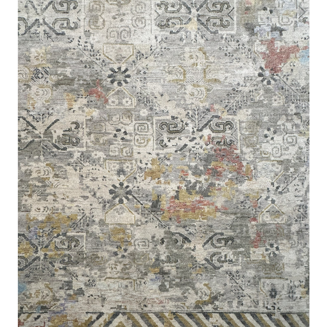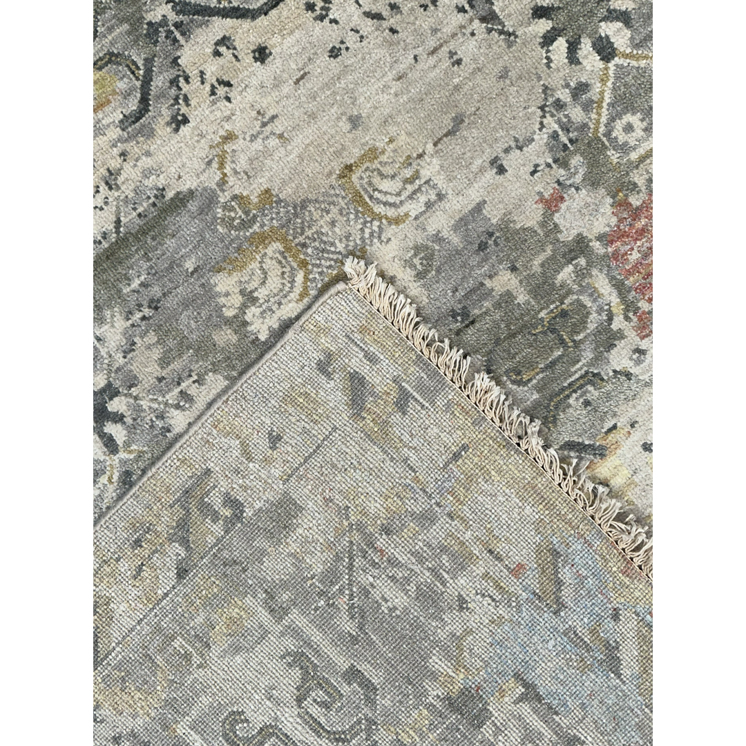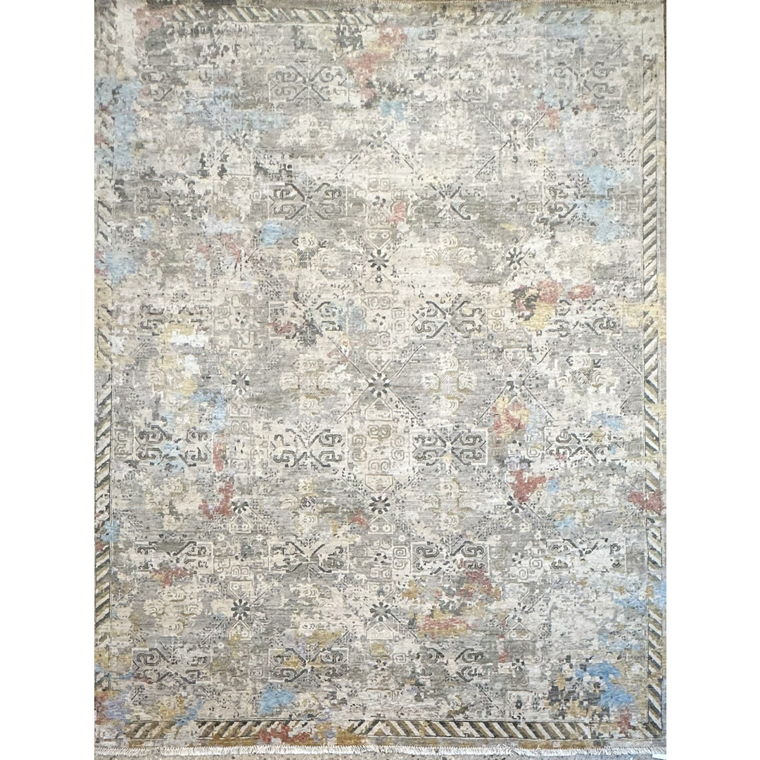 Measuring 9 by 12 feet, this modern Indian area rug from the Khotan Collection provides a highly textural foundation for transitional and contemporary rooms. The design reinterprets classic East Turkestan Khotan motifs, featuring a faint, repeating geometric lattice and stylized medallions, through a heavily “erased,” modern lens. This abstract, fragmented pattern is executed in a luminous silver, pale grey, and cream background, dynamically accented by painterly splashes of faded sky blue, soft gold, and muted rust. By combining ancient Silk Road geometry with a modernized, pastel-infused color story and a highly textured finish, this piece achieves a highly adaptable, eclectic aesthetic.