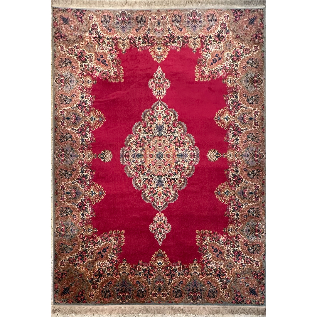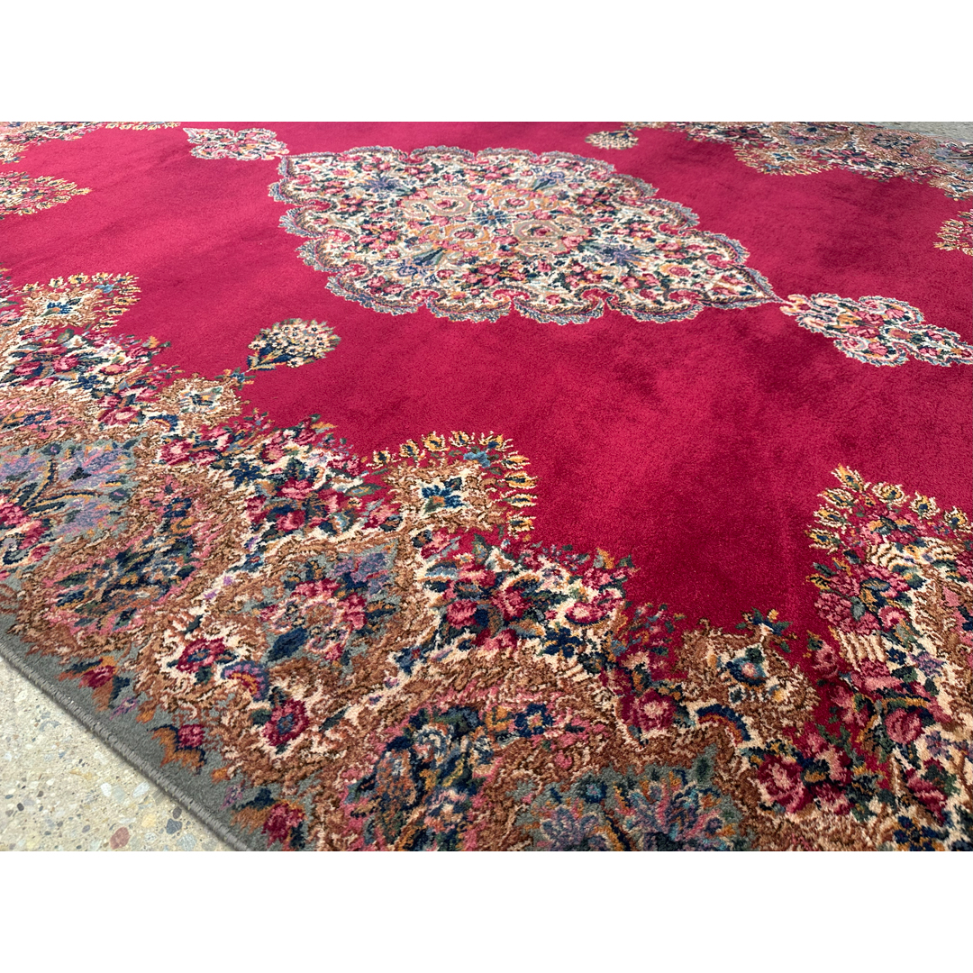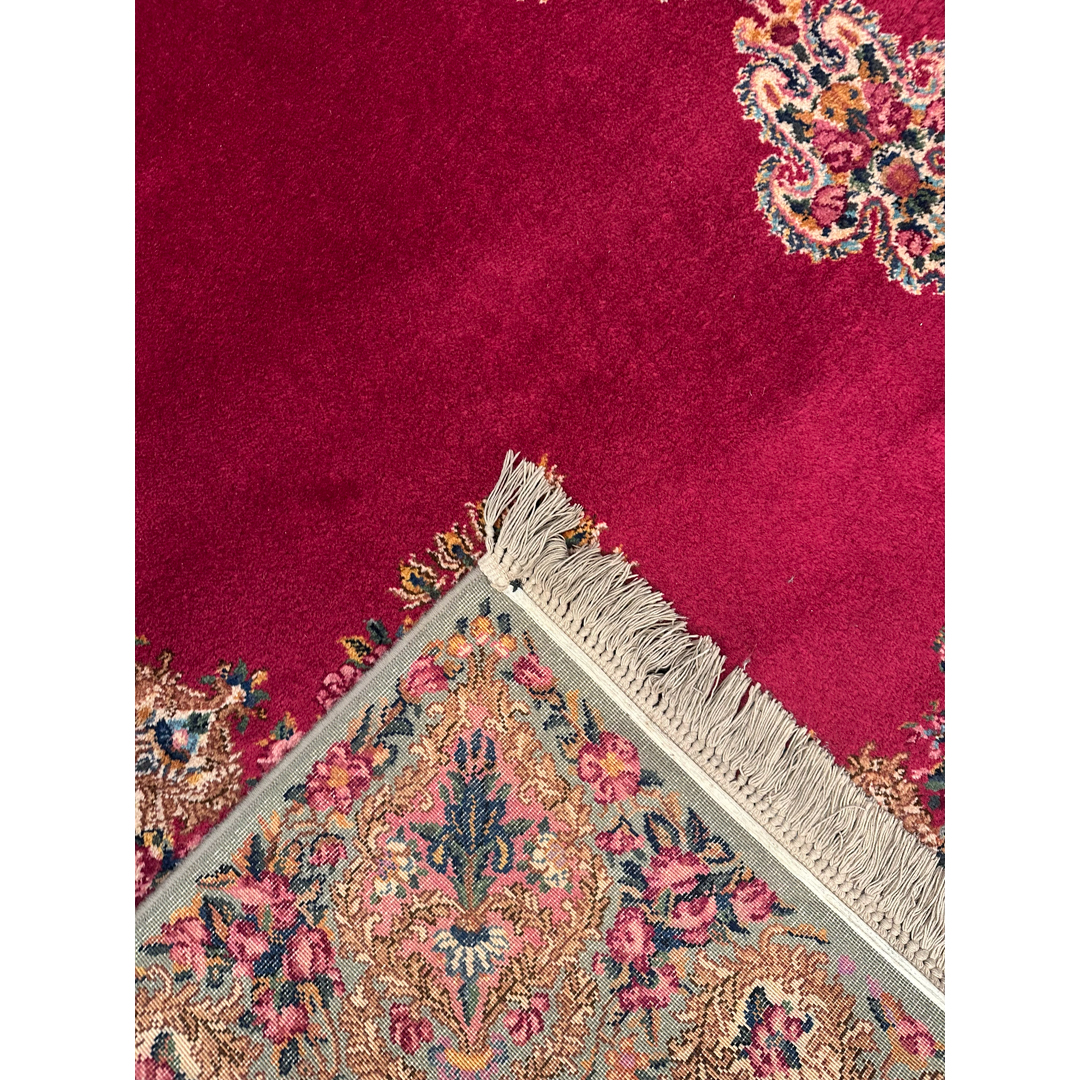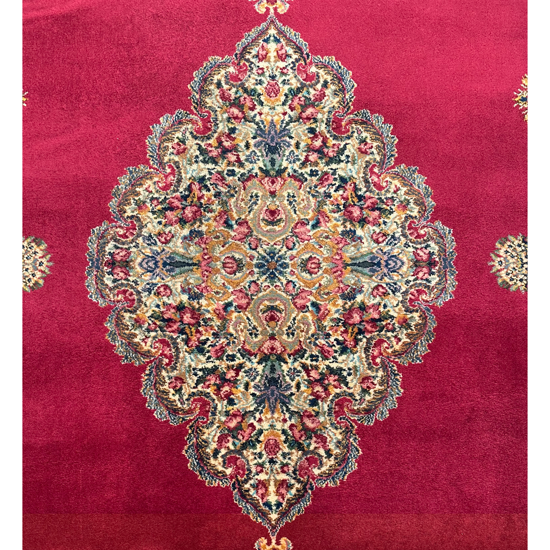 Elevate your traditional interior with the luxurious American craftsmanship of this antique 8’8″ x 12′ ft. Karastan rug. Machine-woven in the 1940s using premium worsted wool, this piece perfectly emulates the intricate beauty of classic Persian Kirman weavings. The design features a lush, open field in a vibrant shade of raspberry red or deep rose, which allows the central medallion to take center stage. This elaborate, multi-lobed medallion is rendered in detailed shades of ivory, indigo, and soft gold, and is surrounded by smaller floral pendants. The corners are framed by complex, scrolling spandrels filled with floral arabesques that mirror the central motif. Known for their durability and heavy, dense pile, this vintage Karastan offers the sophisticated look of an oriental rug with a distinct history of American quality, making it a timeless addition to a formal dining room or living area.