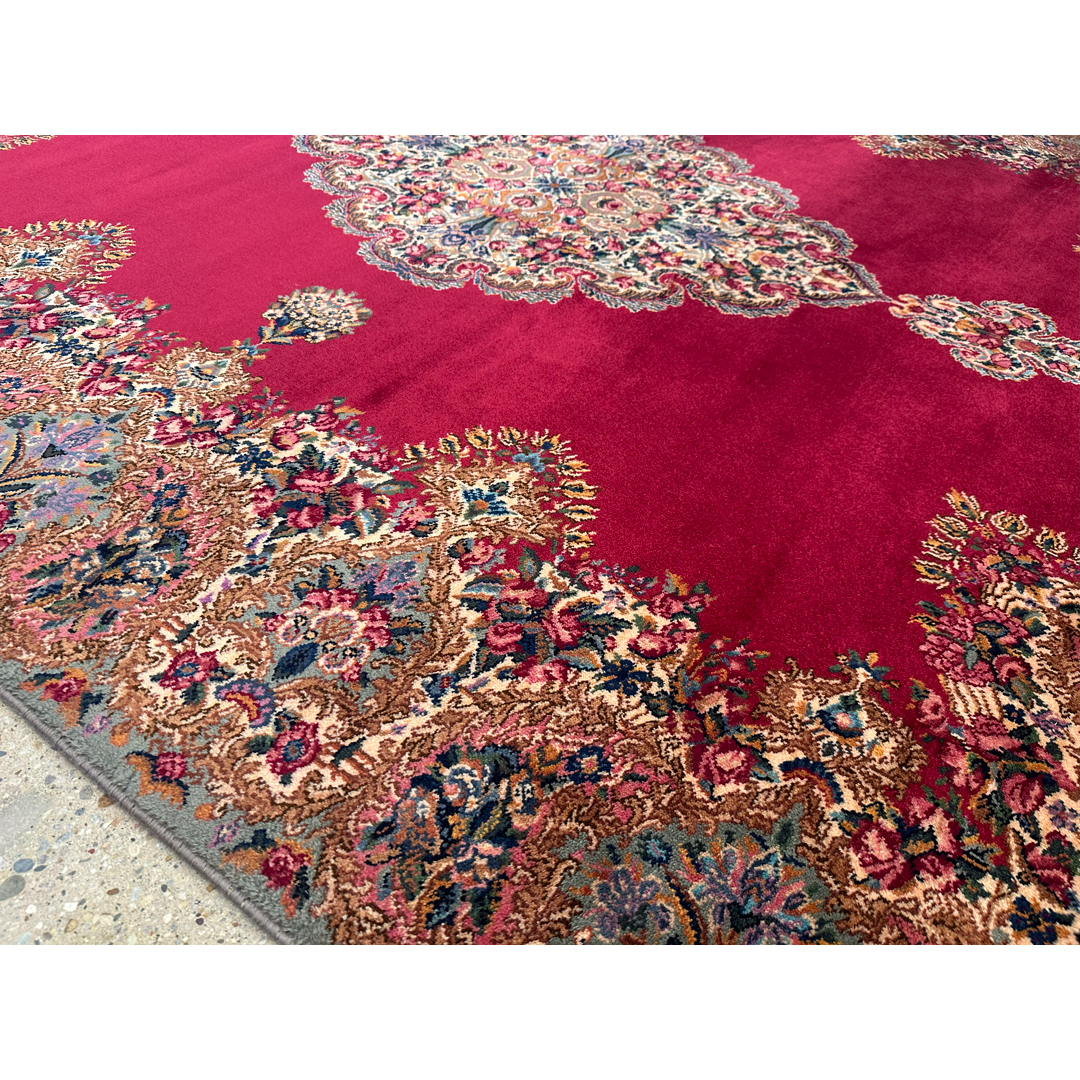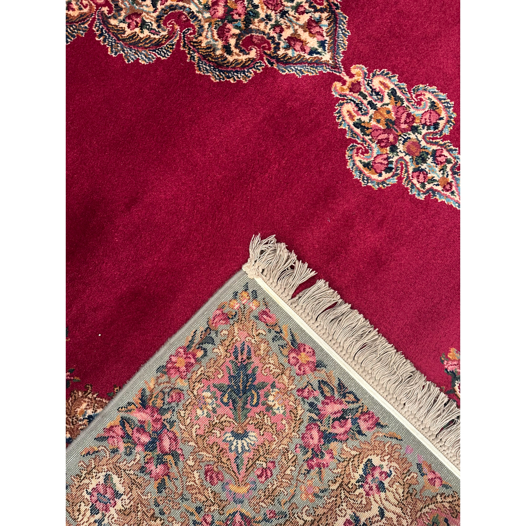 Elevate your traditional interior with the luxurious American craftsmanship of this antique 8’8″ x 12′ ft. Karastan rug. Machine-woven in the 1940s using premium worsted wool, this piece perfectly emulates the intricate beauty of classic Persian Kirman weavings. The design features a lush, open field in a vibrant shade of raspberry red or deep rose, which allows the central medallion to take center stage. This elaborate, multi-lobed medallion is rendered in detailed shades of ivory, indigo, and soft gold, and is surrounded by smaller floral pendants. The corners are framed by complex, scrolling spandrels filled with floral arabesques that mirror the central motif. Known for their durability and heavy, dense pile, this vintage Karastan offers the sophisticated look of an oriental rug with a distinct history of American quality, making it a timeless addition to a formal dining room or living area.