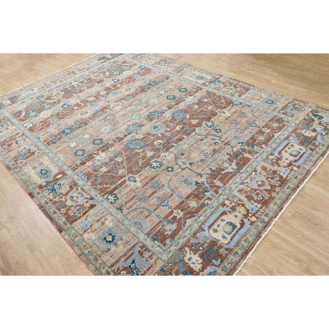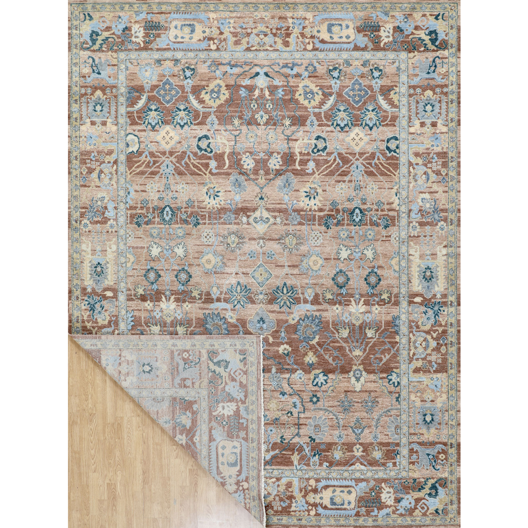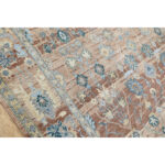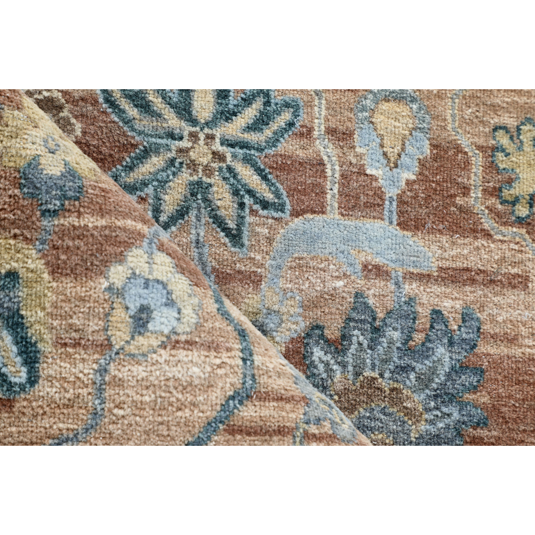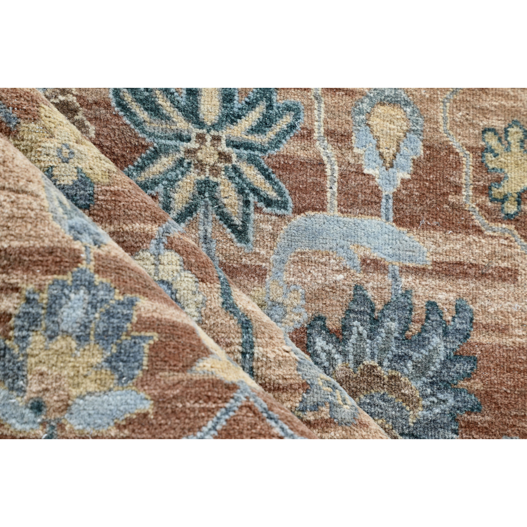 This breathtaking hand-knotted rug from India offers a masterful fusion of classical elegance and contemporary color theory. The composition features a grand, sweeping network of oversized floral palmettes, delicate rosettes, and scrolling botanical vines. What makes this piece truly spectacular is its color palette: the classic motifs are rendered in striking shades of vibrant teal, soft aqua, and slate blue, which pop brilliantly against a warm, highly textural field of heathered copper and soft terracotta. The rug has been woven with a pronounced horizontal “abrash” or strie effect, lending the piece a tactile, painterly depth that feels both history-rich and incredibly modern.