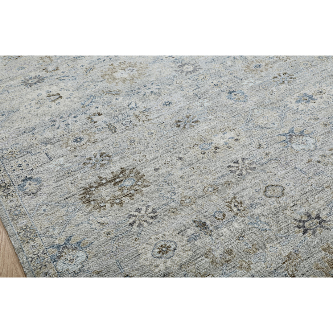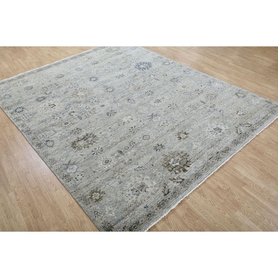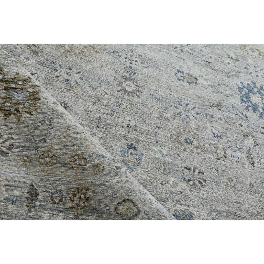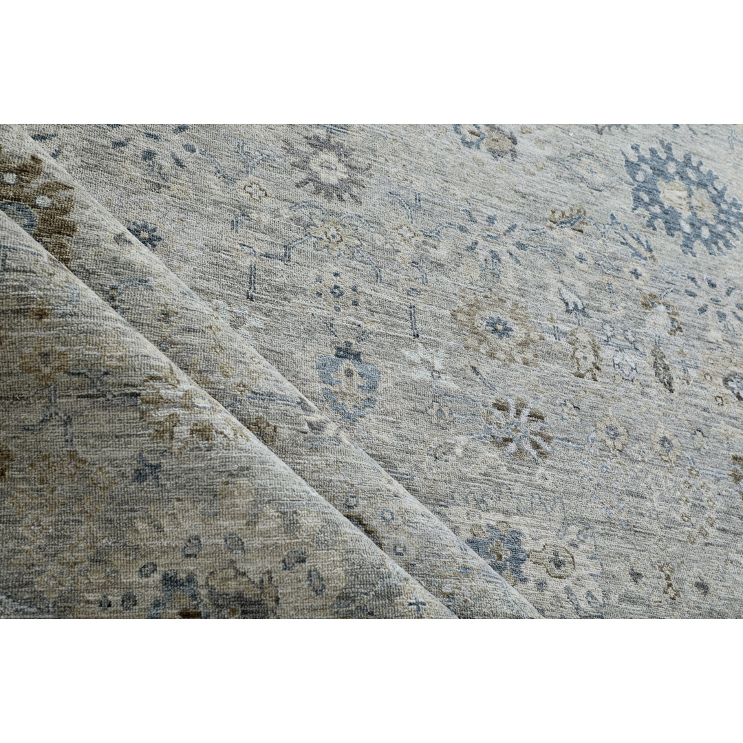 Introduce a touch of serene elegance with this exquisite Transitional Turkish Oushak design rug from our Legacy Collection. Measuring a perfect 9′ x 12’1″ ft., this 9×12 area rug showcases a beautiful all-over pattern of subtle, stylized floral and geometric motifs, offering a fresh take on a timeless design. The luminous champagne field provides a sophisticated neutral backdrop, allowing delicate accents of muted blues and soft browns to emerge, adding depth and visual interest without overwhelming the space. Framed by a complementary intricate border, this rug creates a cohesive and inviting atmosphere. Hand-knotted with a plush, resilient pile, it is the ideal foundation for a contemporary living room, an elegant dining area, or a tranquil master bedroom, effortlessly blending traditional artistry with modern sensibilities.